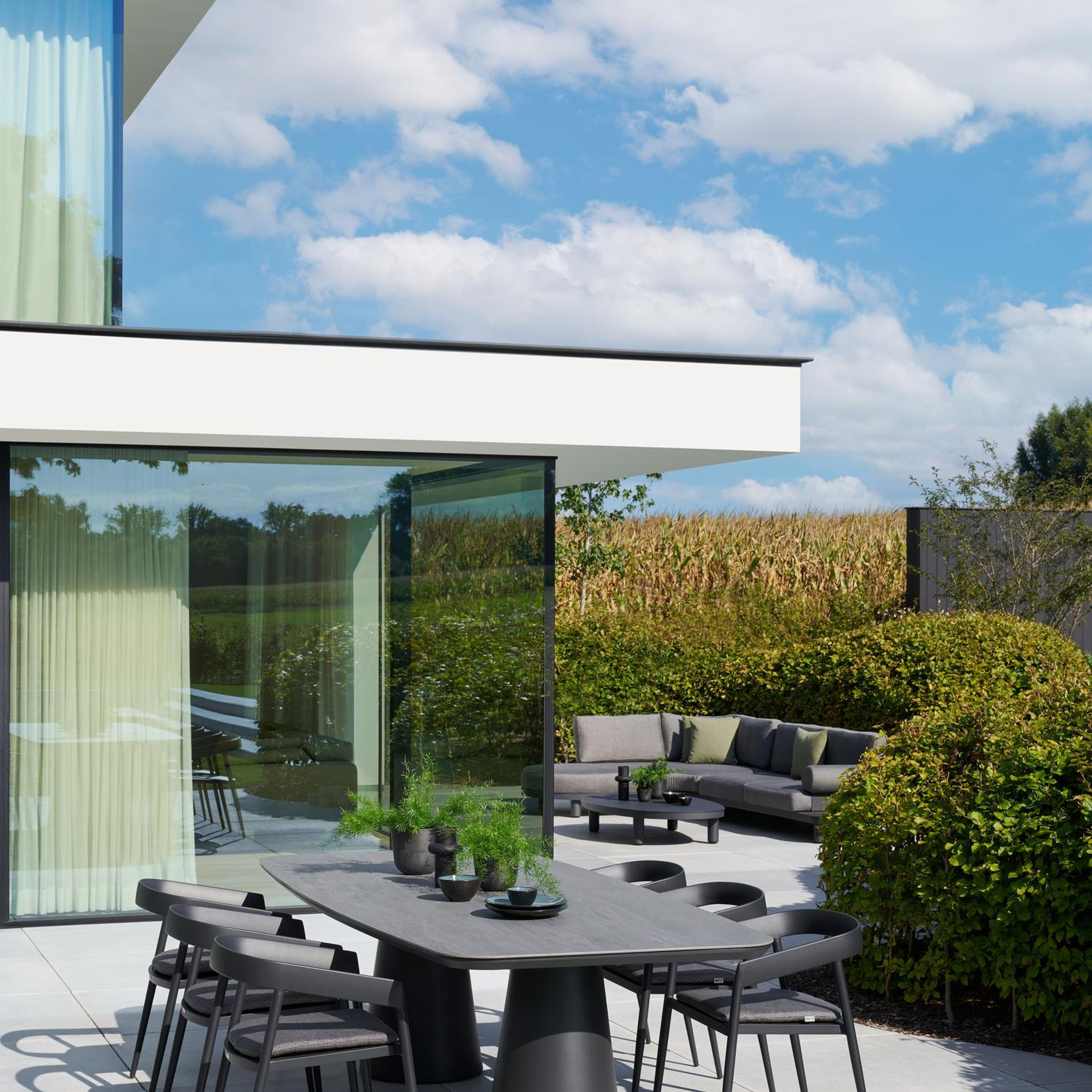 Donato omarmt de natuur met vloeiende vormen, warm teak en stijlvol aluminium in wit, zwart of beige. Een ontwerp dat rust uitstraalt, karakter toevoegt en natuurlijke elegantie naar je tuin brengt.