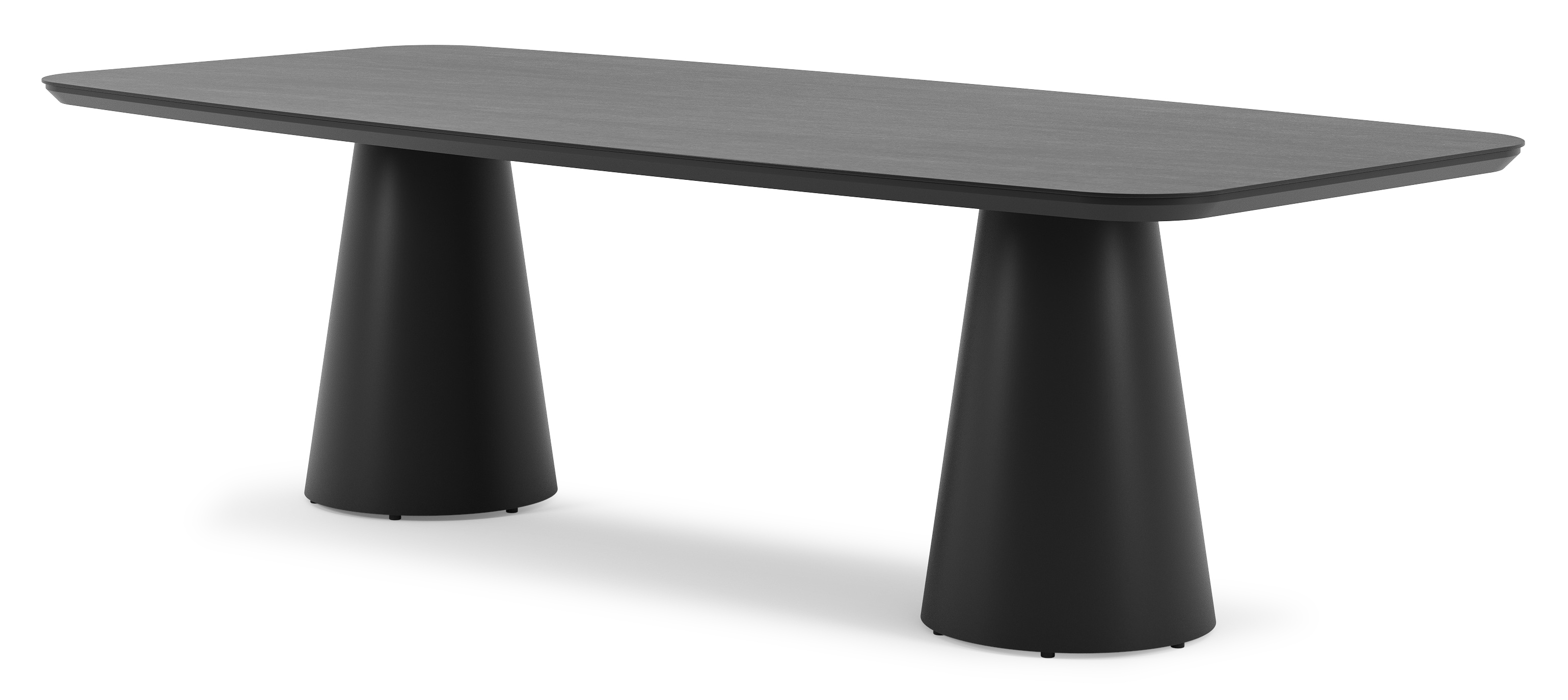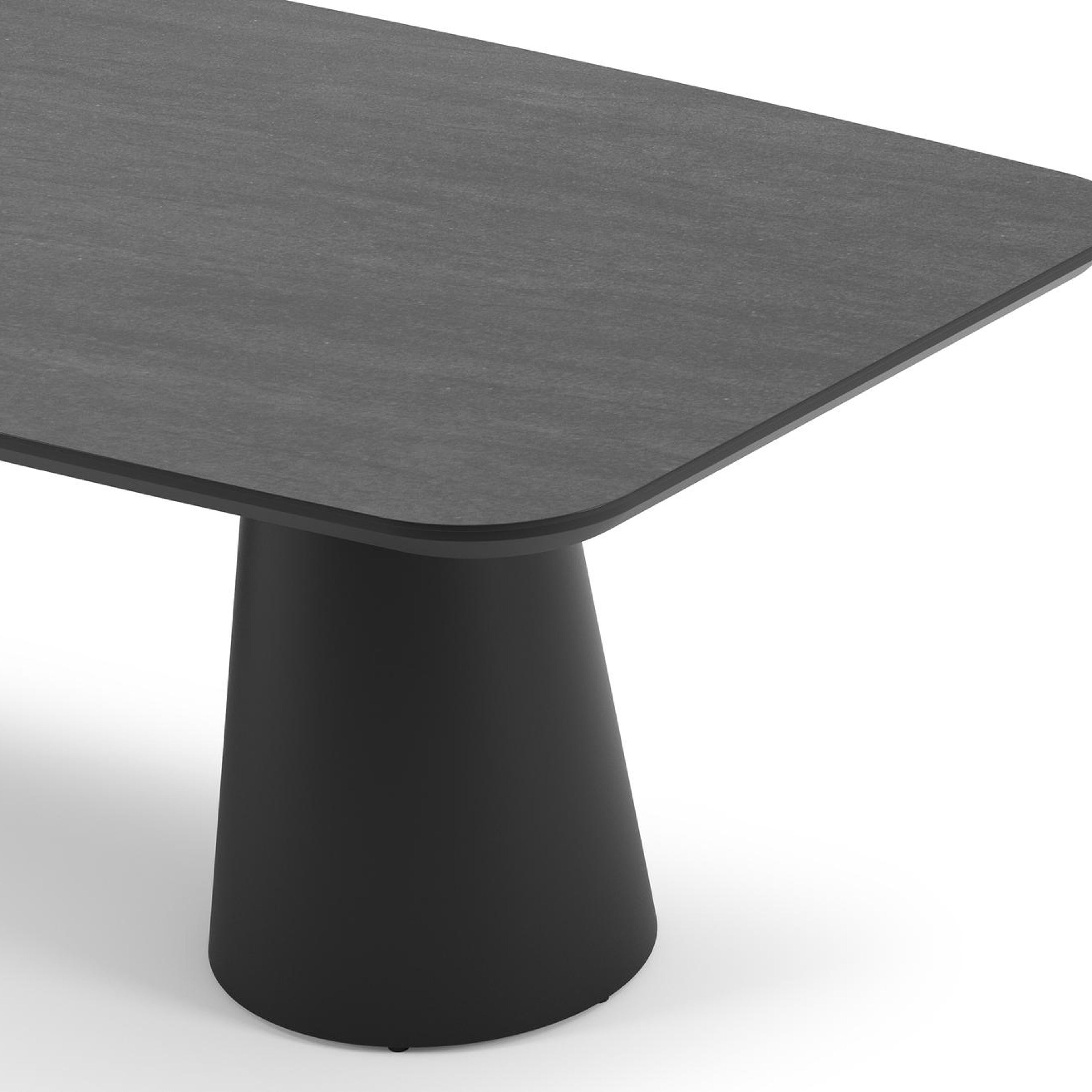 De Donato tuintafel omarmt elegantie in de buitenlucht met robuuste speelse vormen. Met een conische poot volledig gemaakt uit aluminium en een afgerond tafelblad, creëert deze tafel een harmonieuze samensmelting van een hedendaags design en een robuuste look.