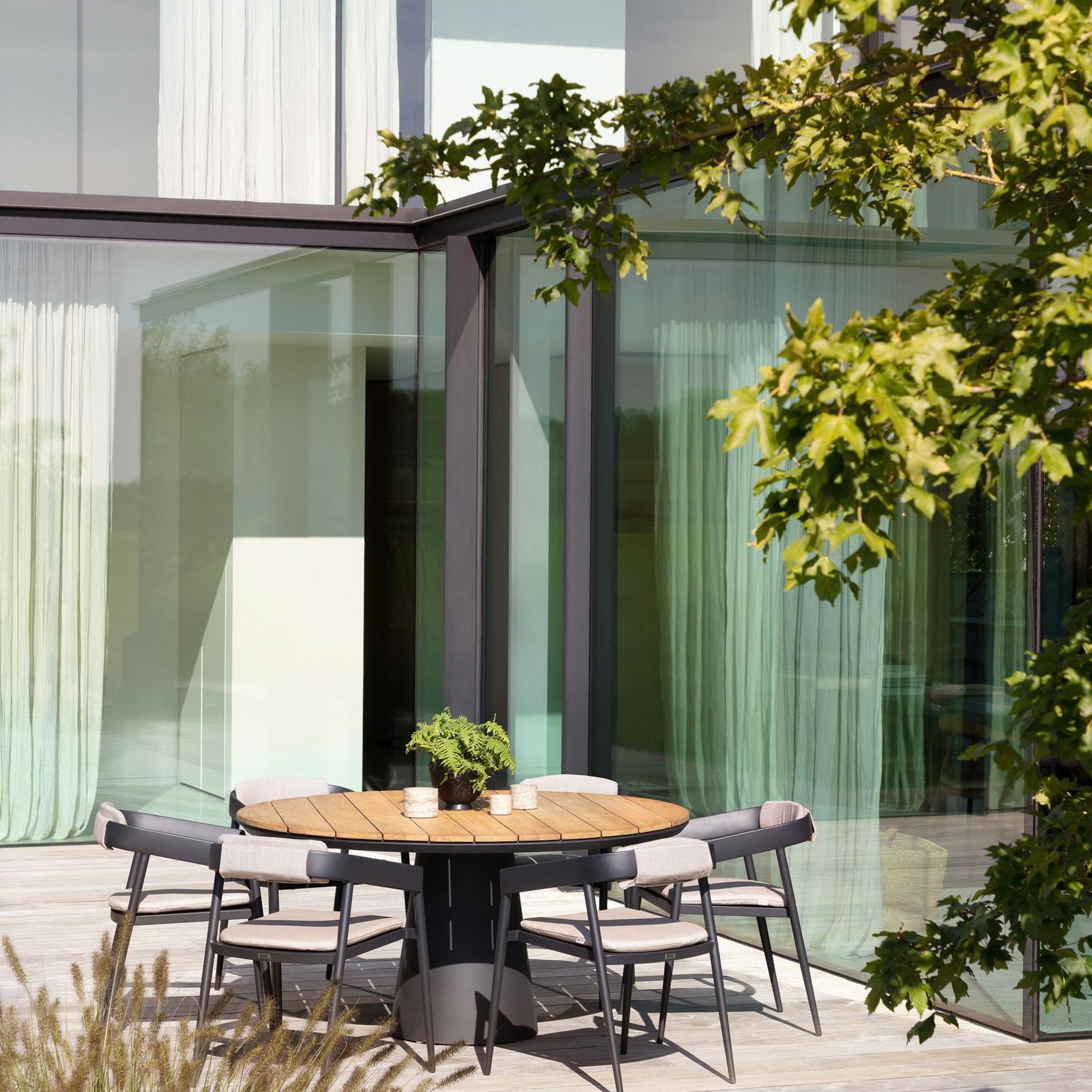 Donato omarmt de natuur met vloeiende vormen, warm teak en stijlvol aluminium in wit, zwart of beige. Een ontwerp dat rust uitstraalt, karakter toevoegt en natuurlijke elegantie naar je tuin brengt.