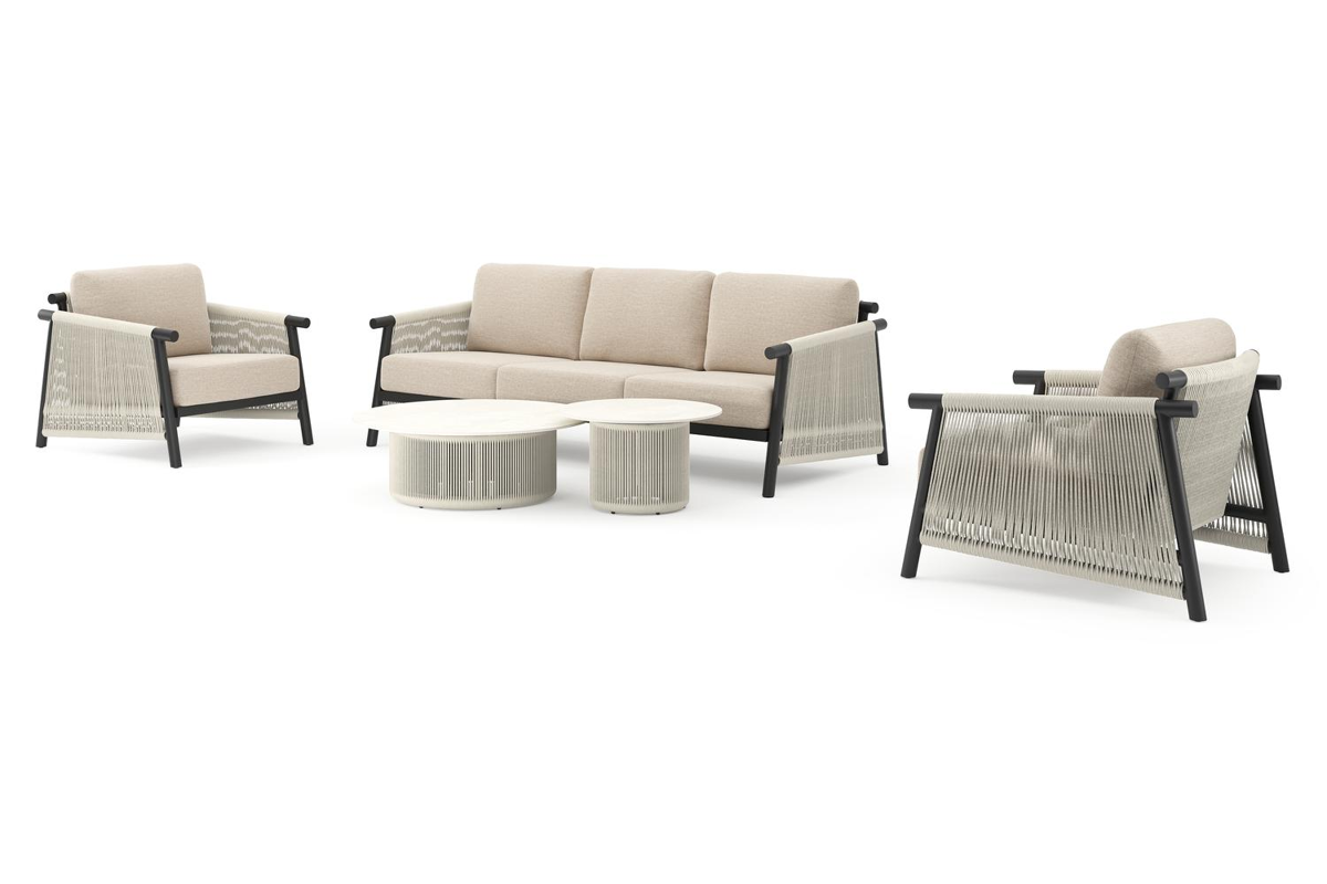 Erla loungeset in zwart aluminium met rustic weather+ softtouch kussens en loungetafel | Exterioo