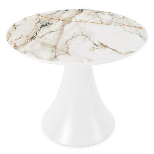 De Fano loungetafel onderscheidt zich door zijn trendy ronde tafel met de kenmerkende trompetpoot. Deze tafel is afgewerkt met een Calacatta Luxe tafelblad. Calacatta Luxe is een echte eyecatcher met luxueuze uitstraling. De basis van het blad is wit, maar toont intense contrasten en kleurschakeringen voor een verbluffend effect. Het is afgewerkt met grijze en goudgele aders voor een prachtige marmerlook.
