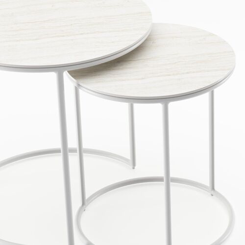 Maak van jouw tuin een oase van stijl en comfort met onze set van twee Fano bijzettafels. De loungetafels zijn ideaal om je drankjes op te zetten. Het aluminium frame is bestand tegen roest waardoor deze loungetafels perfect zijn voor alle seizoenen. Het tafelblad bestaat uit volkeramiek, een hoogwaardig materiaal dat bekend staat om zijn duurzaamheid en weerbestendigheid. Het is bestand tegen krassen, vlekken en verkleuring, waardoor het perfect is voor buitengebruik. Bovendien is volkeramiek eenvoudig te reinigen en te onderhouden.