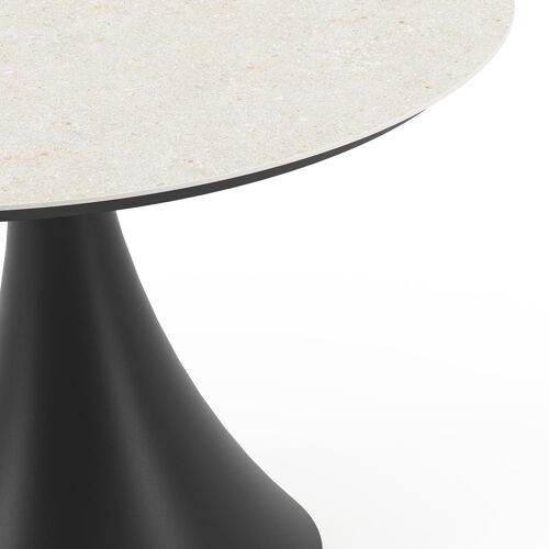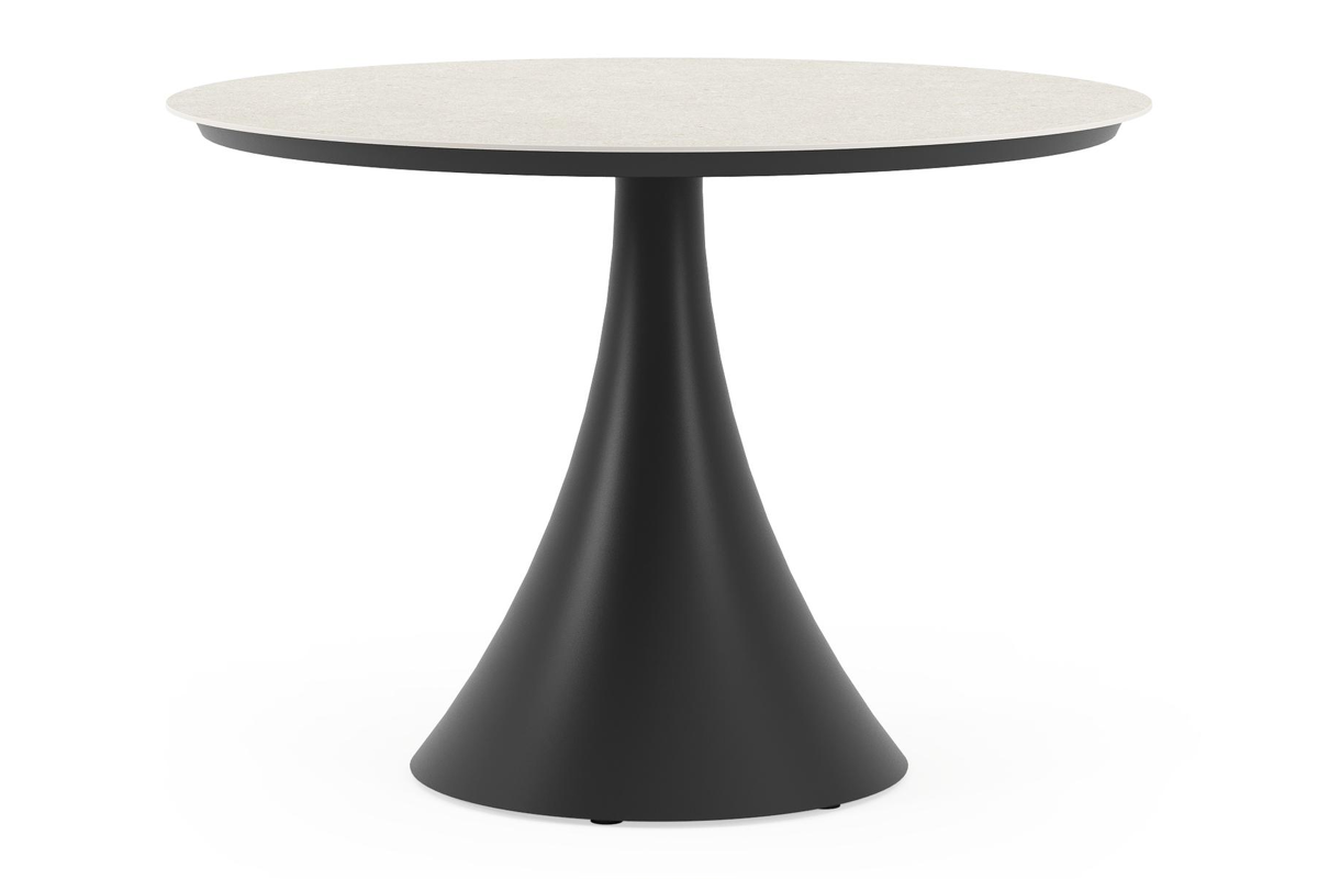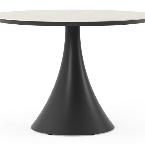 De ronde Fano tafel is een trendy tafel dankzij zijn typische trompetpoot. Bovendien heb je aan een ronde tafel een gezellige tafelbeleving omdat je tegenover elkaar kunt zitten. Het frame is gemaakt van aluminium een licht, maar sterk en roestvrij materiaal dat zeer geschikt is voor tuinmeubelen. Deze tafel is afgewerkt met een Shilin tafelblad. Dit is een nieuwkomer in ons assortiment. De aardse kleurschakeringen passen perfect aan bij onze nieuwe outdoortrends. In het tafelblad is er een licht reliëf te voelen, waardoor het Shilin blad de look & feel heeft van echte natuursteen. In het blad is een fijne glinster aanwezig. Het voordeel van volkeramische tafelbladen is dat ze krasbestendig zijn en bestand zijn tegen alle weersomstandigheden.