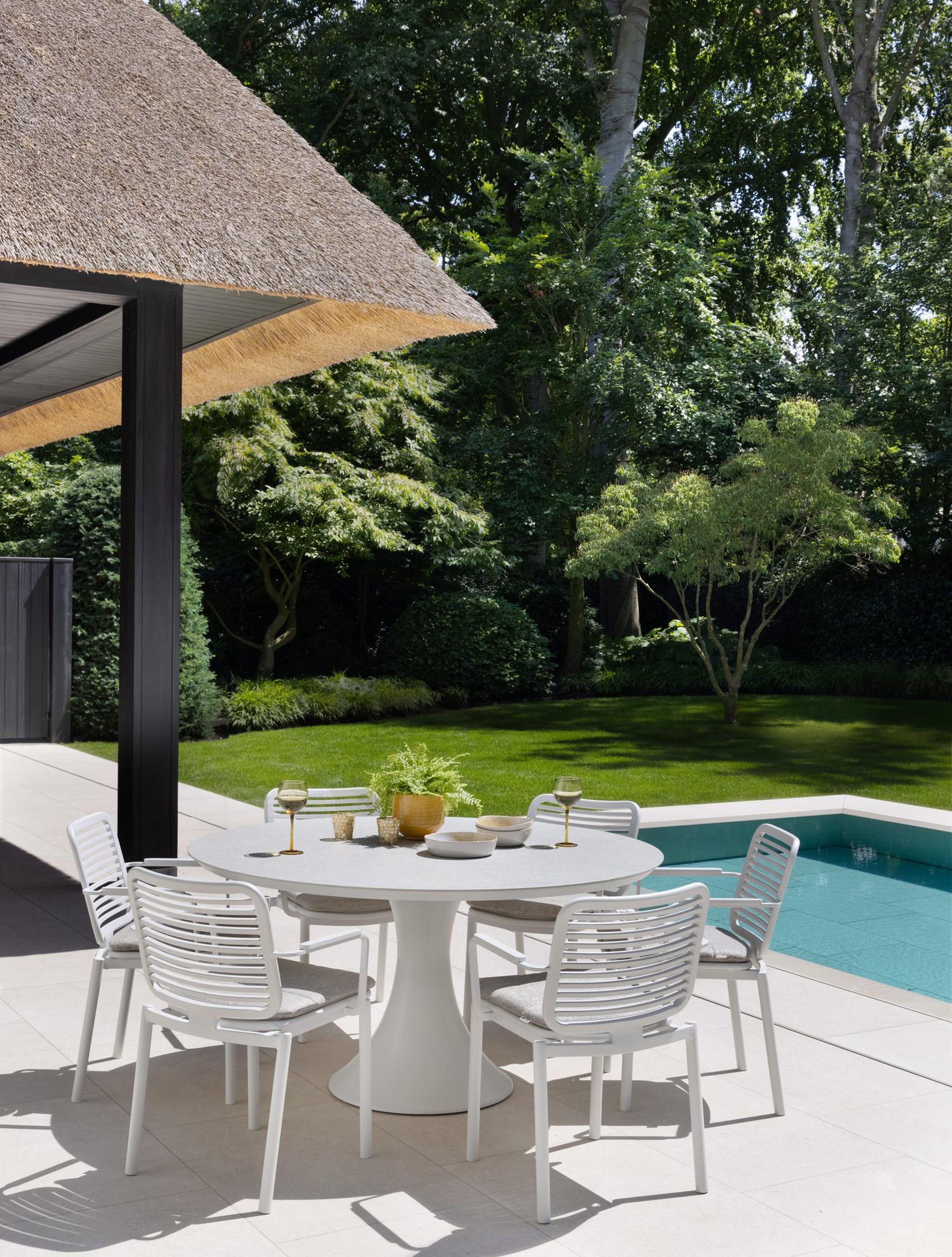 De Fano collectie onderscheidt zich door zijn trendy ronde tafel met de kenmerkende trompetpoot. Deze eigentijdse tafel biedt niet alleen een modieuze uitstraling, maar creëert ook een gezellige tafelbeleving, waarbij mensen tegenover elkaar kunnen zitten.