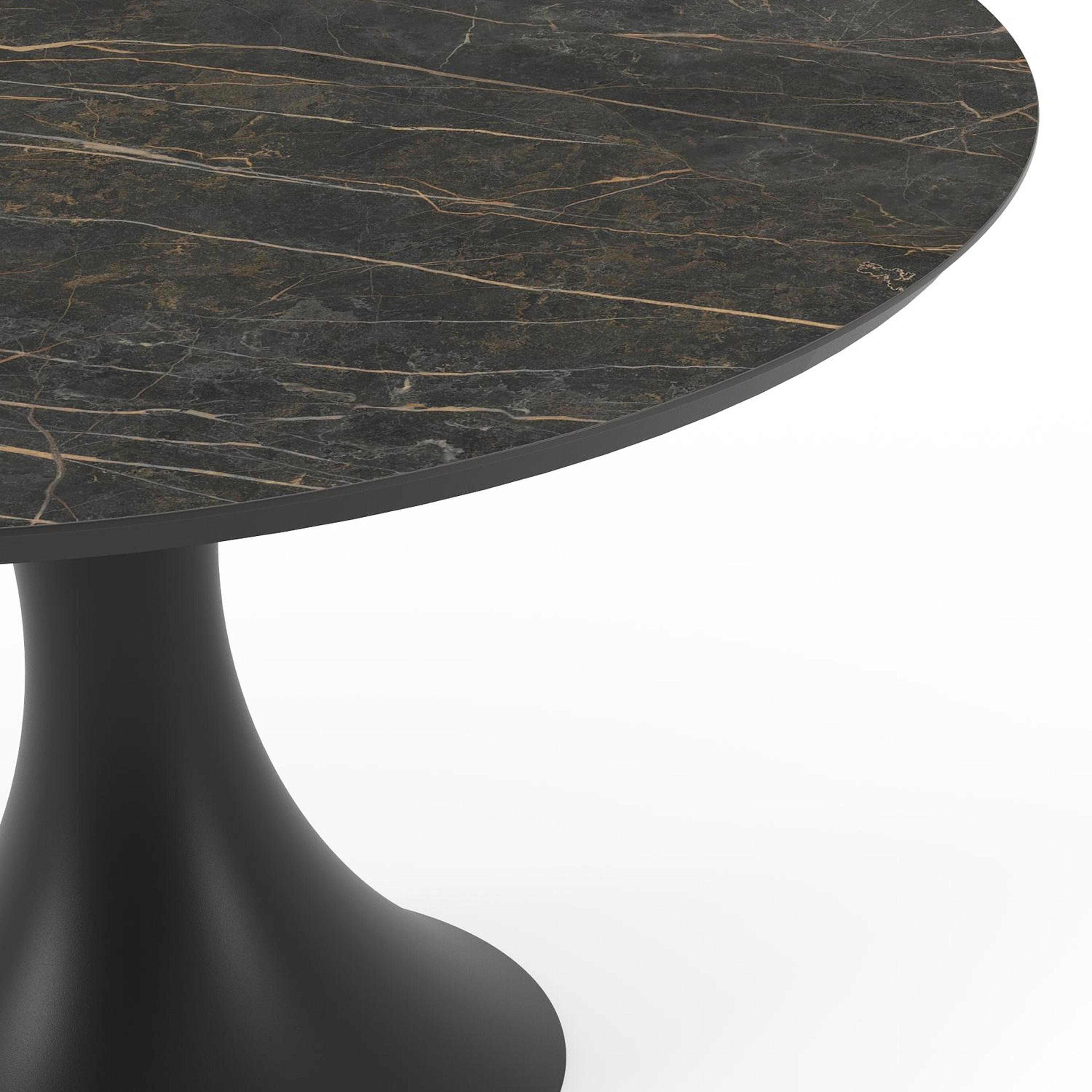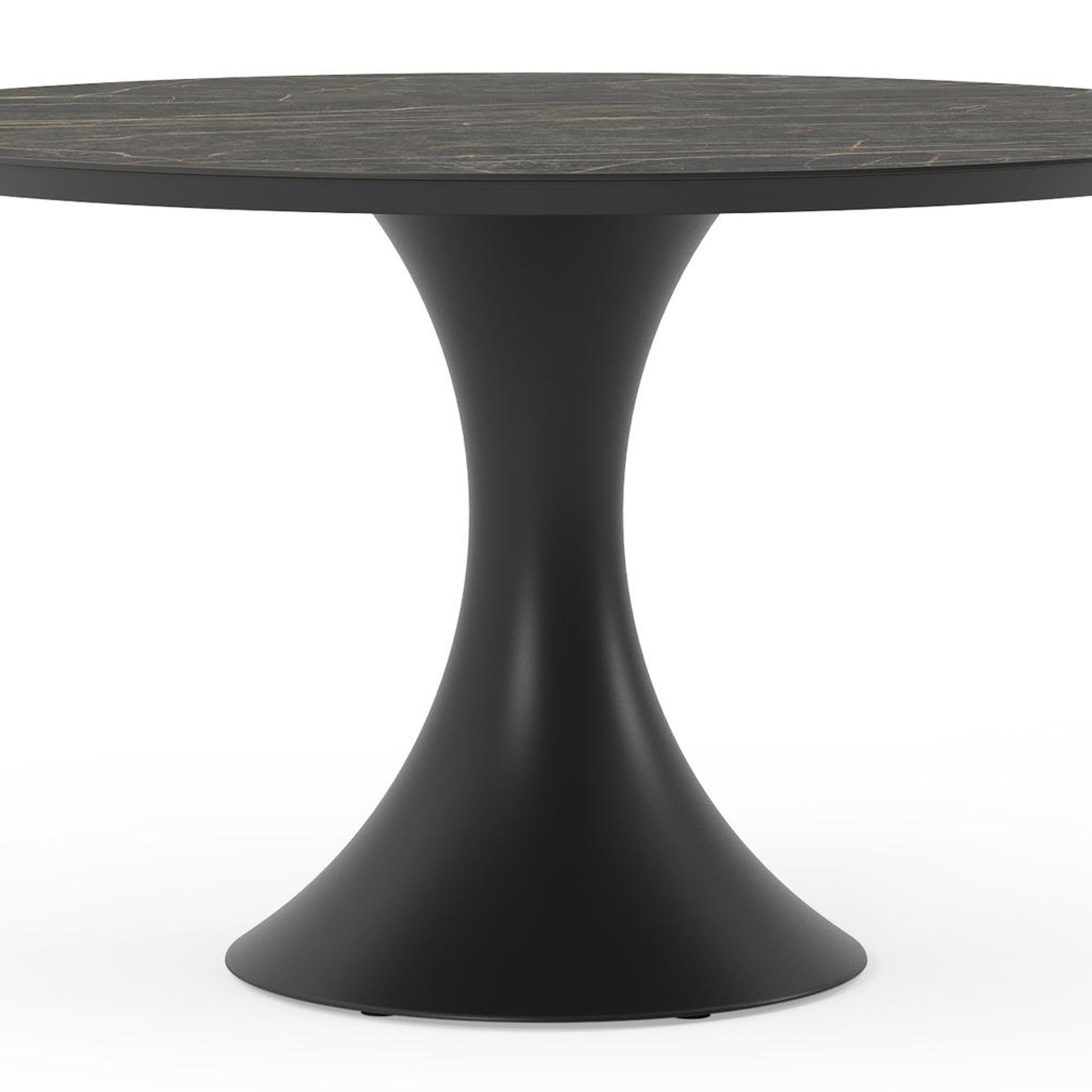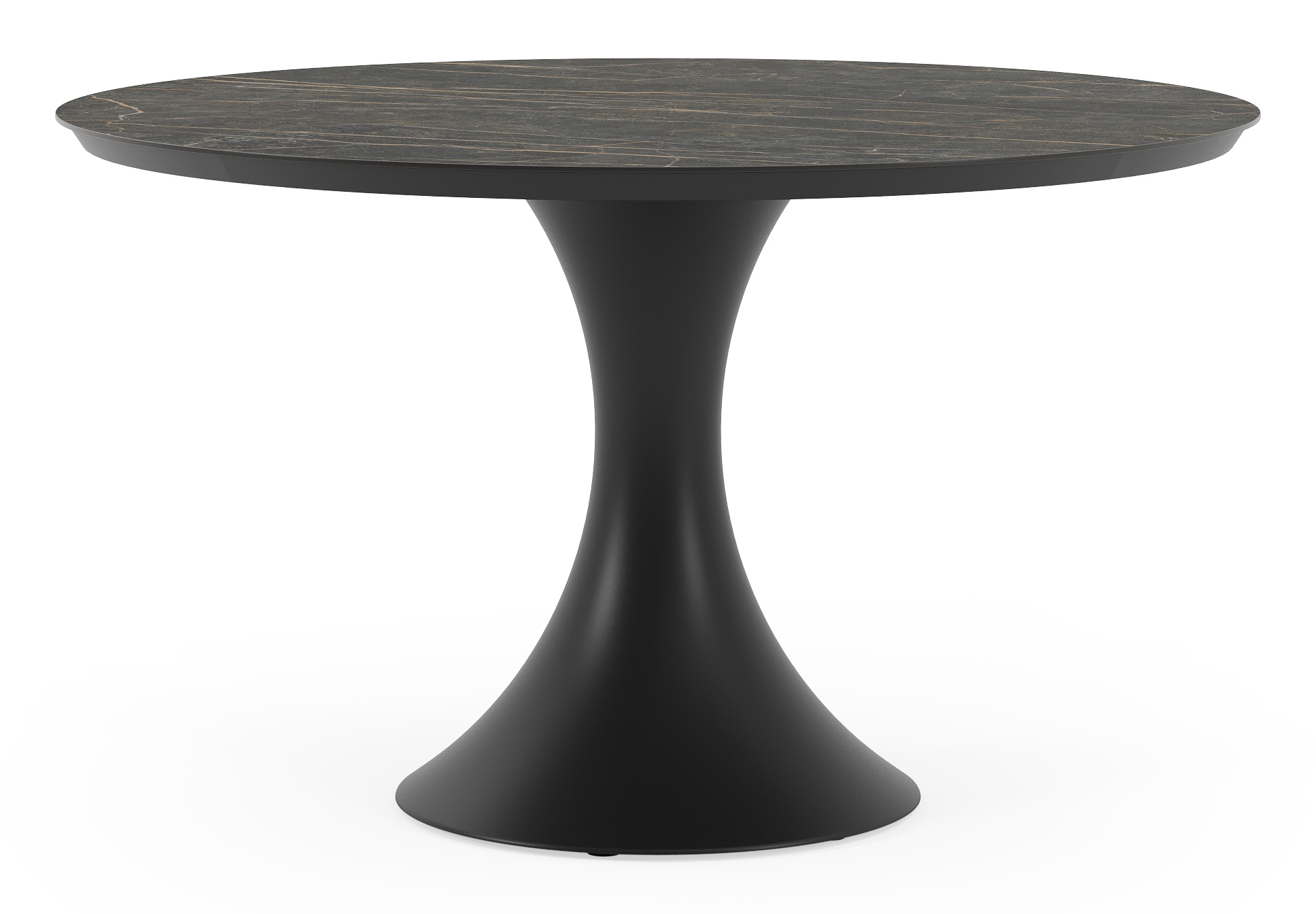 De ronde Fano tafel is een trendy tafel dankzij zijn typische trompetpoot. Bovendien heb je aan een ronde tafel een gezellige tafelbeleving omdat je tegenover elkaar kunt zitten. Het frame is gemaakt van aluminium een licht, maar sterk en roestvrij materiaal dat zeer geschikt is voor tuinmeubelen. Deze tafel is afgewerkt met een Black Obsession tafelblad. Een echte eyecatcher voor wie het graag iets luxueuzer heeft. De ondergrond van het blad is zwart maar is afgewerkt met een goudgele aders die een prachtige marmerlook creëren. Het voordeel van volkeramische tafelbladen is dat ze krasbestendig zijn en bestand zijn tegen alle weersomstandigheden.