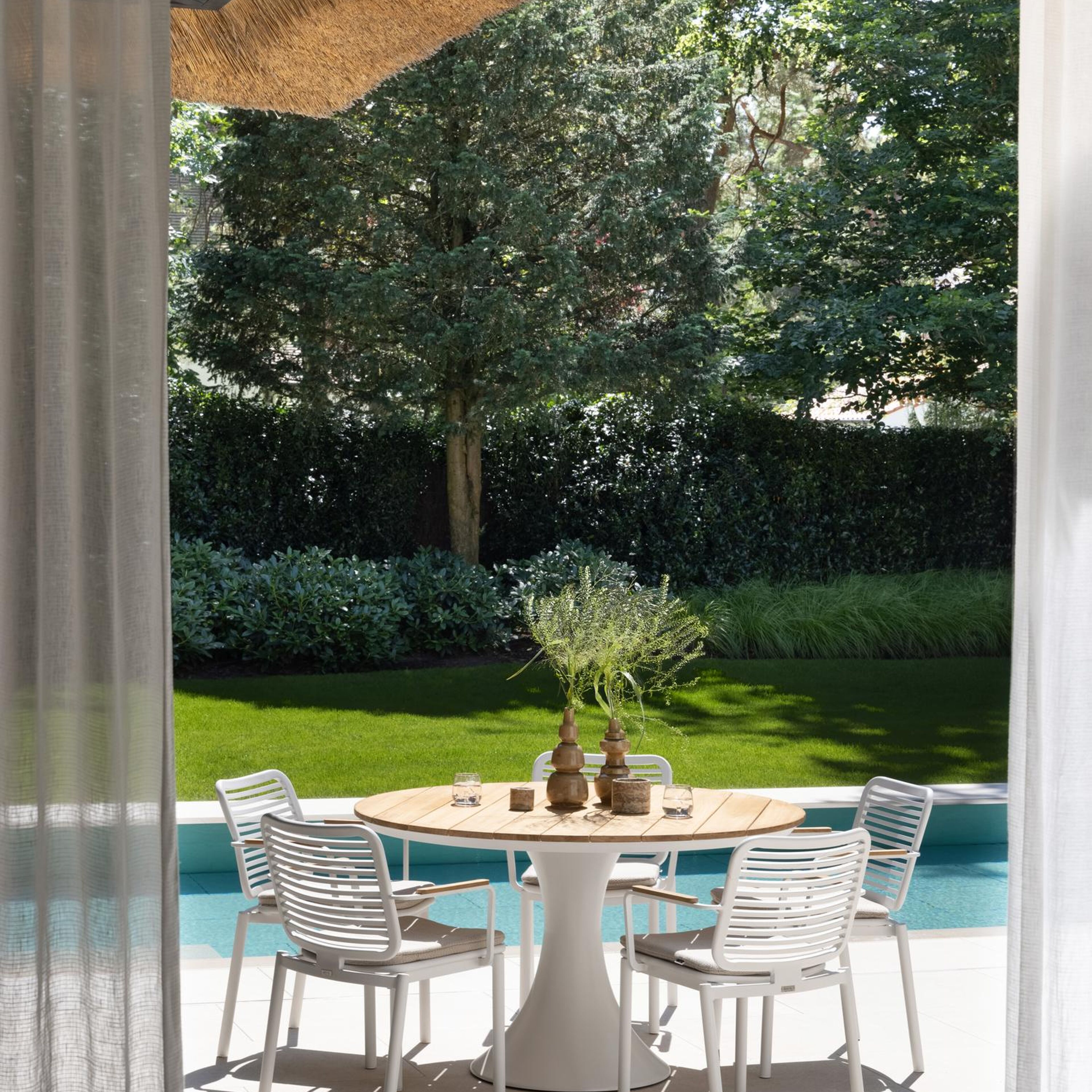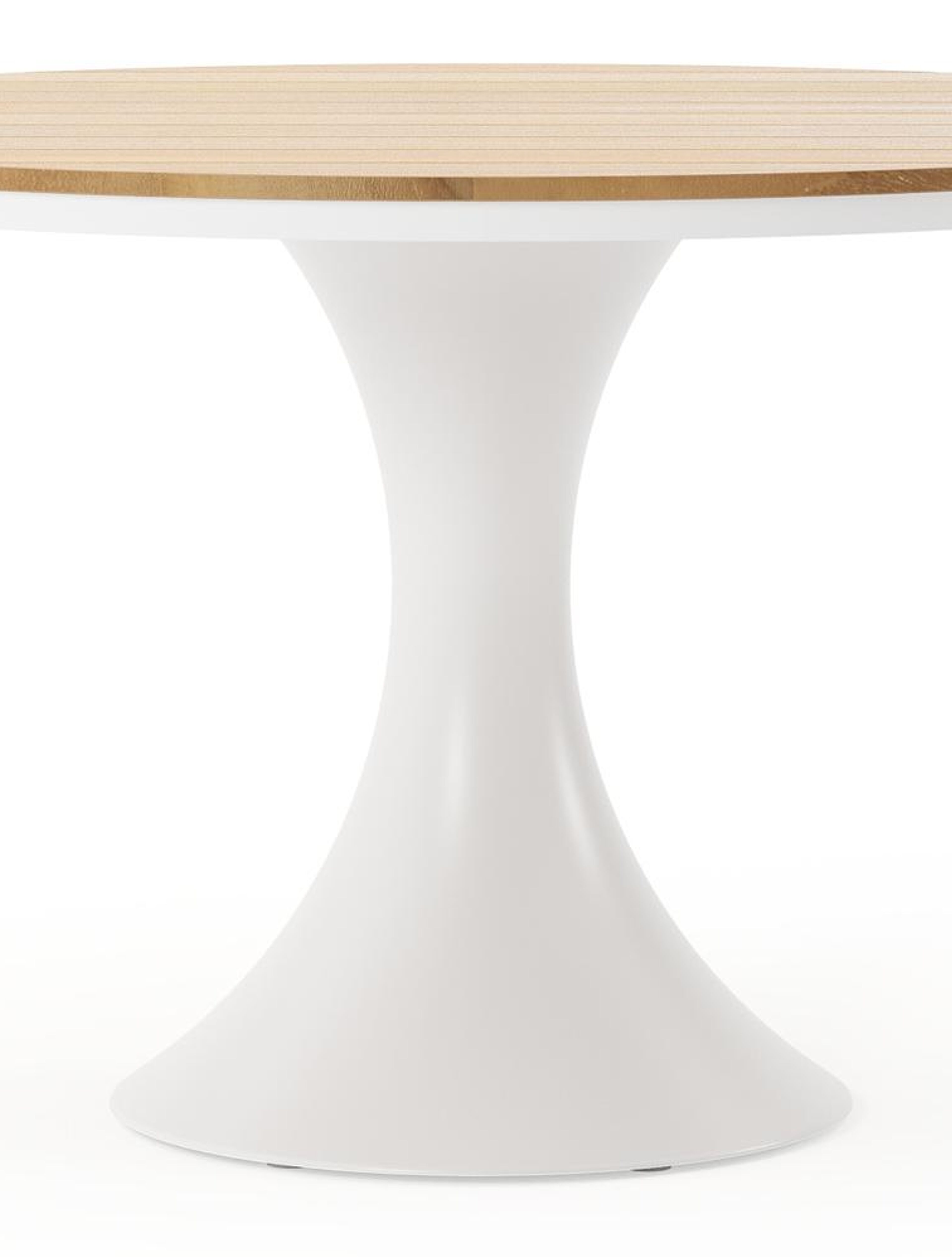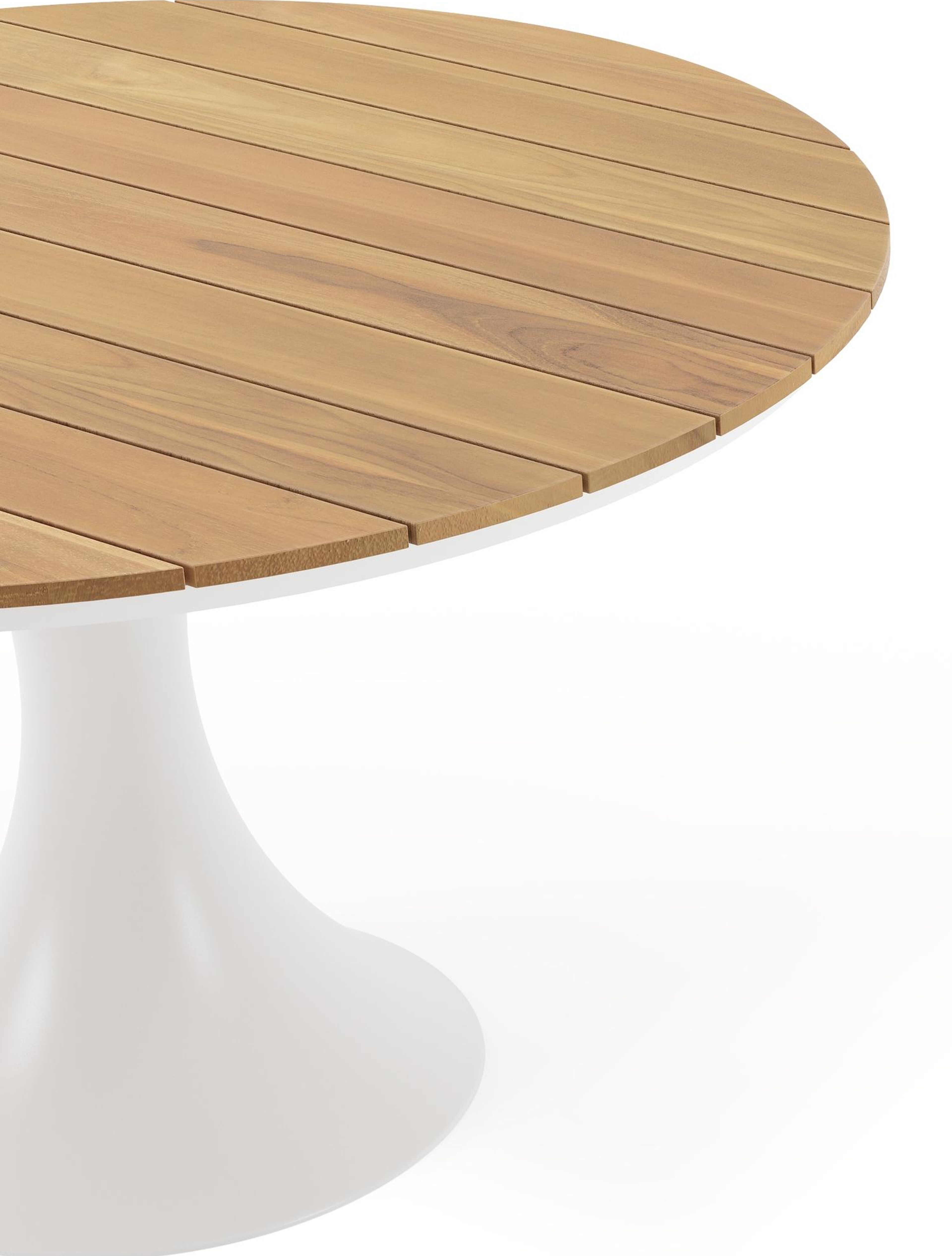 De ronde Fano tafel is een trendy tafel dankzij zijn typische trompetpoot. Bovendien heb je aan een ronde tafel een gezellige tafelbeleving omdat je tegenover elkaar kunt zitten. Het frame is gemaakt van aluminium een licht, maar sterk en roestvrij materiaal dat zeer geschikt is voor tuinmeubelen. Deze tafel is afgewerkt met een tafelblad in teak. Dit zorgt voor een warme en natuurlijke touch.