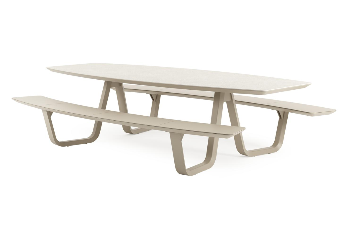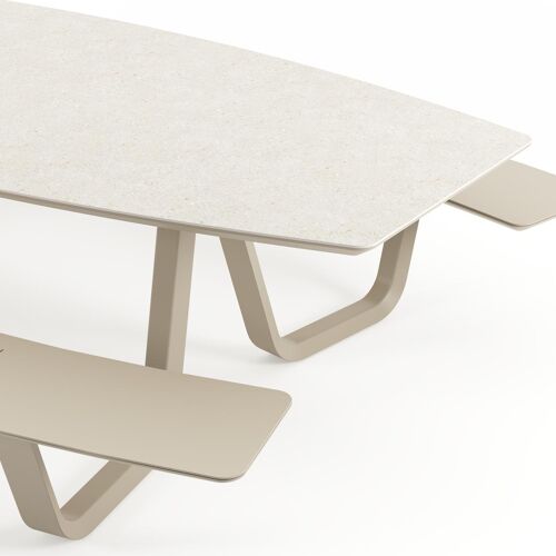 De Forno picknicktafel kenmerkt zich door zijn afgeronde vormen. Zowel het tafelblad als de banken hebben een bootvorm. De gebogen bank is makkelijk toegankelijk en voorziet plaats voor een groot gezelschap.