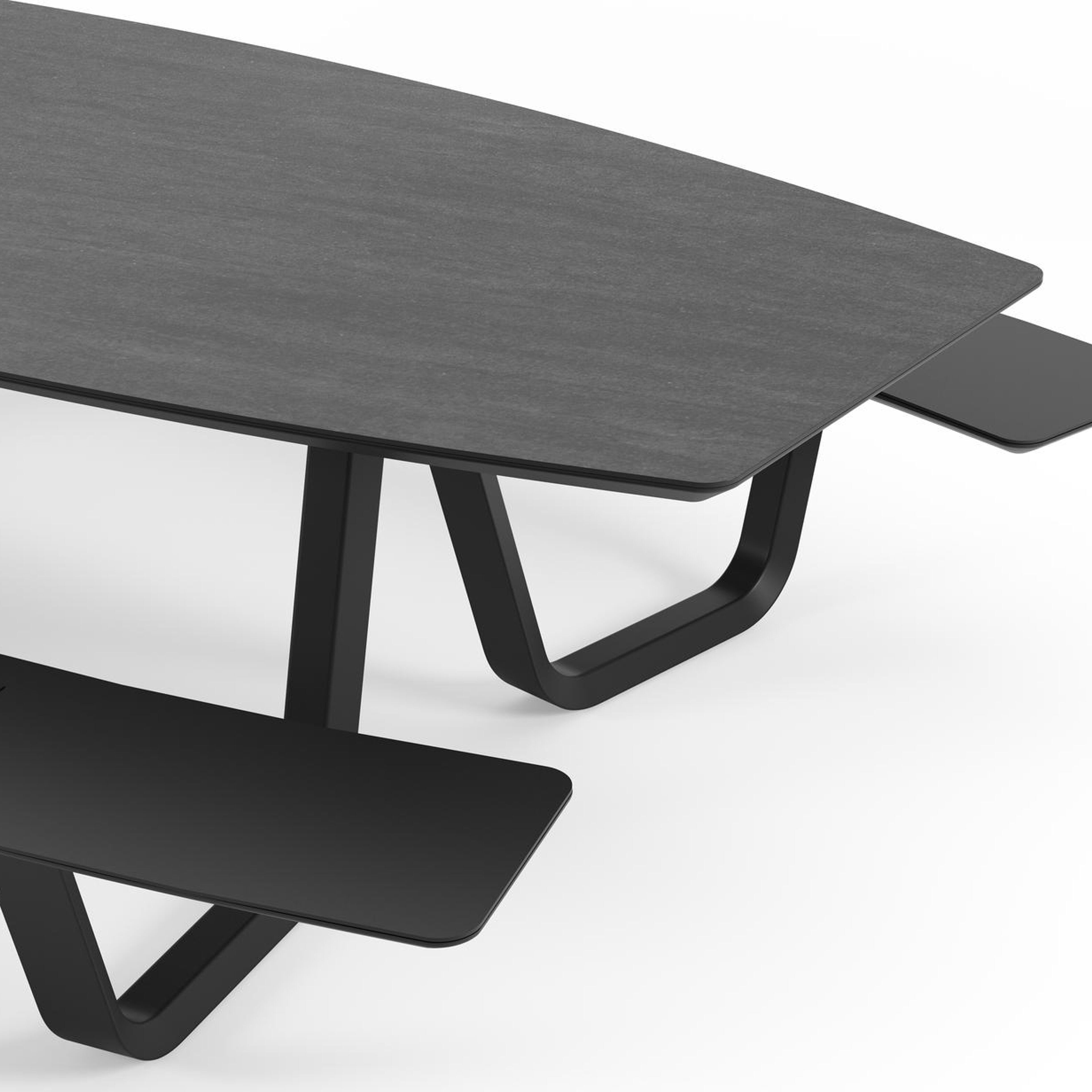 Basalt Black is geïnspireerd op de basaltsteen, een grijszwart vulkanisch stollingsgesteente. Kenmerkend voor dit tafelblad is de donkere kleur. In combinatie met zwarte tafelframes straalt dit rijk gedetailleerde model extra kracht uit.