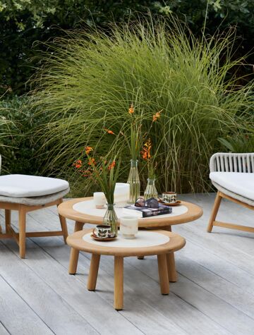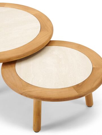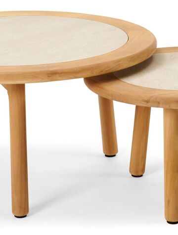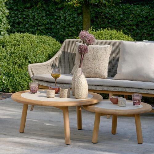 Deze set van twee Gardo loungetafels combineert natuurlijke elegantie met veelzijdigheid. Het teakhout wordt gecombineerd met een rustgevende beige tint. Bovendien kan je de twee tafeltjes ook afzonderlijk gebruiken.