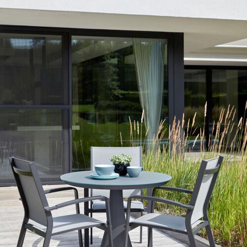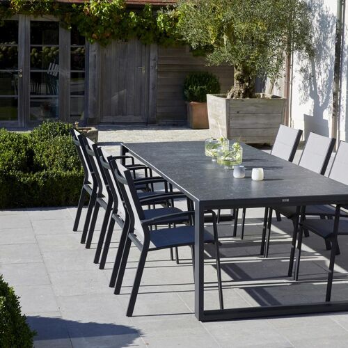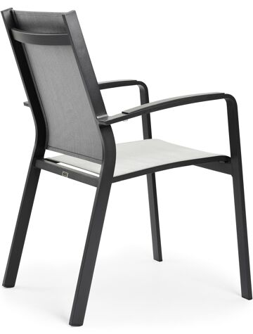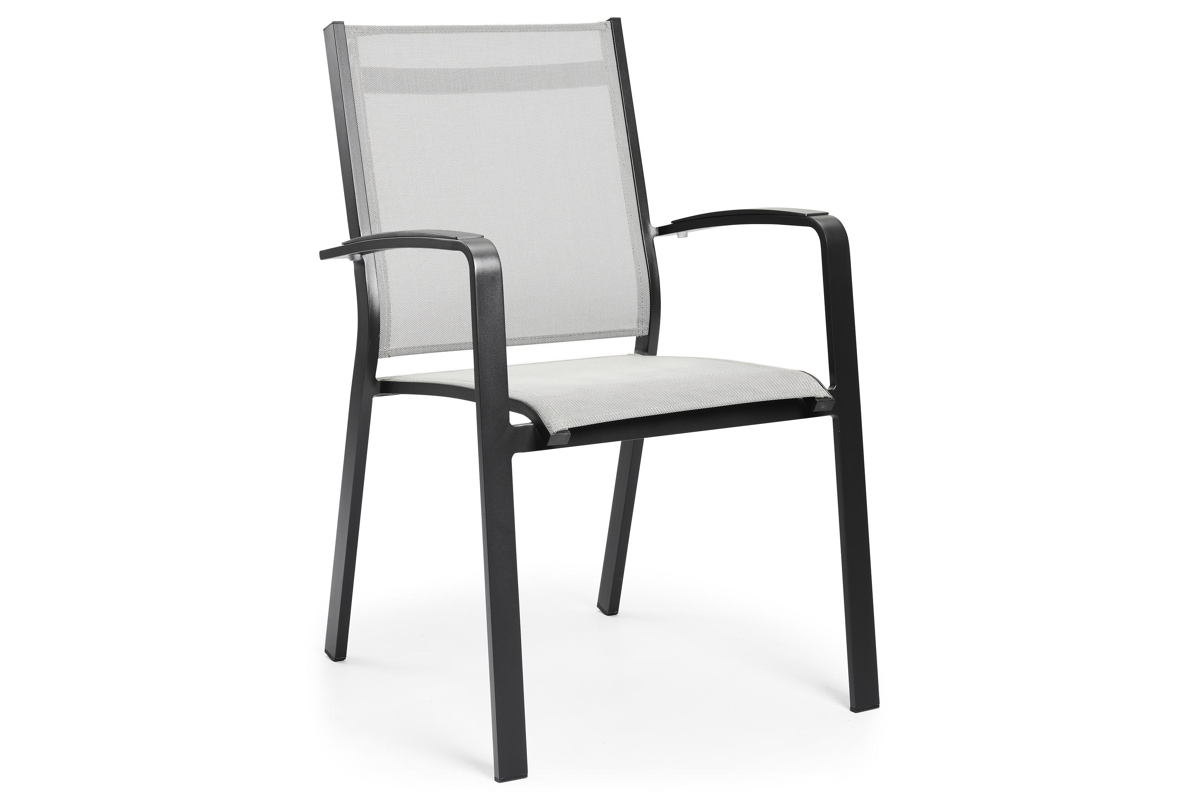 Lioni stapelbare tuinstoel in zwart aluminium en grijs textilene | Exterioo