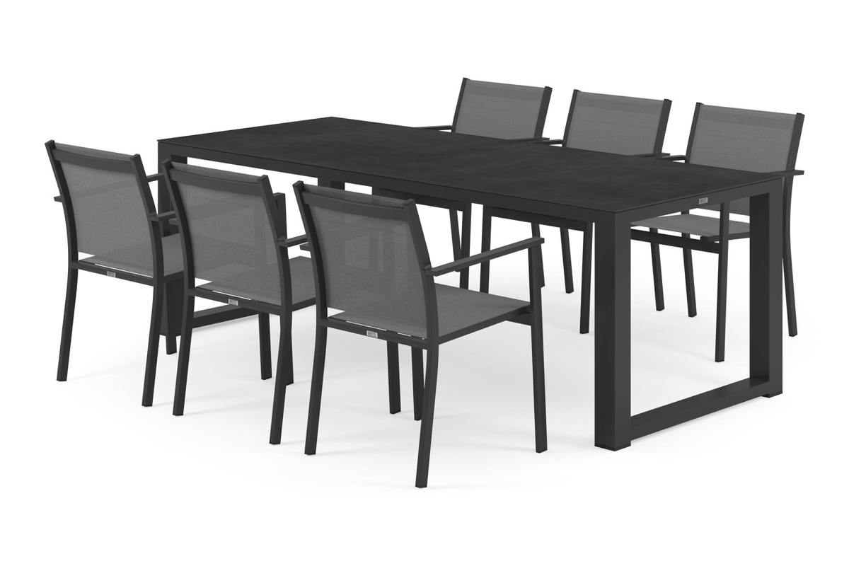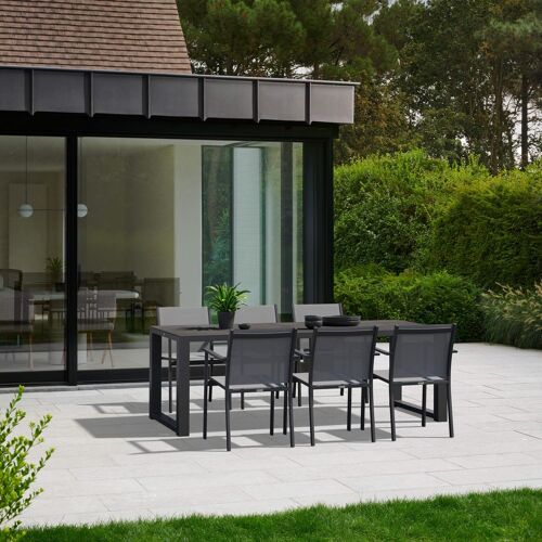 De Livo tuinset herken je onmiddellijk aan zijn kenmerkende, doorlopende tafelpoot aan weerszijden. Het levert zo een uniek design op en straalt stevigheid uit.