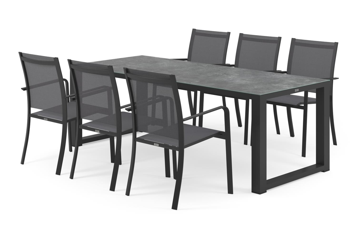 Livo tuinset herken je onmiddellijk aan zijn kenmerkende, doorlopende tafelpoot aan weerszijden. Het levert zo een uniek design op en straalt stevigheid uit. Het frame van de tafel is gemaakt uit roestvrij aluminium, een sterk, maar toch licht materiaal dat makkelijk verplaatsbaar is. Het oppervlak is glad afgewerkt waardoor het geen vuil aantrekt en onderhoudsvriendelijk is. De poedercoating zorgt voor de UV- en weerbestendigheid van je meubel.