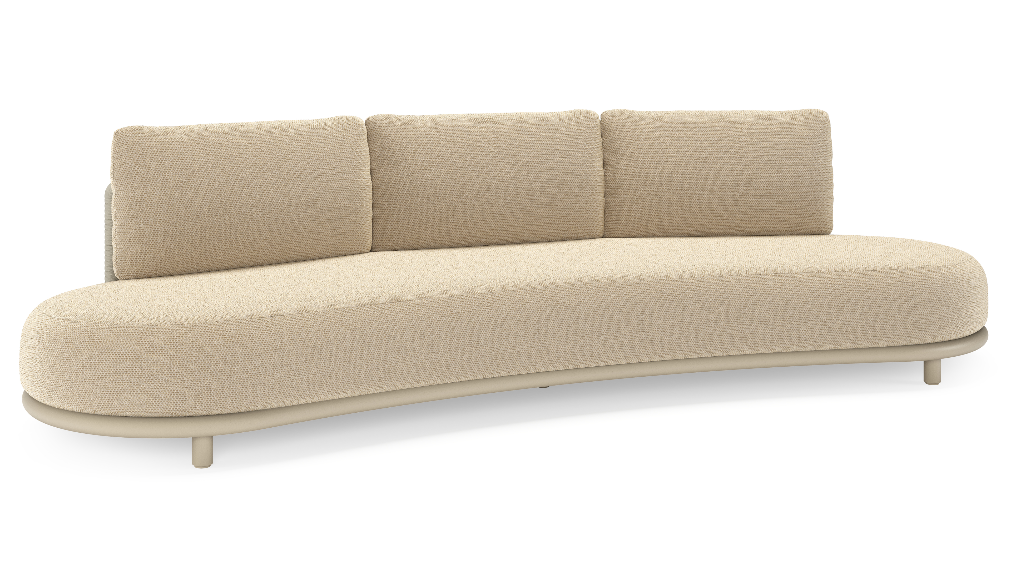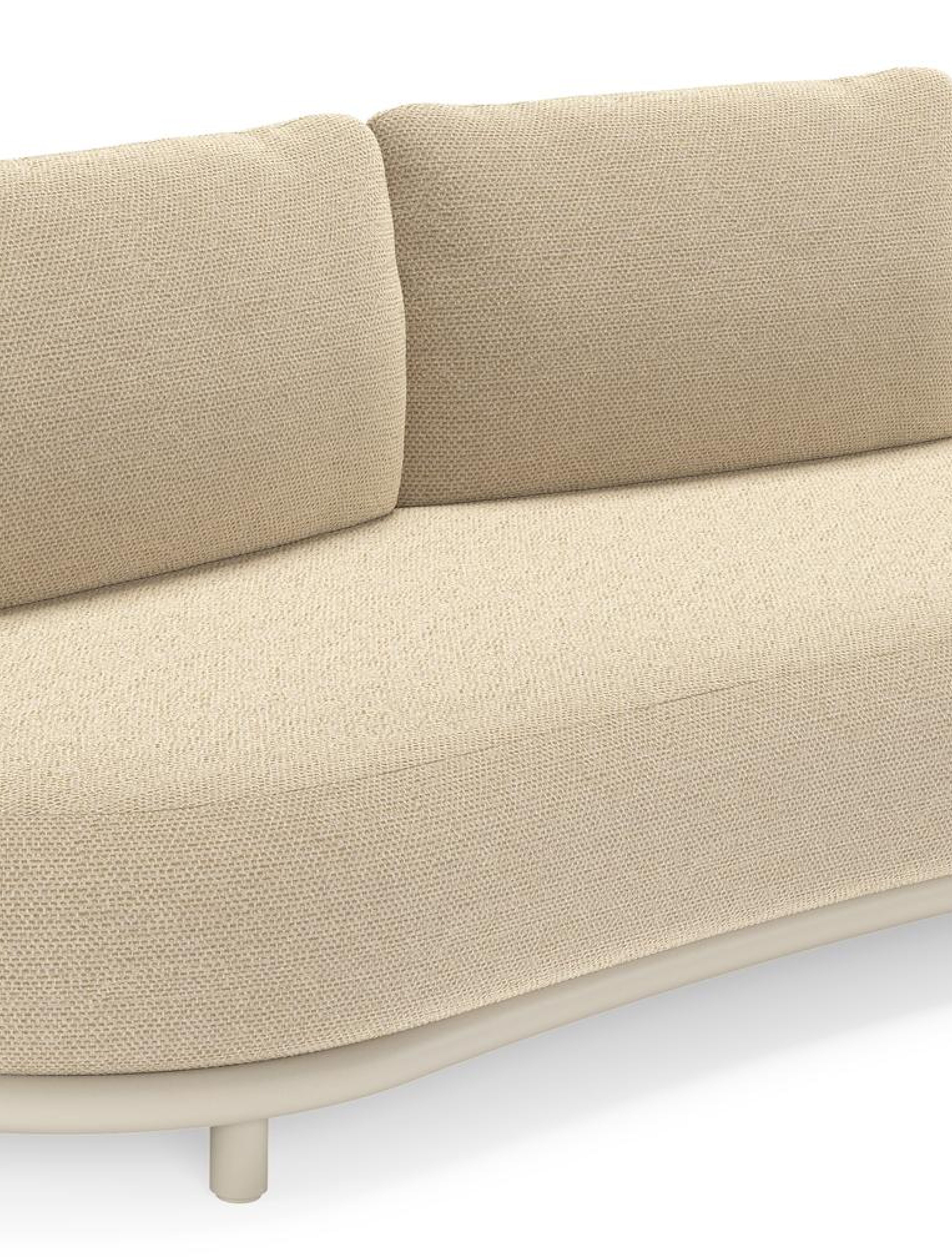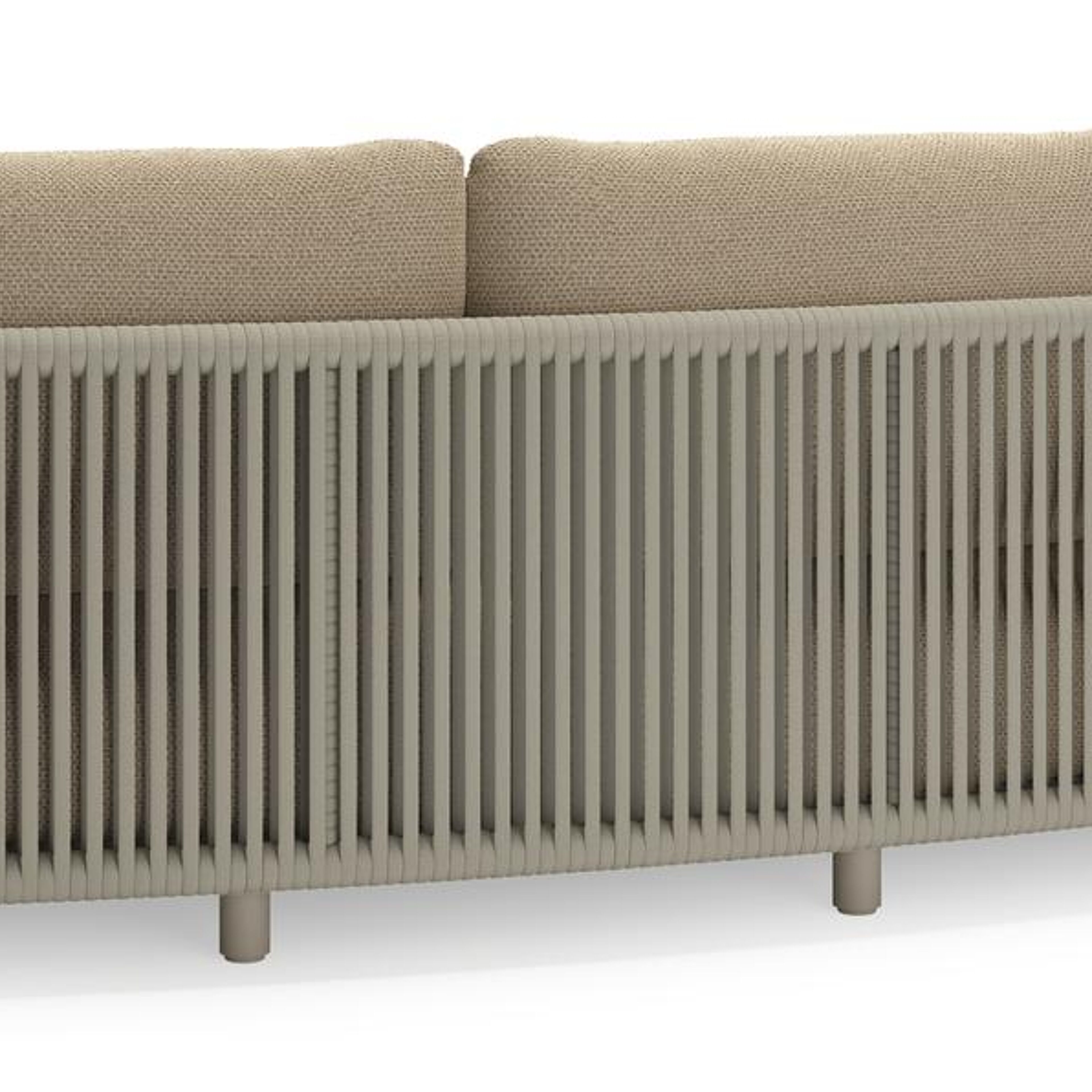 Lomano loungebank in beige aluminium en beige verticaal geweven luxe vlakke rope met Althea Camel all weather cosytica | Exterioo tuinmeubelen