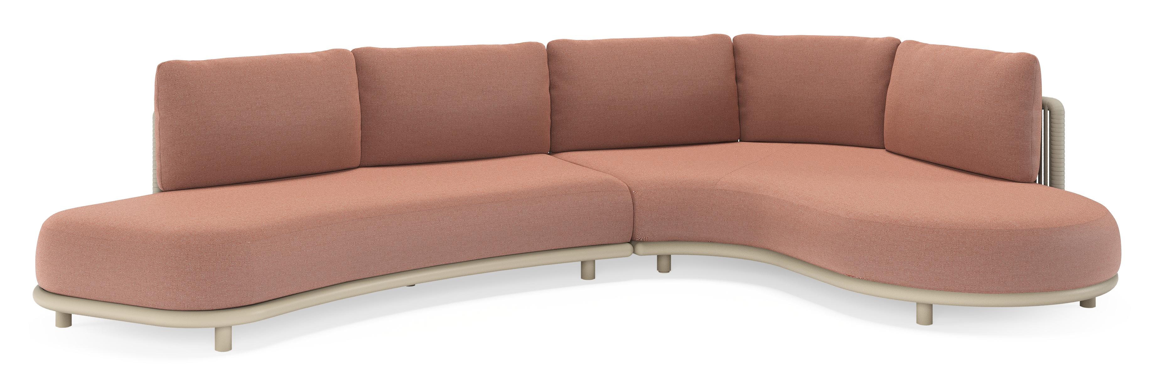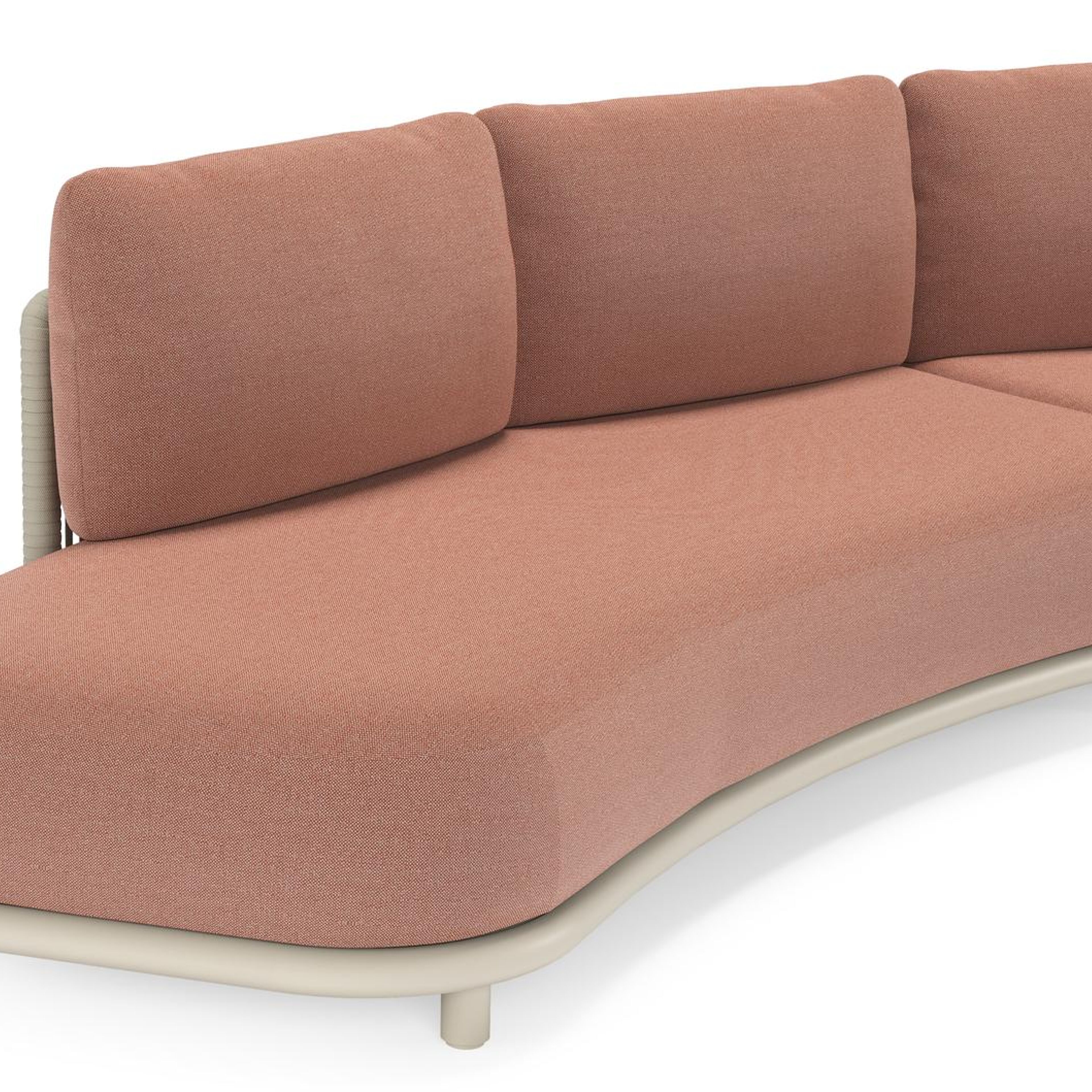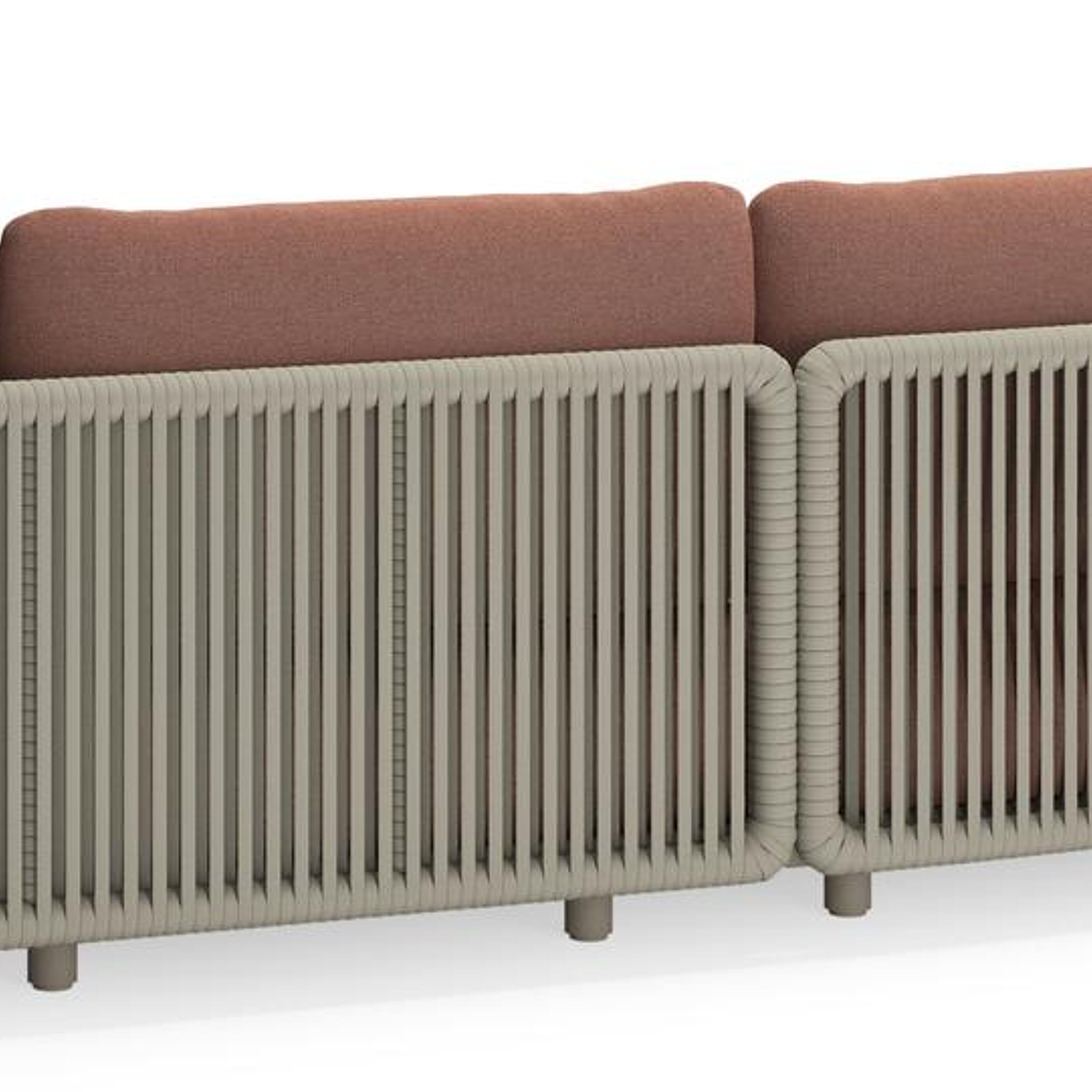 Lomano loungehoek in beige aluminium en beige verticaal geweven luxe vlakke rope met Savane Rust all weather sunbrella® luxe | Exterioo tuinmeubelen