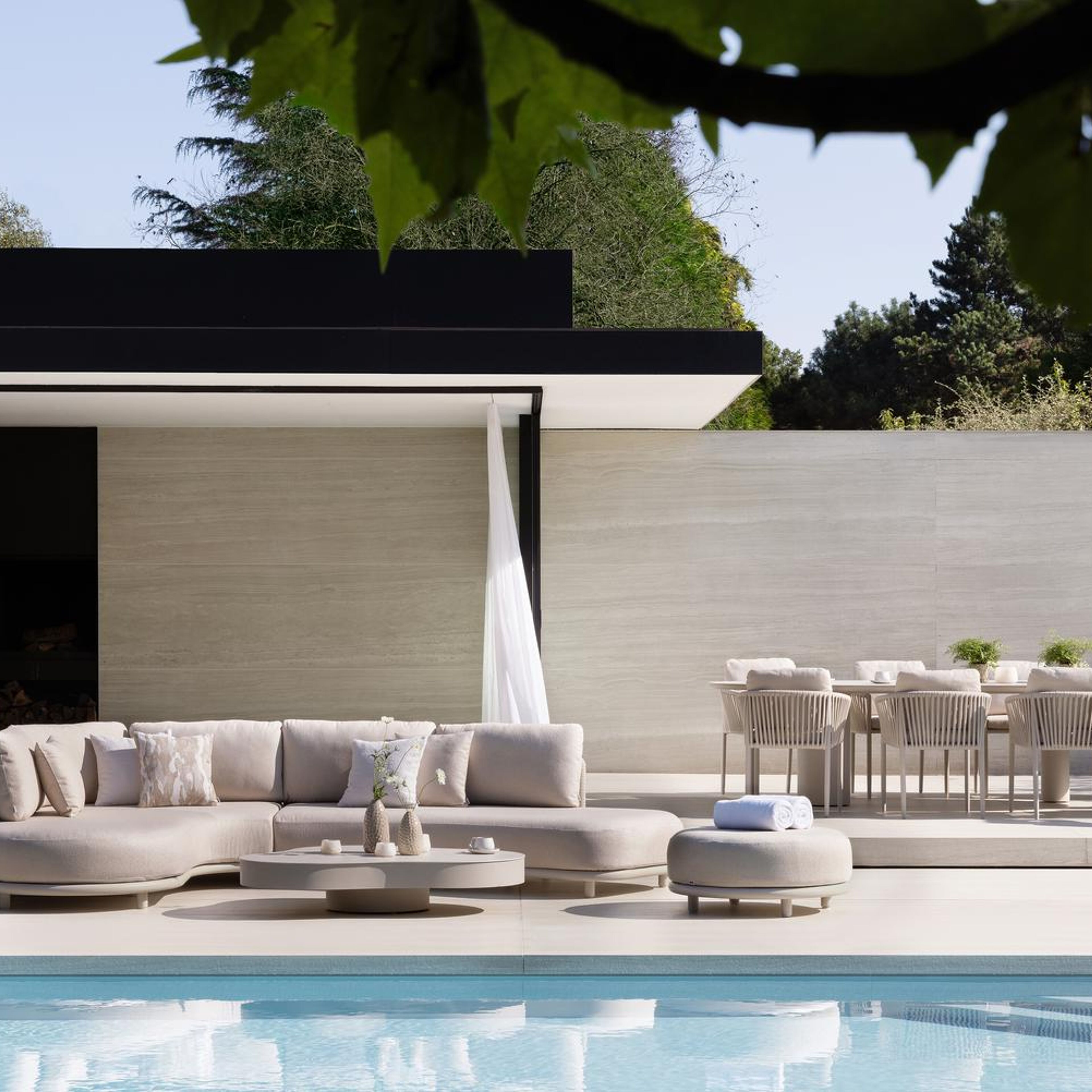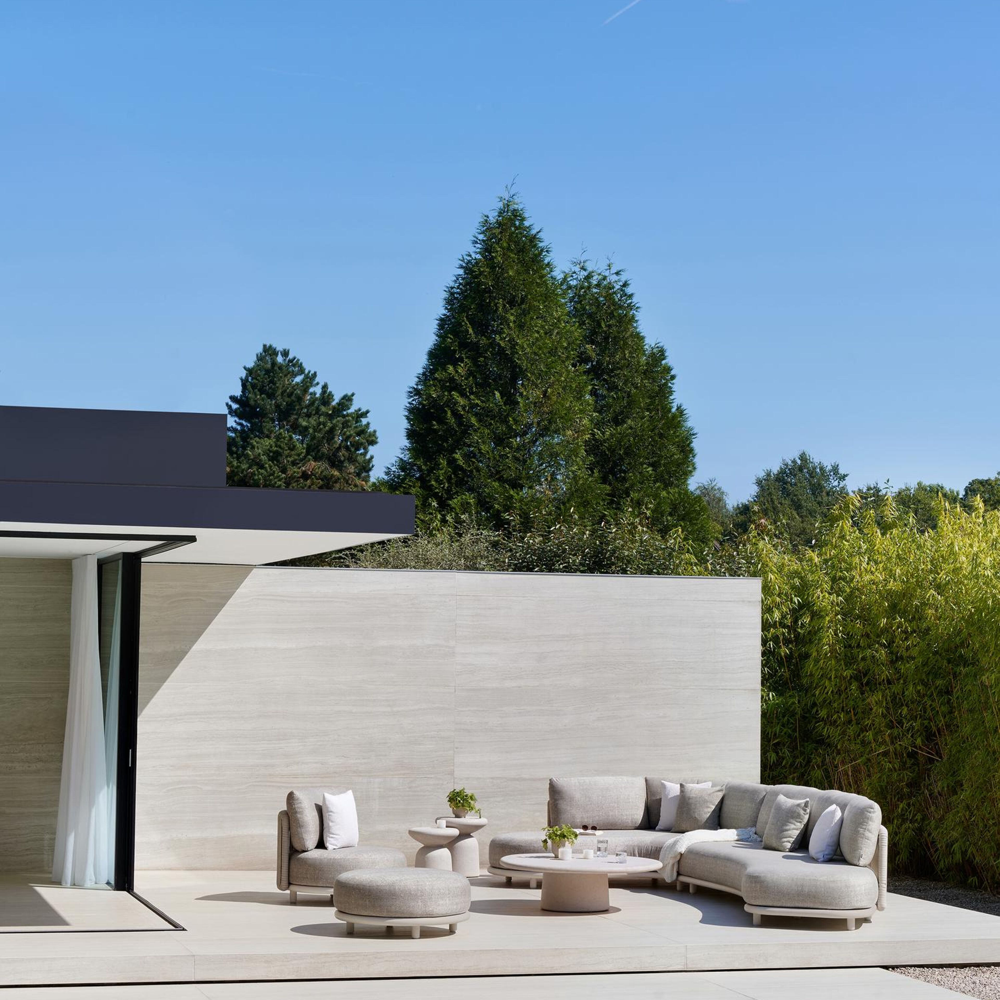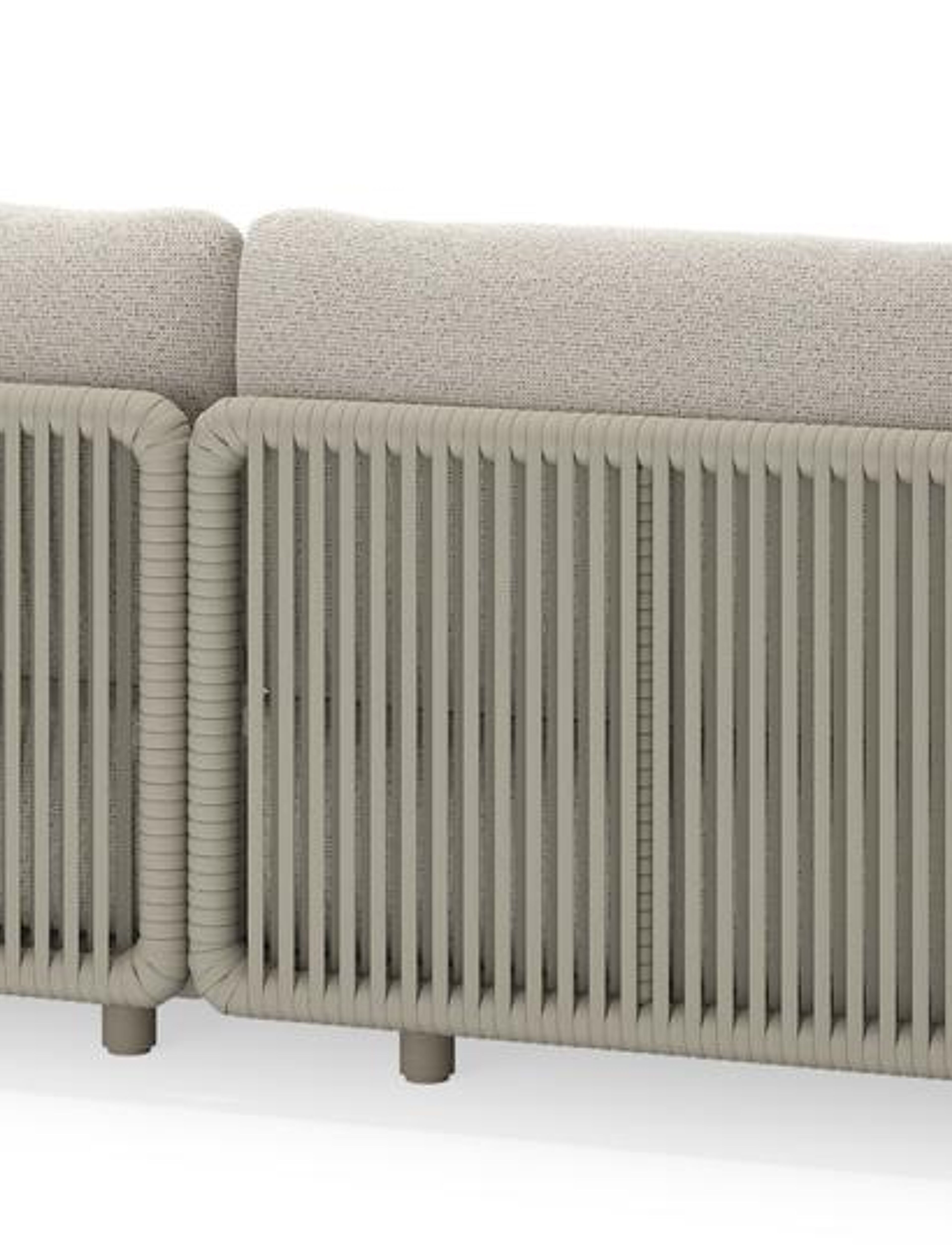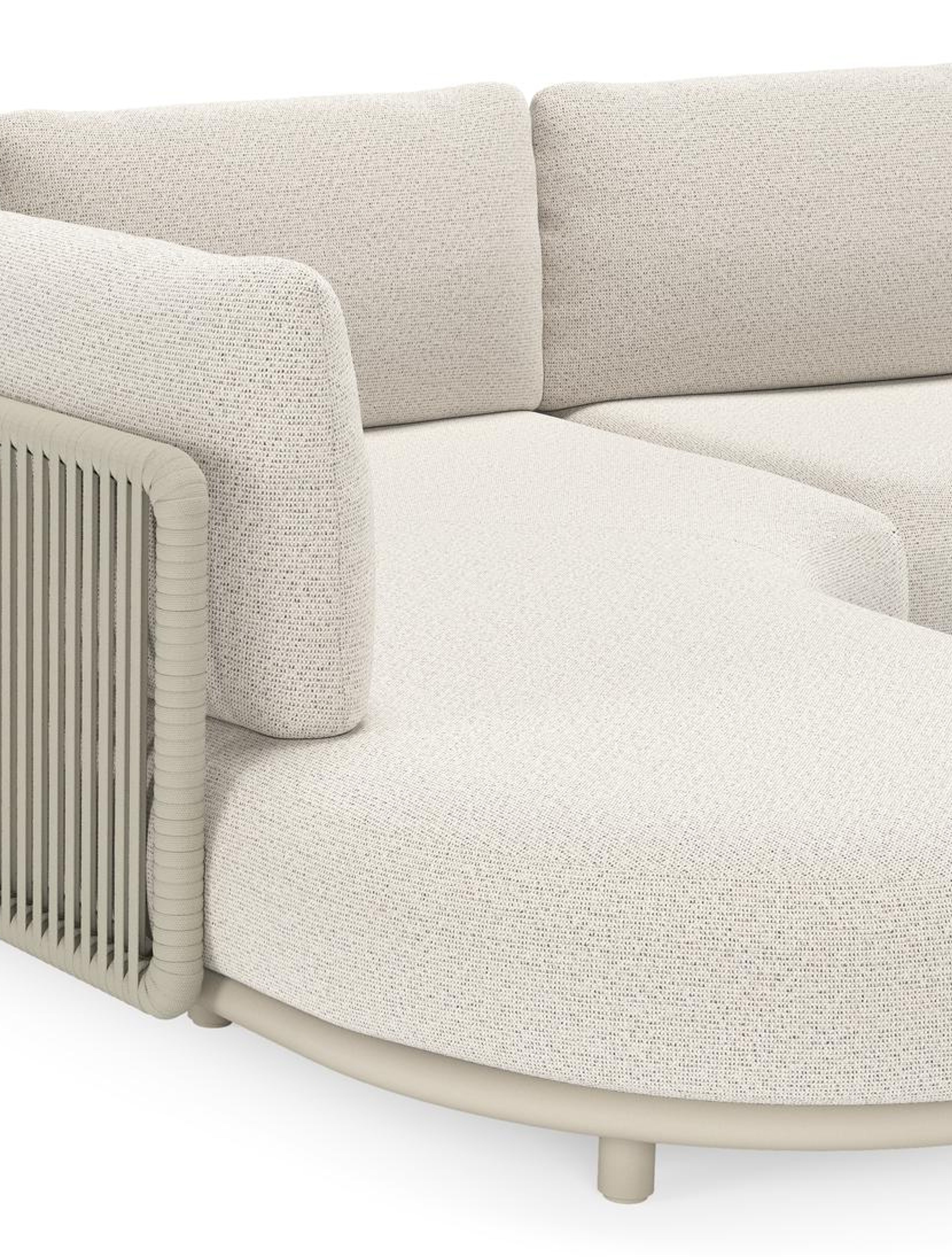Lomano loungehoek in beige aluminium en beige verticaal geweven luxe vlakke rope met Firenze Natural all weather solica | Exterioo tuinmeubelen