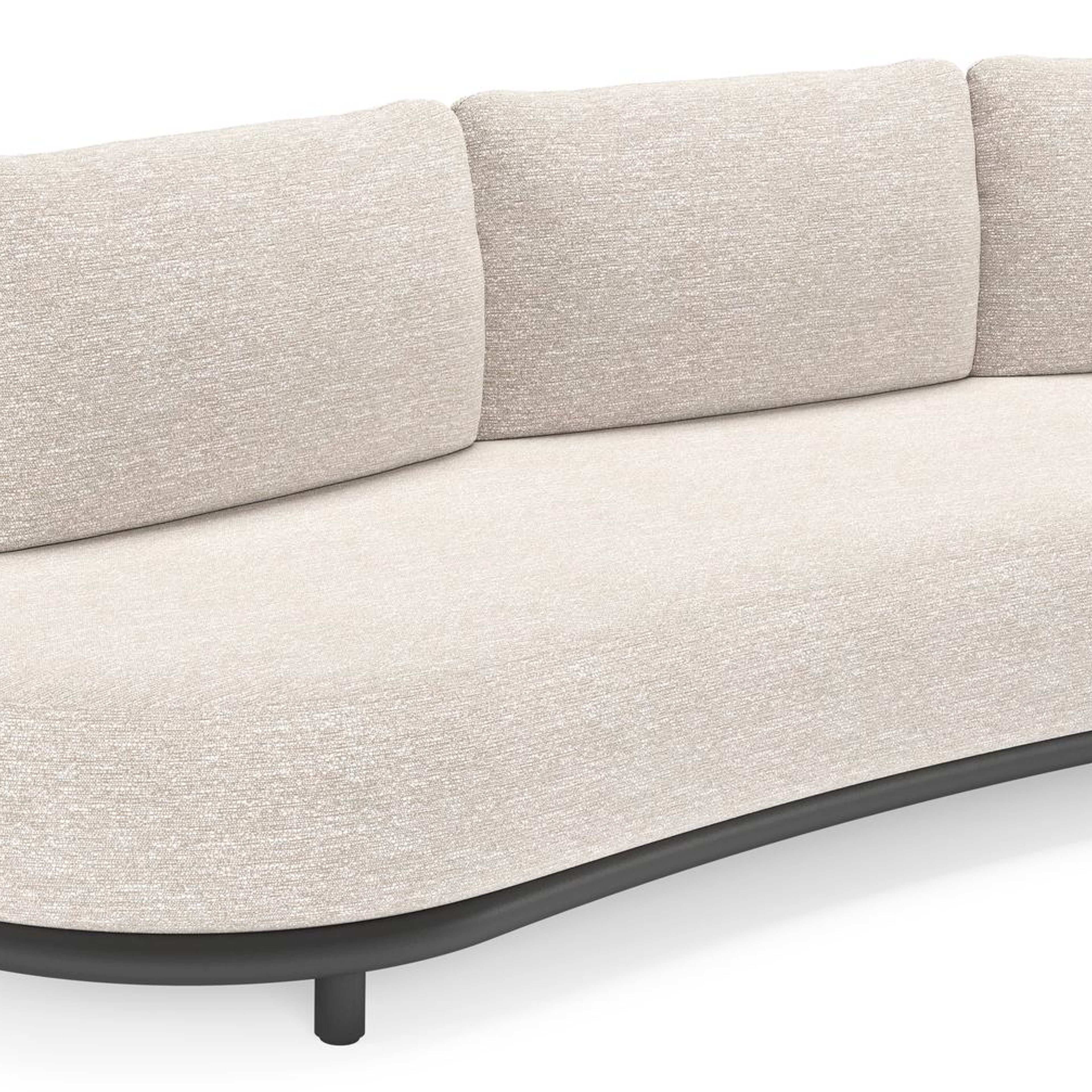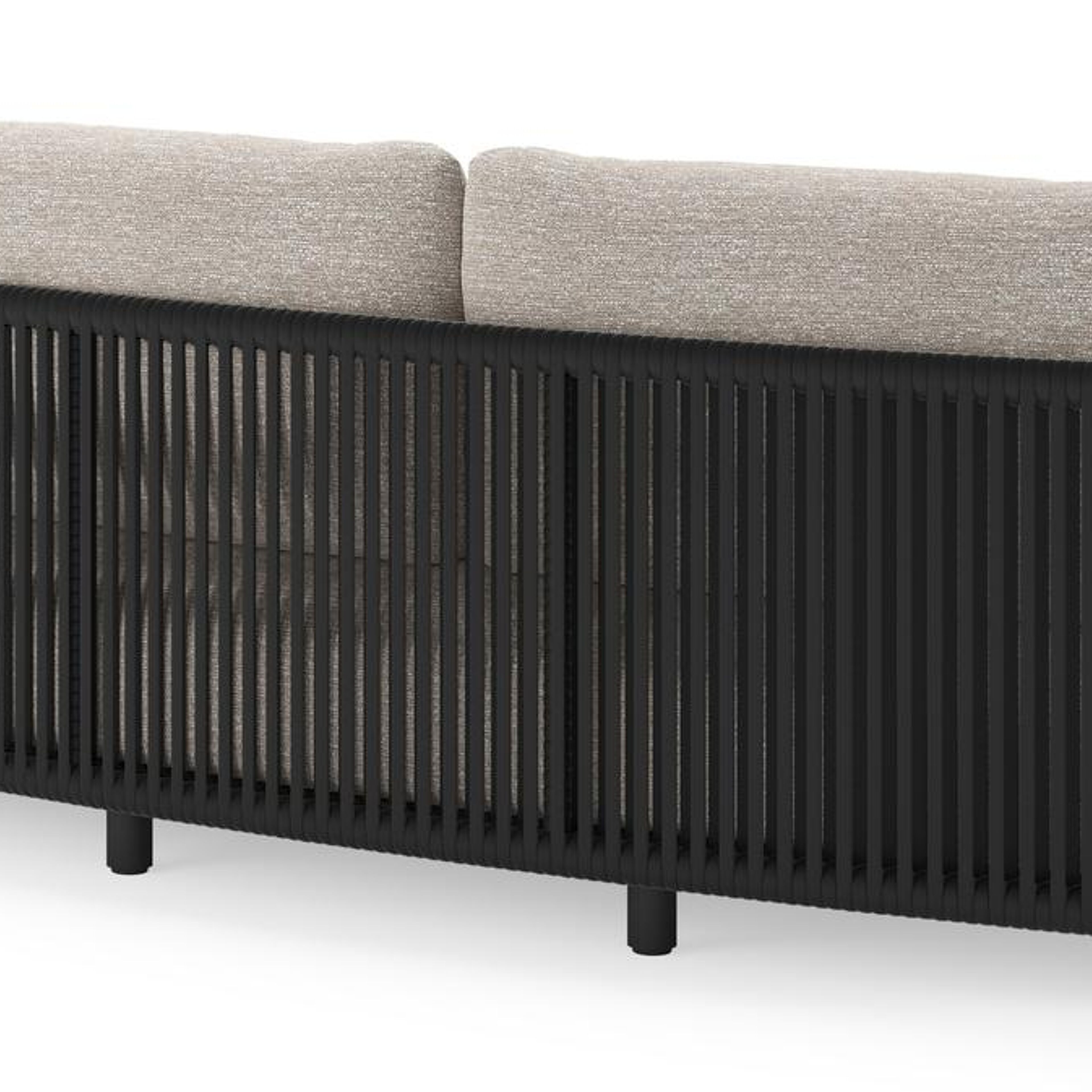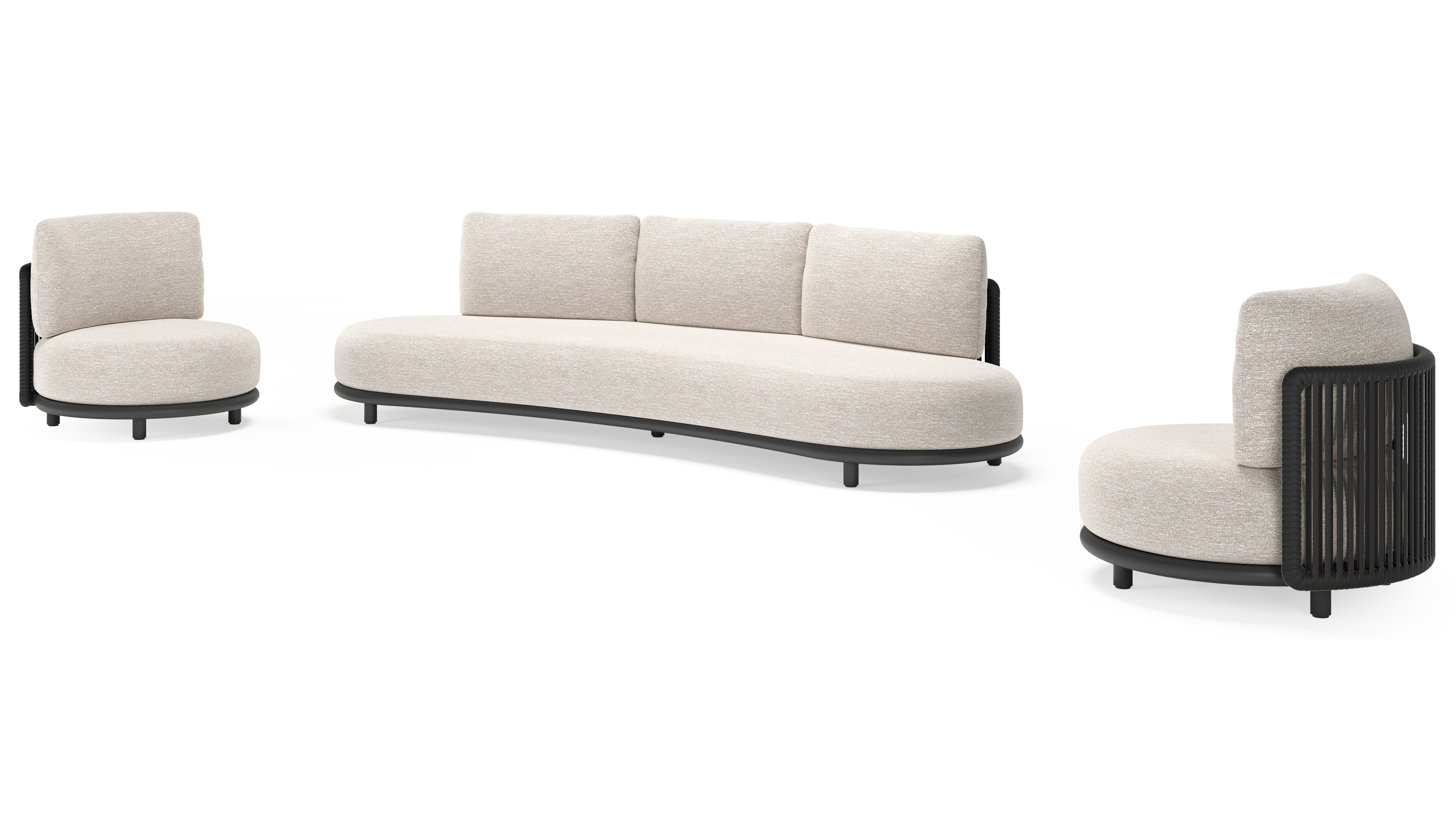 Lomano loungeset in zwart aluminium en zwart verticaal geweven luxe vlakke rope met tundra sand all weather sunbrella® luxe kussen | Exterioo tuinmeubelen