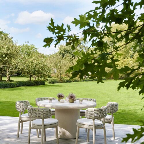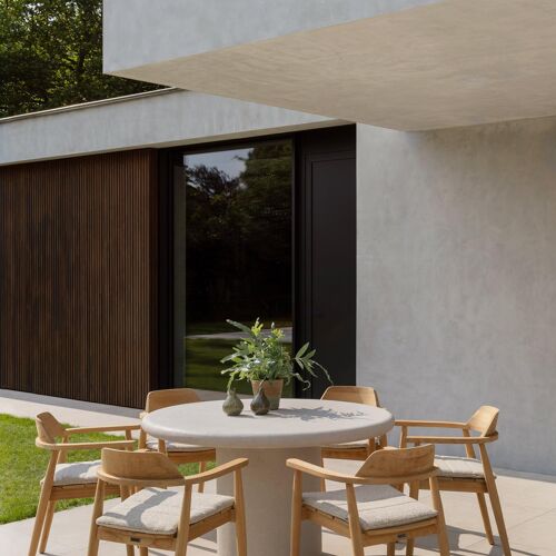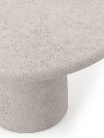 De Lomo tuintafel heeft een strak en minimalistisch design met een rond tafelblad en cilindrische basis. De beton afwerking geeft een moderne uitstraling. De eenvoudige vormen stralen stevigheid en tijdloze elegantie uit.