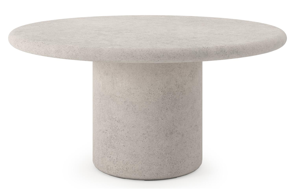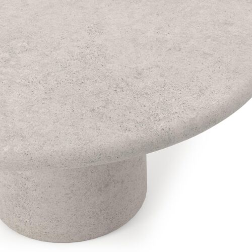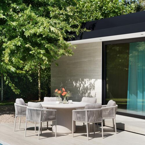 De Lomo tuintafel heeft een strak en minimalistisch design met een rond tafelblad en cilindrische basis. De beton afwerking geeft een moderne uitstraling. De eenvoudige vormen stralen stevigheid en tijdloze elegantie uit.