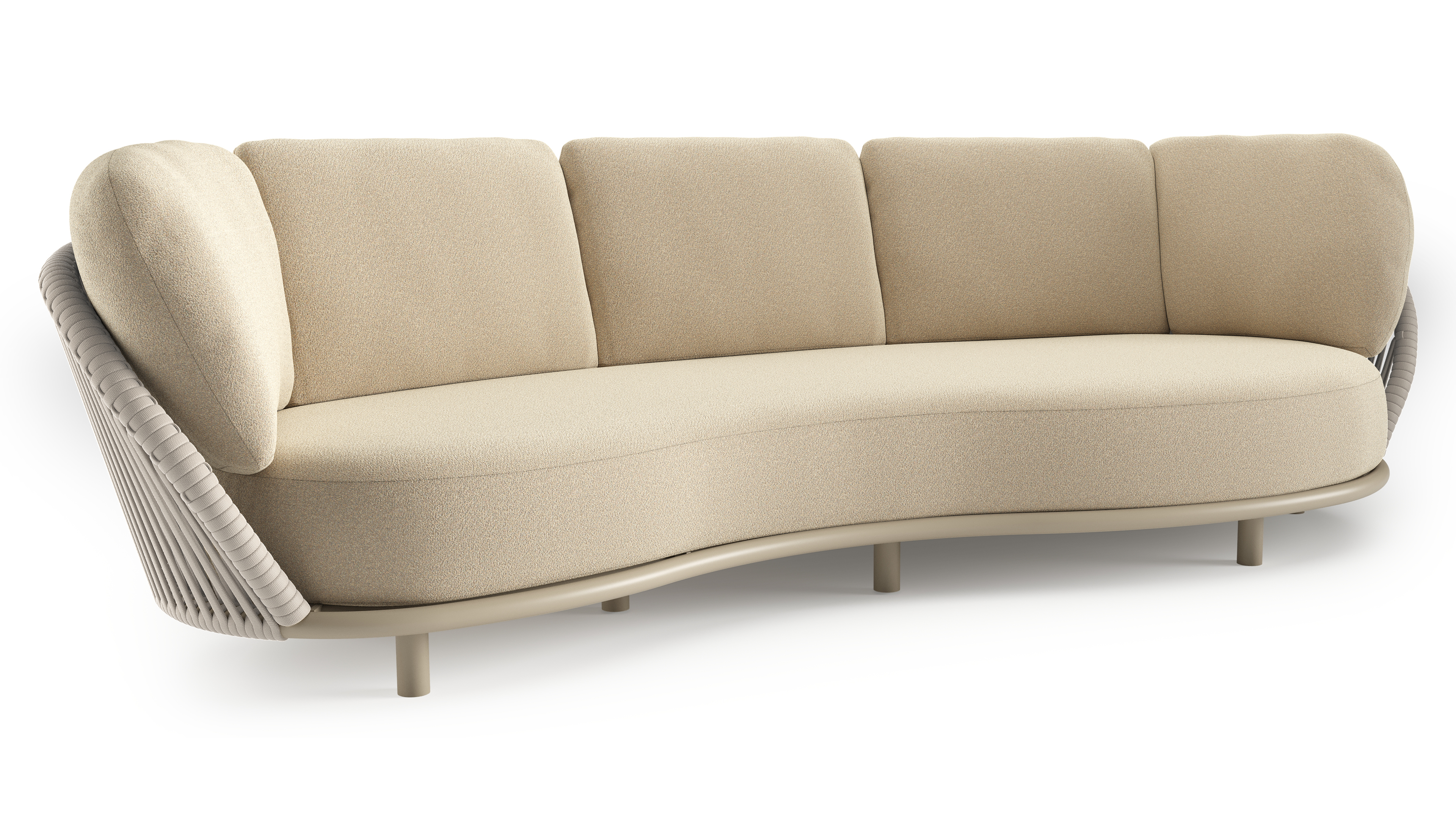Lupino loungebank in beige aluminium en beige verticaal geweven luxe vlakke brede rope met soul papyrus all weather solica kussen | Exterioo tuinmeubelen