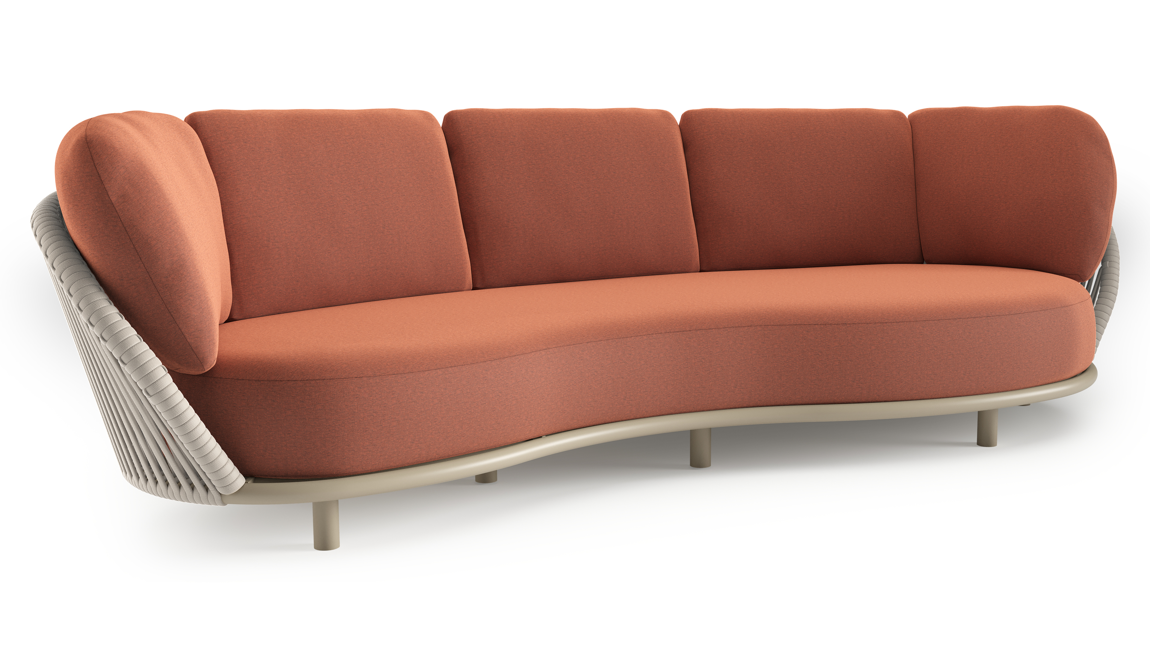 Lupino loungebank in beige aluminium en beige verticaal geweven luxe vlakke brede rope met heritage rust all weather sunbrella® luxe kussen | Exterioo tuinmeubelen