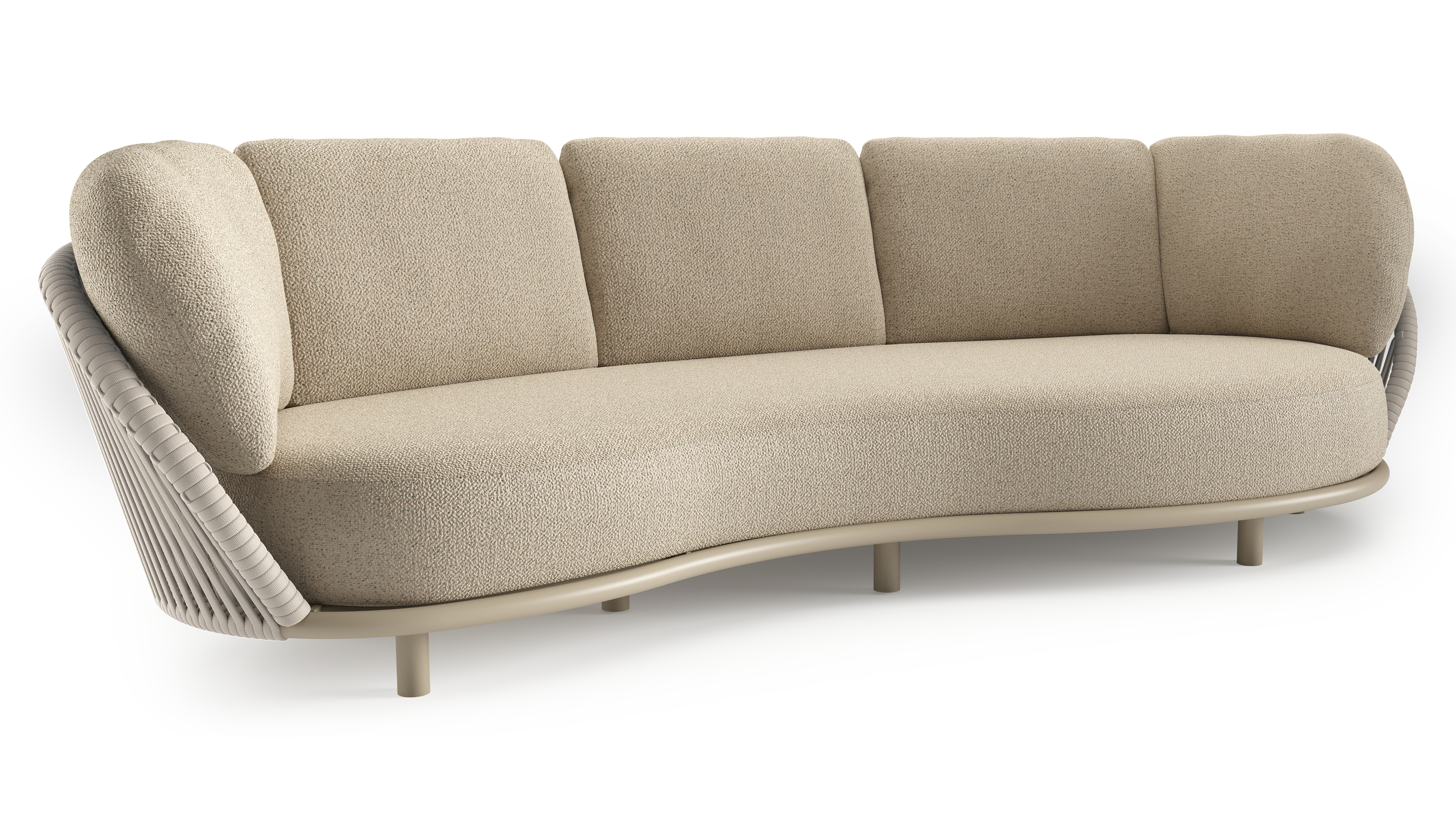 Lupino loungebank in beige aluminium en beige verticaal geweven luxe vlakke brede rope met bora forest all weather cosytica kussen | Exterioo tuinmeubelen