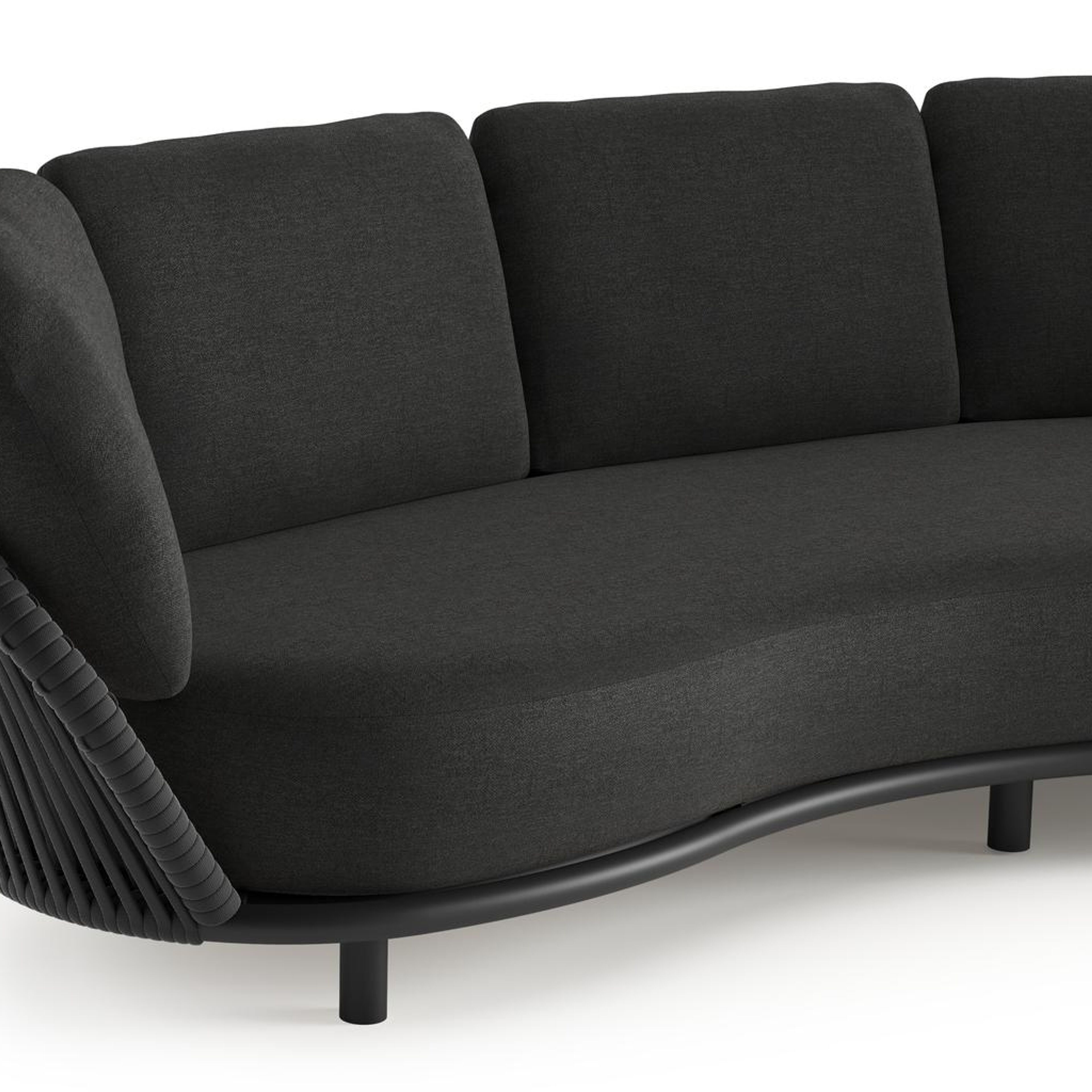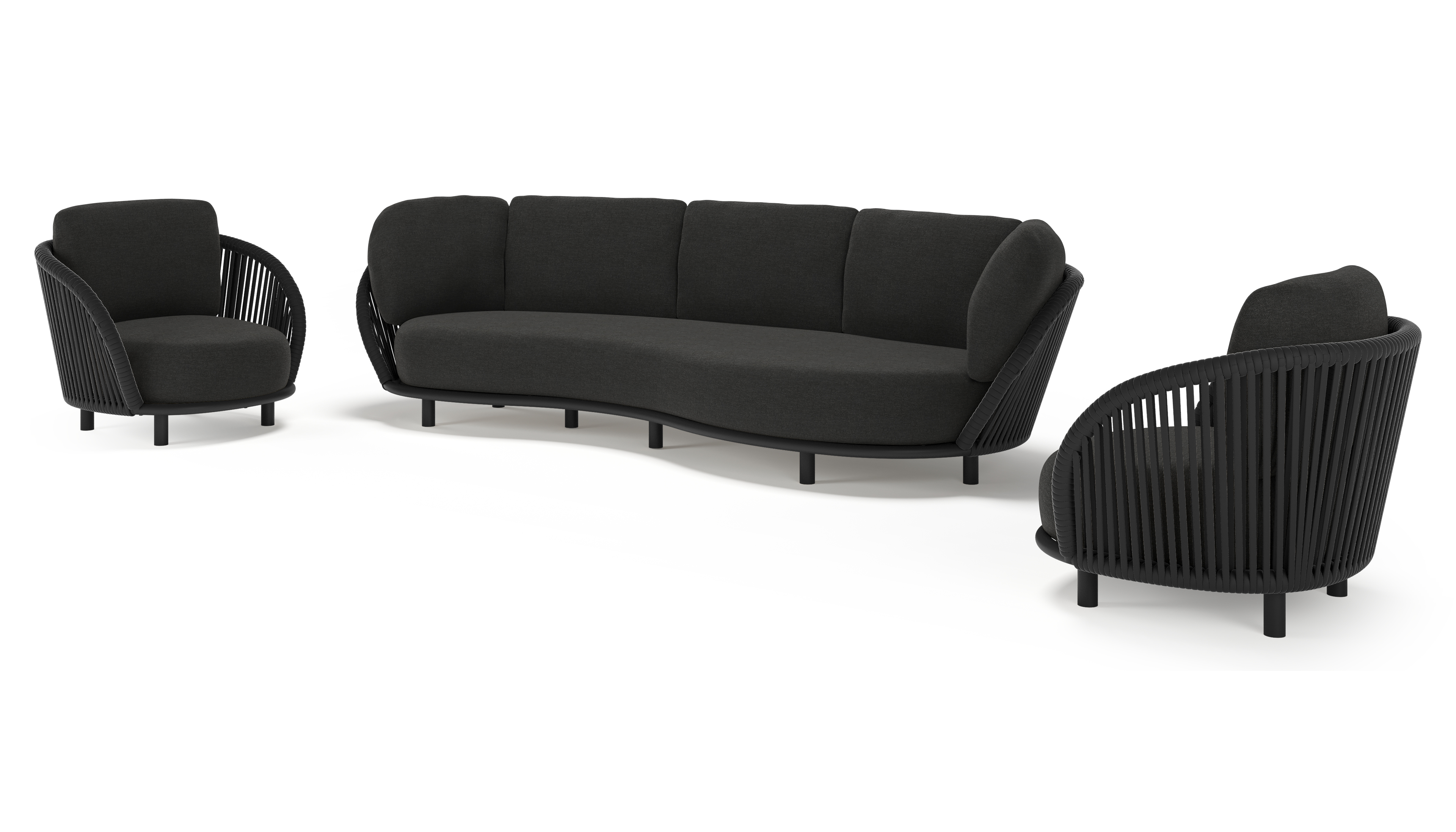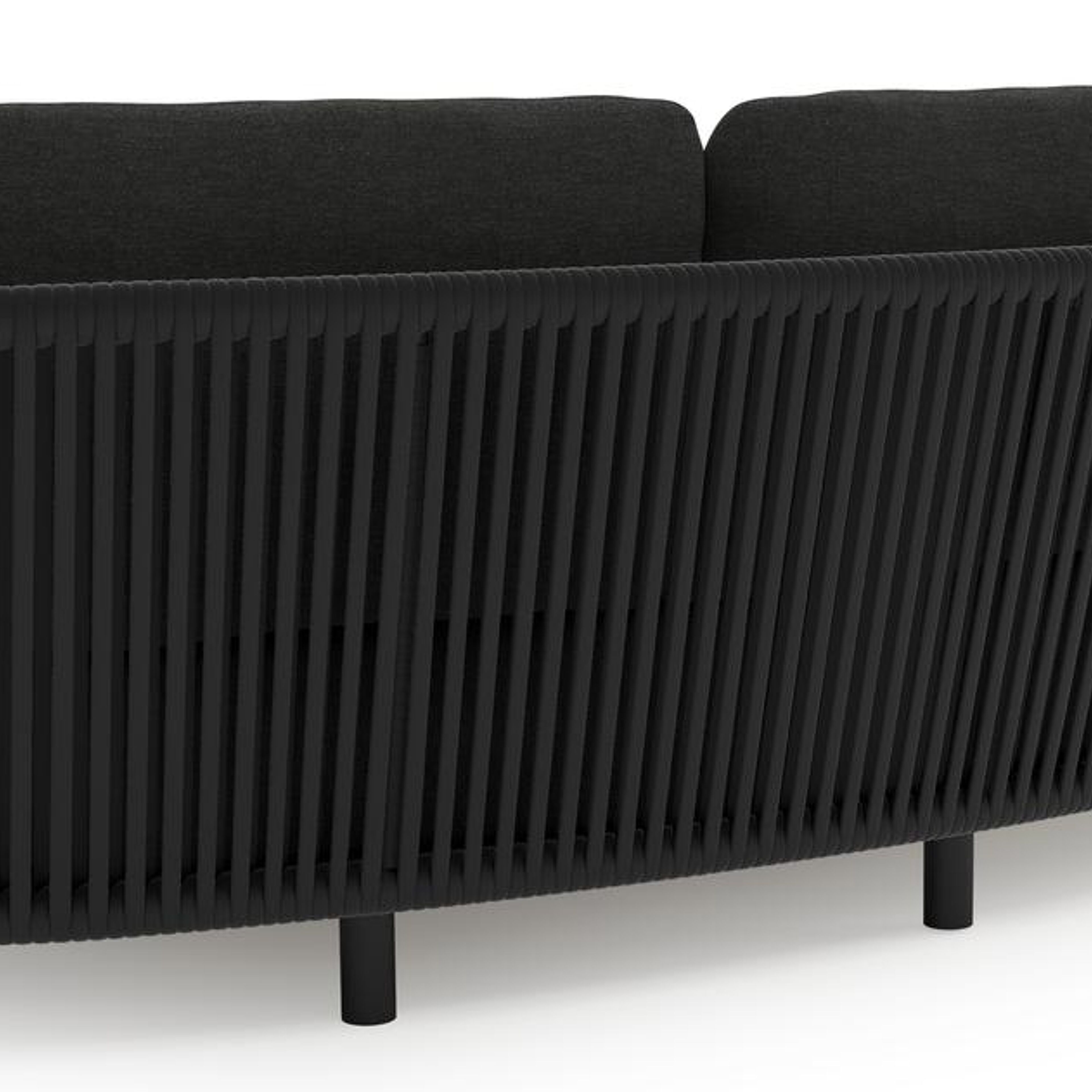 Lupino loungeset in zwart aluminium en zwart verticaal geweven luxe vlakke brede rope met chartres sooty all weather sunbrella® luxe kussen | Exterioo tuinmeubelen