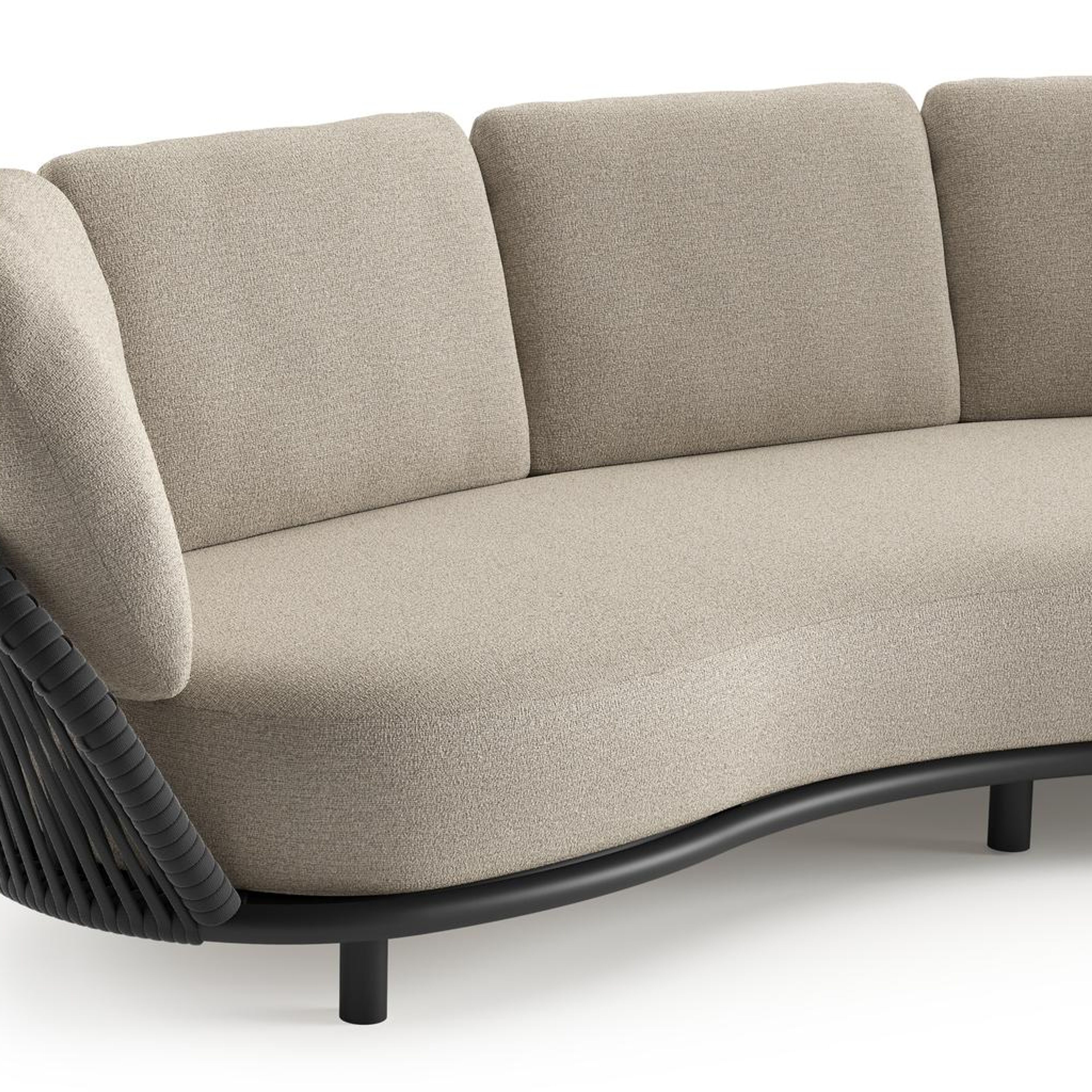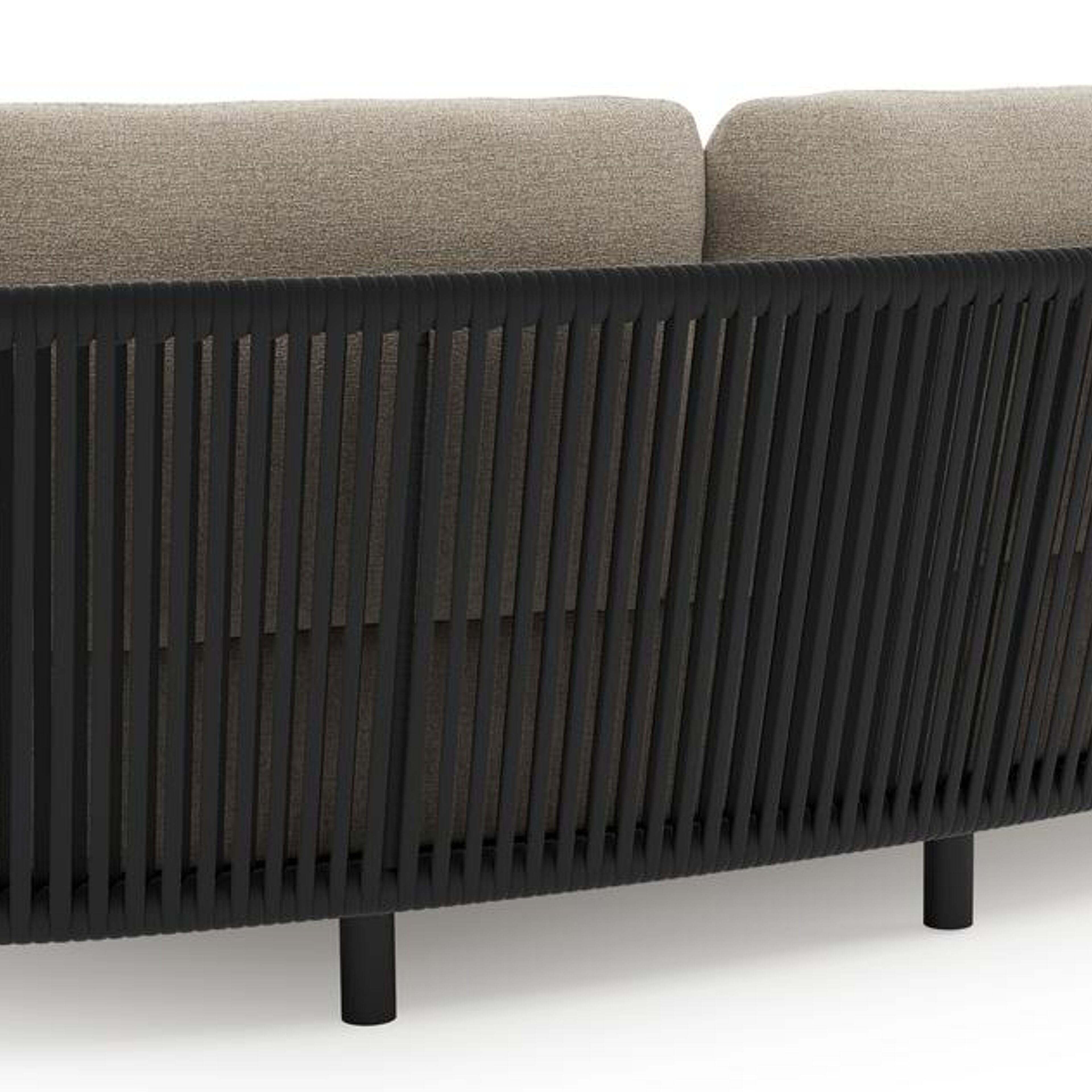 Lupino loungeset in zwart aluminium en zwart verticaal geweven luxe vlakke brede rope met catania sand all weather cosytica kussen | Exterioo tuinmeubelen