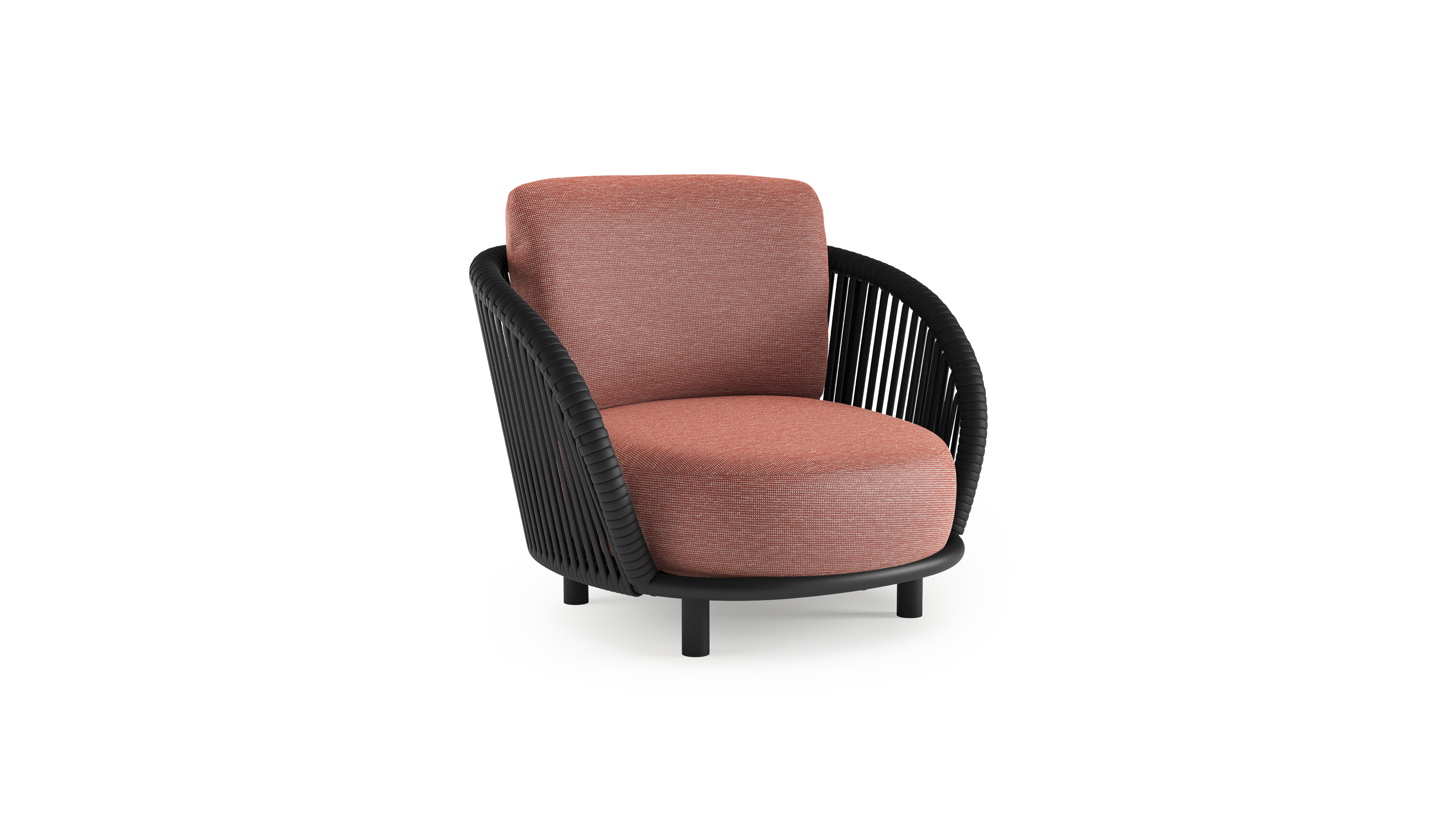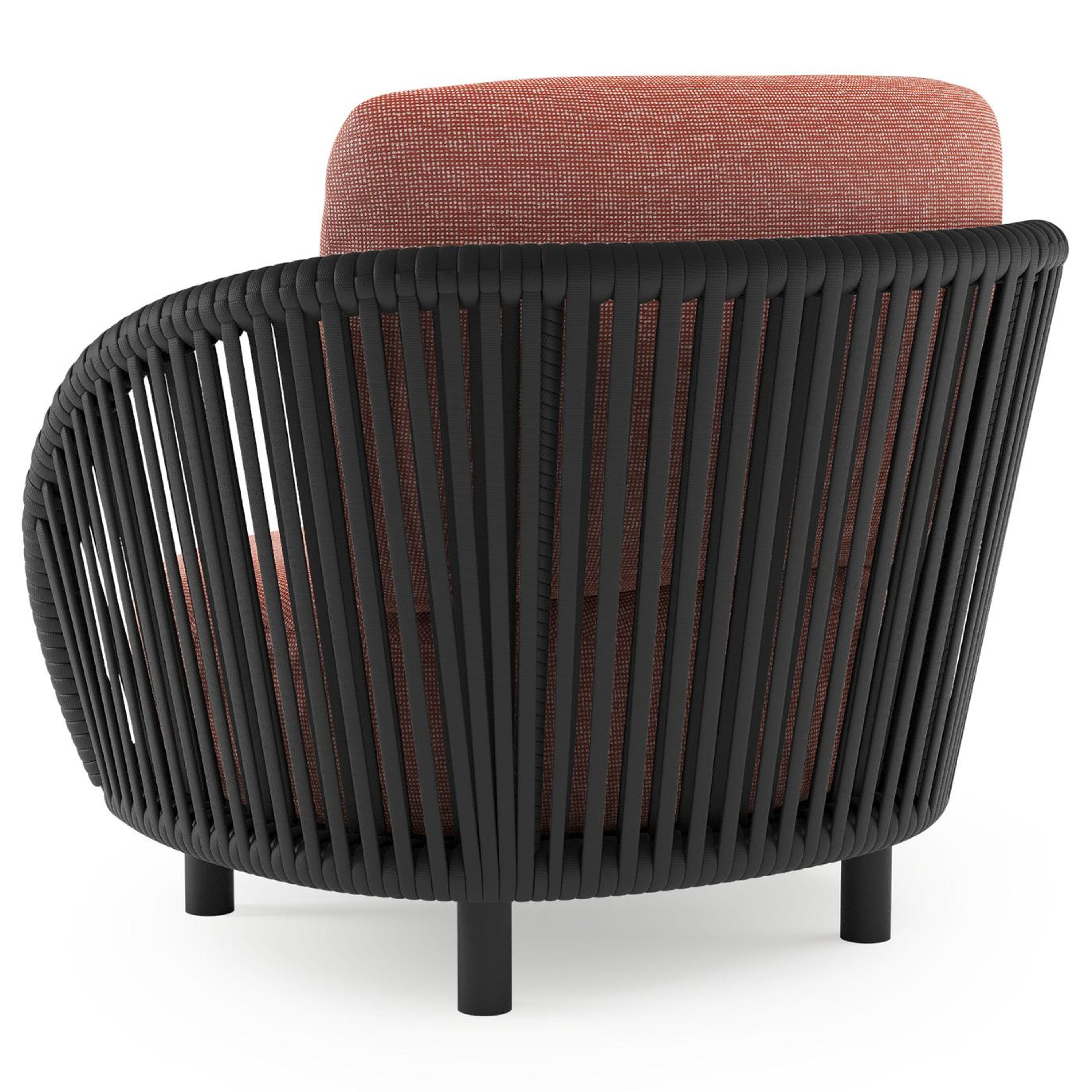 Lupino loungestoel in zwart aluminium en zwart verticaal geweven luxe vlakke brede rope met slow alezan all weather sunbrella® luxe kussen | Exterioo tuinmeubelen
