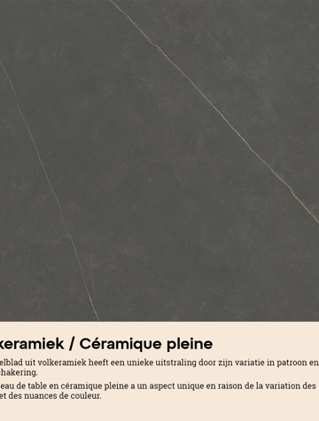 Een volkeramisch tafelblad is een keramische plaat die op extreem hoge temperatuur gebakken wordt. Het materiaal is uiterst stevig en kan tegen een stootje. Een volkeramisch tafelblad is vorst-, hitte- en krasbestendig en eenvoudig schoon te maken.