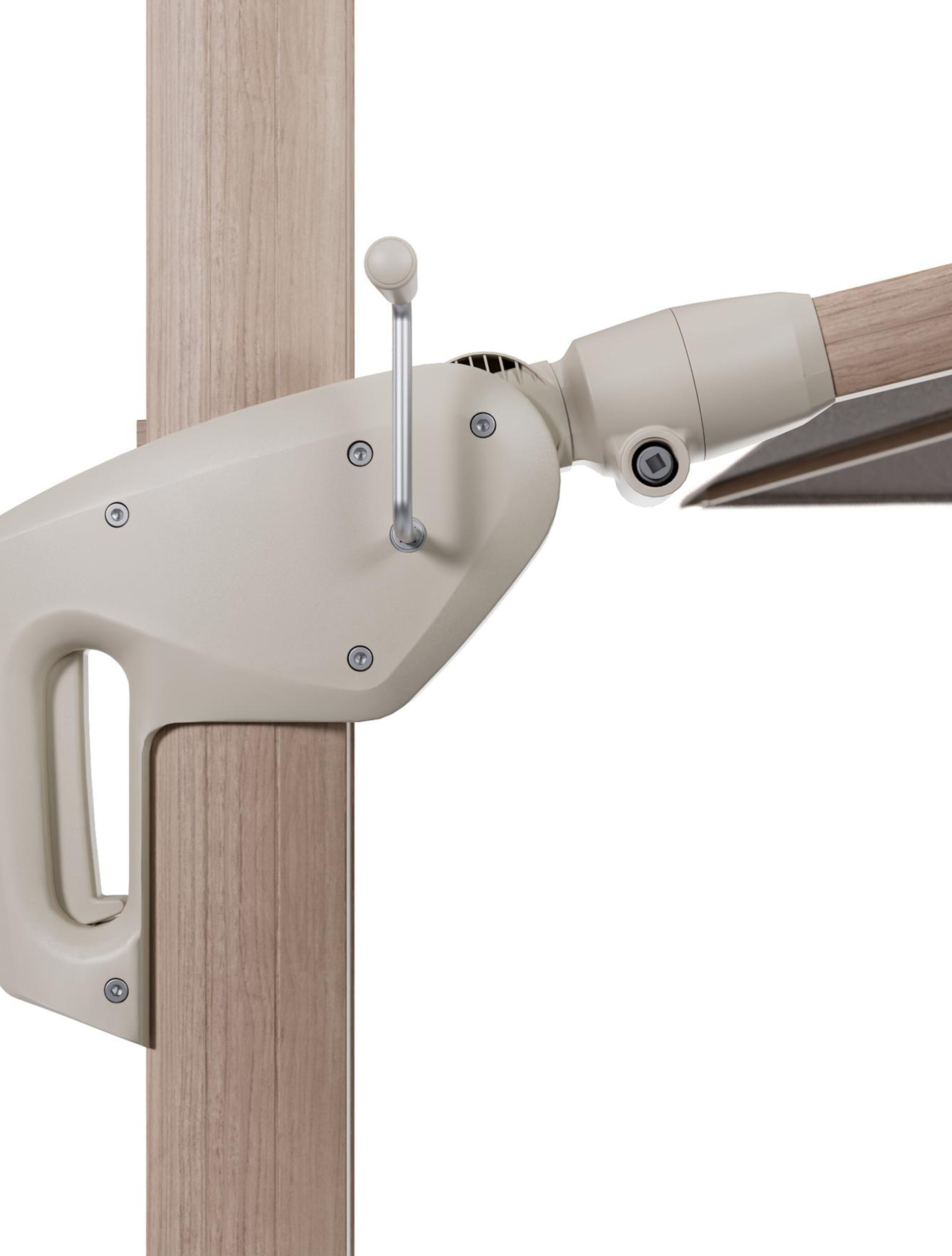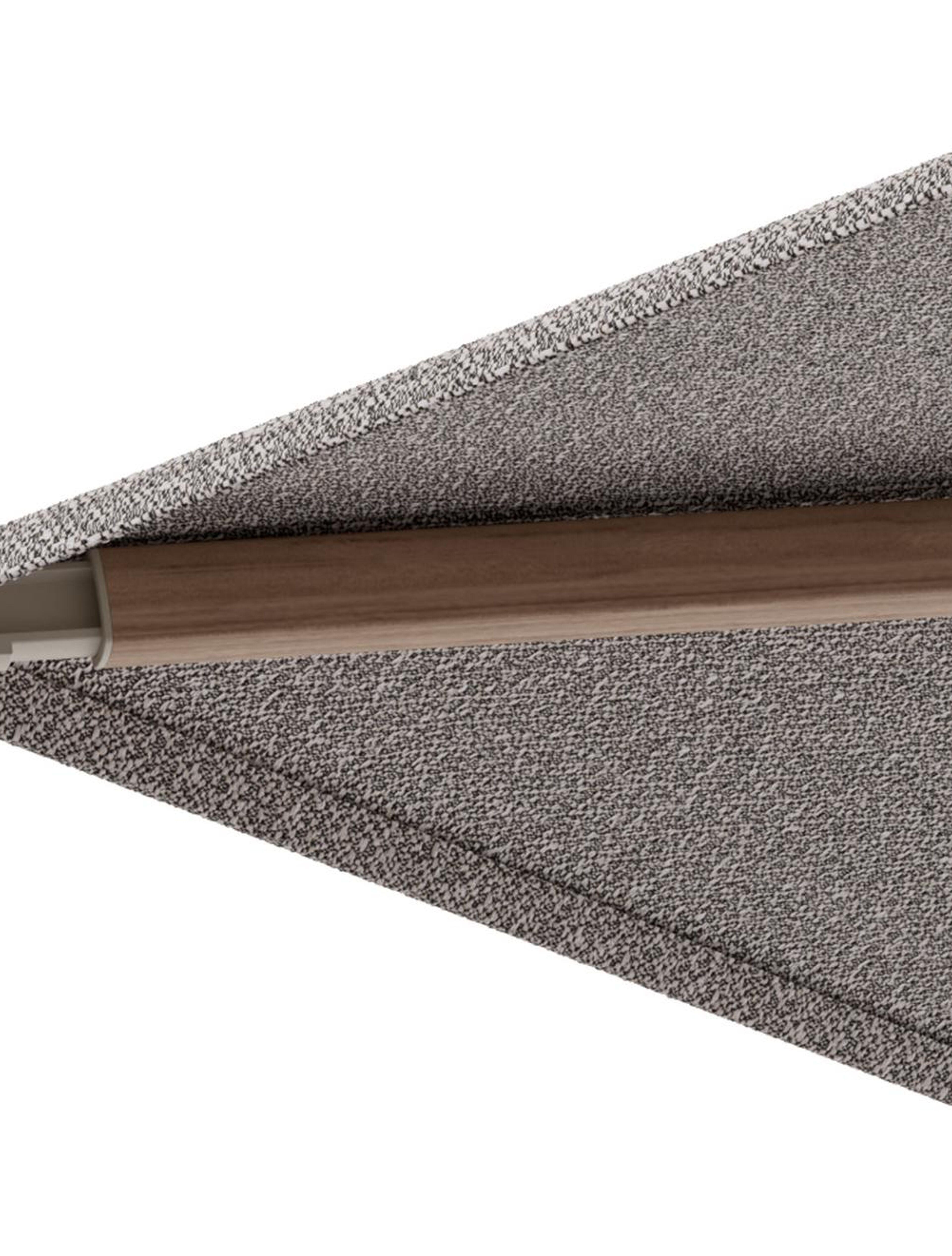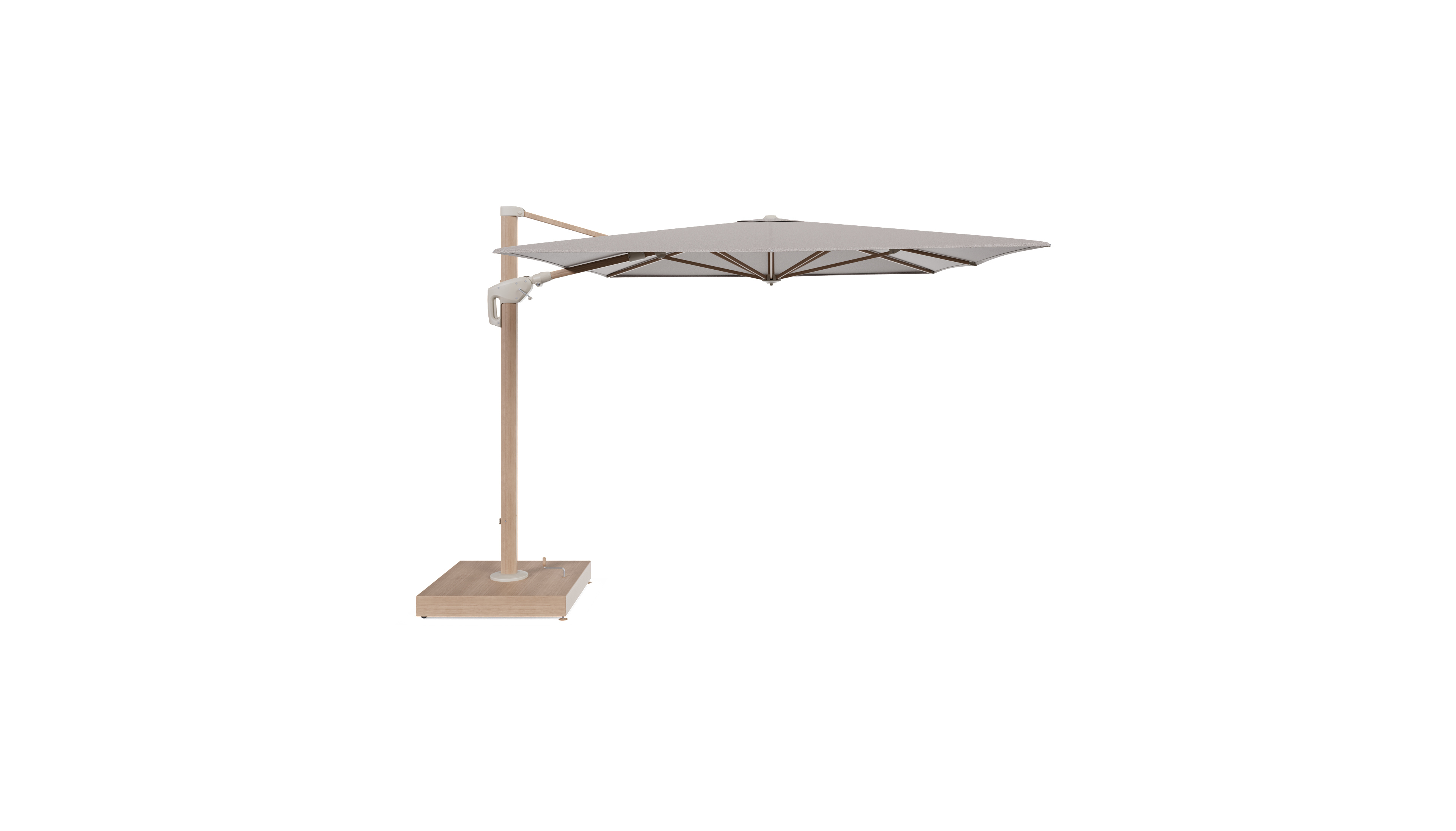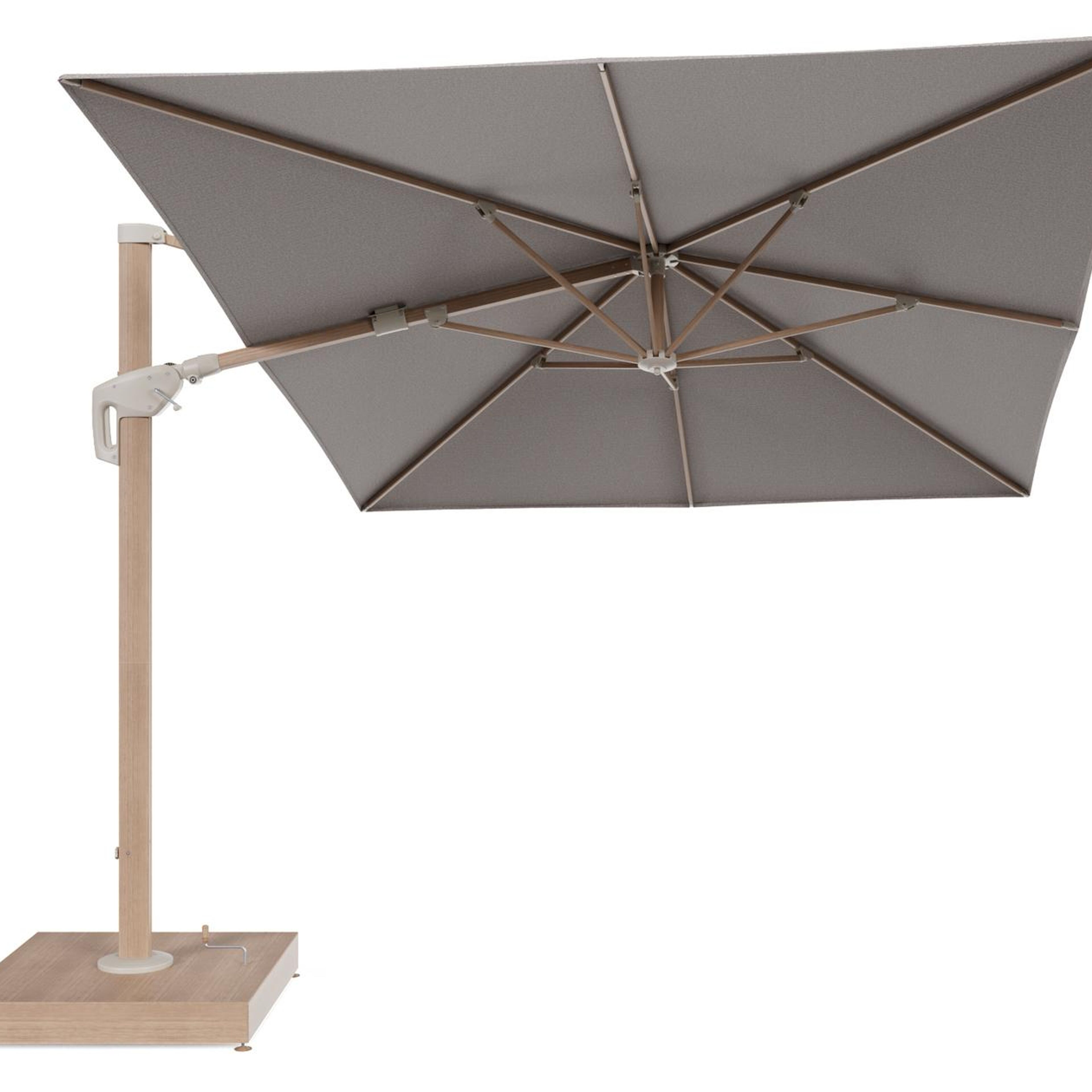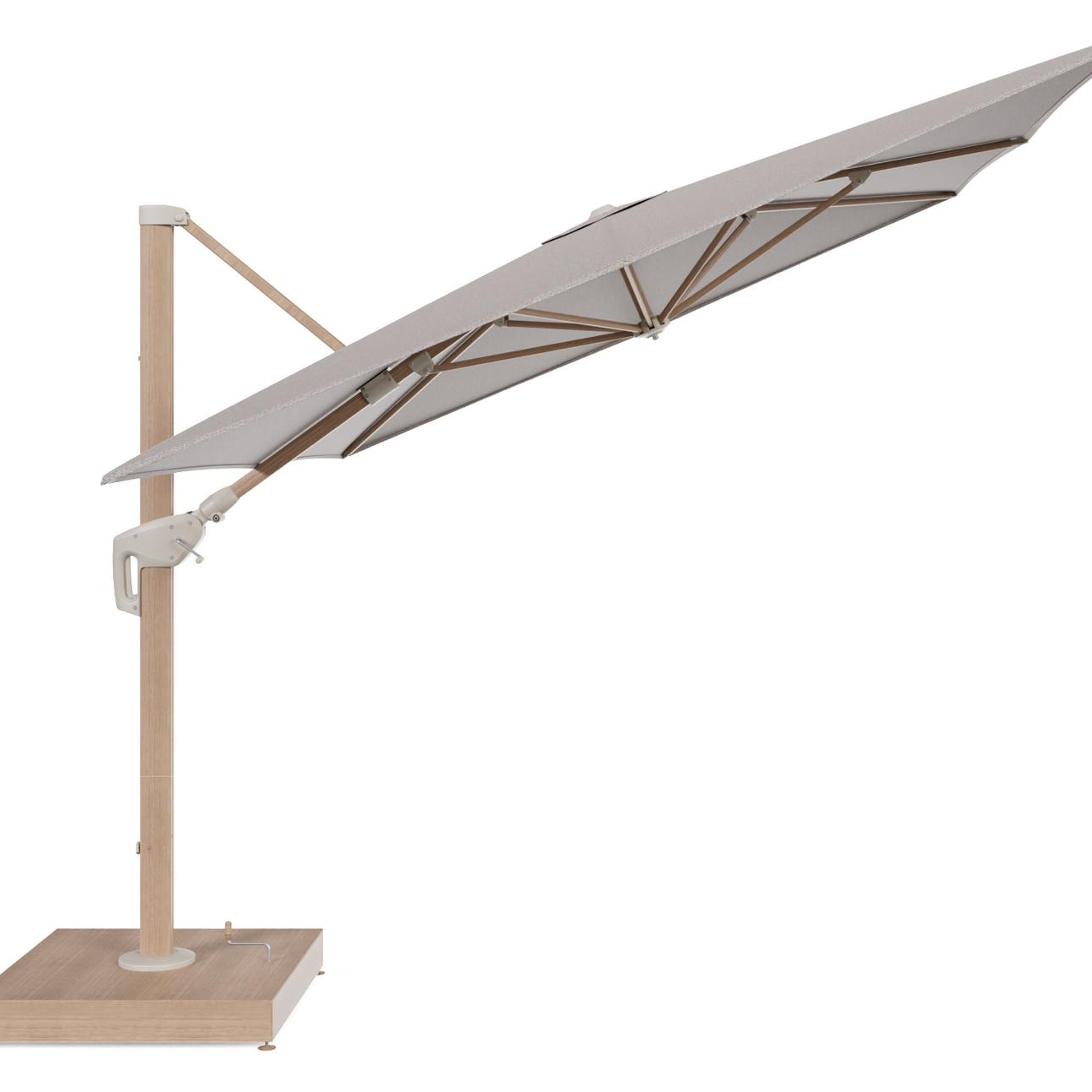 Minore zweefparasol met tiltfunctie in houtlook aluminium en Wander Granite All Weather Sunbrella® Luxe parasoldoek - L1 400 x L2 300 cm met parasolvoet Minore 260 kg met wielen | Exterioo tuinmeubelen
