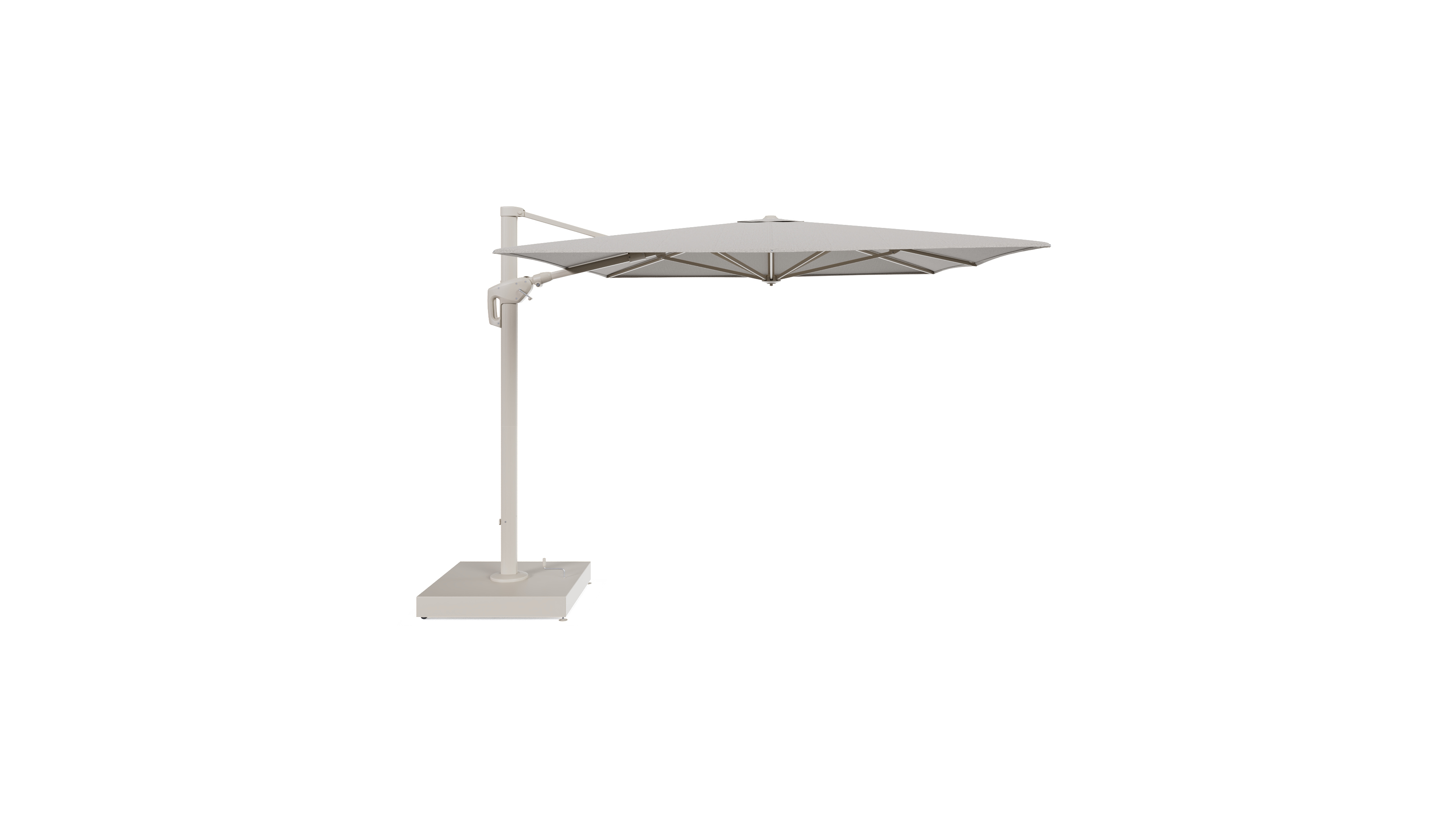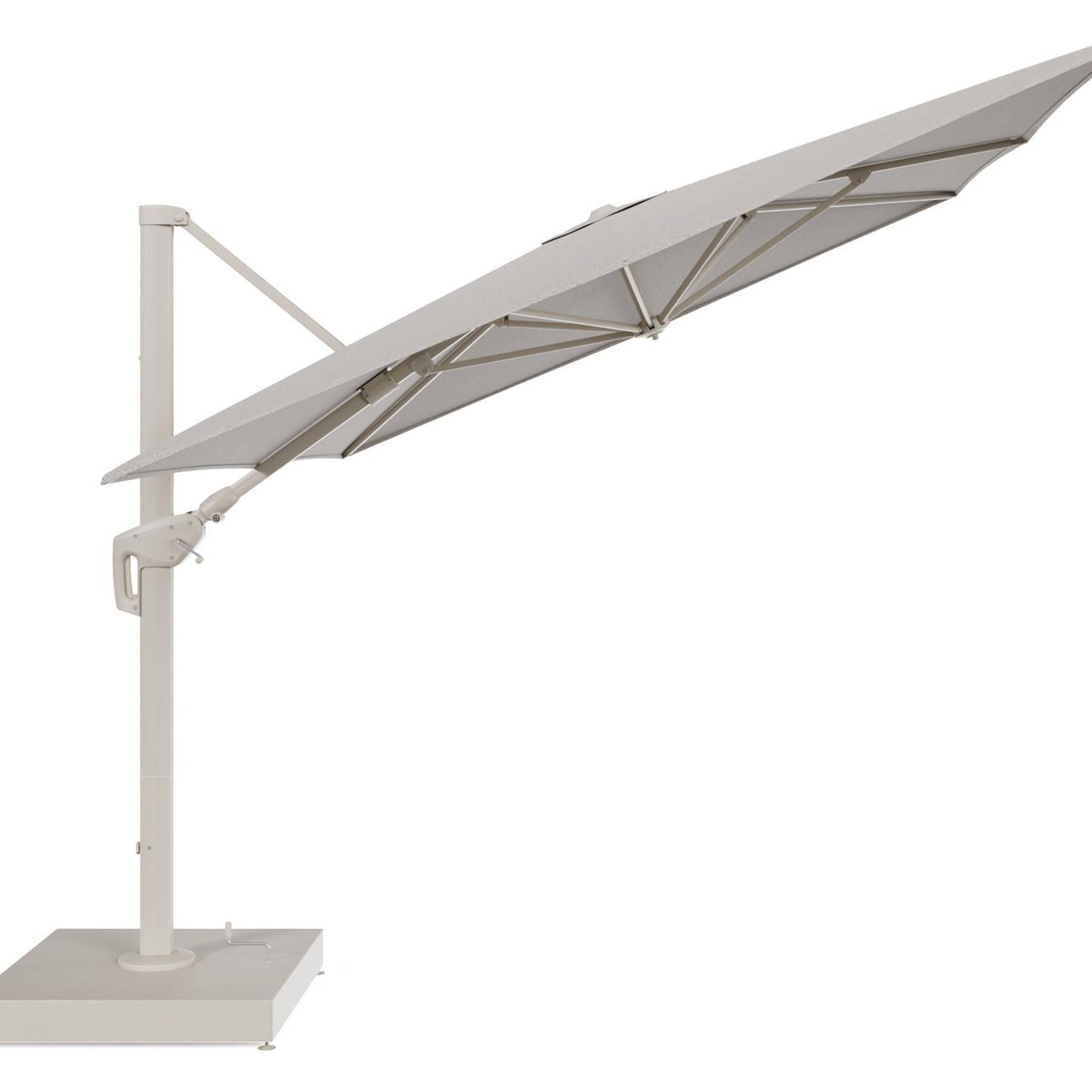 Minore zweefparasol met tiltfunctie in beige aluminium en Firenze Sand All Weather Solica parasoldoek - L1 400 x L2 300 cm met parasolvoet Minore 260 kg met wielen | Exterioo tuinmeubelen