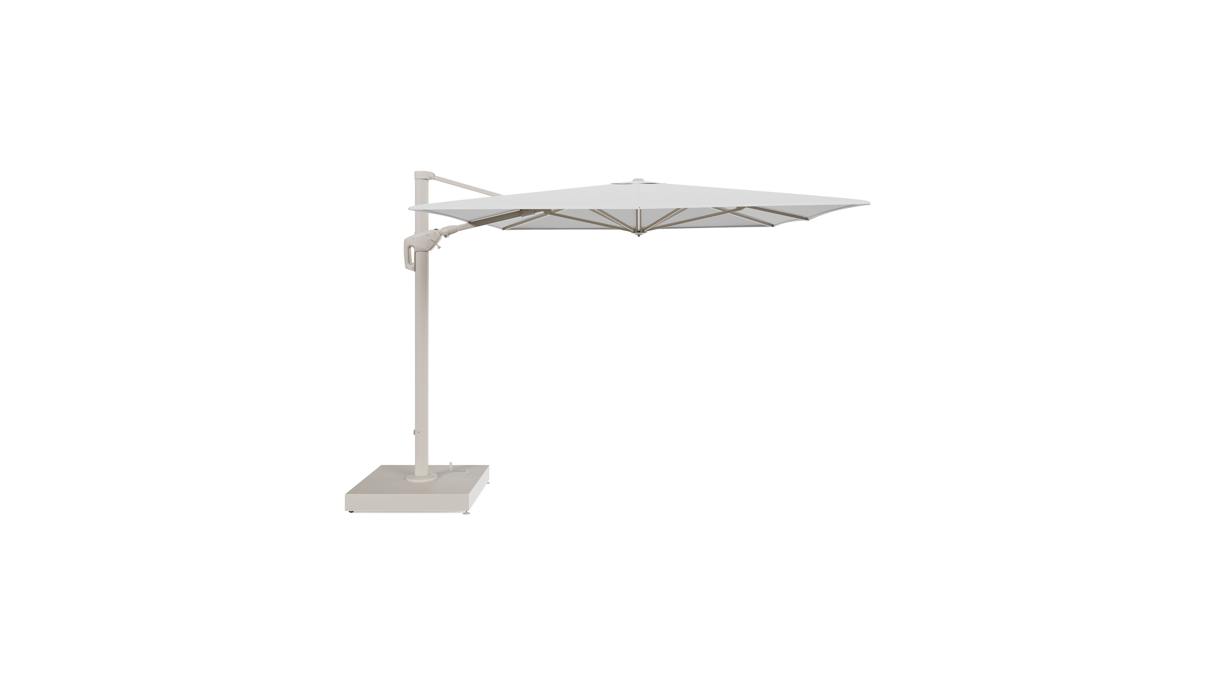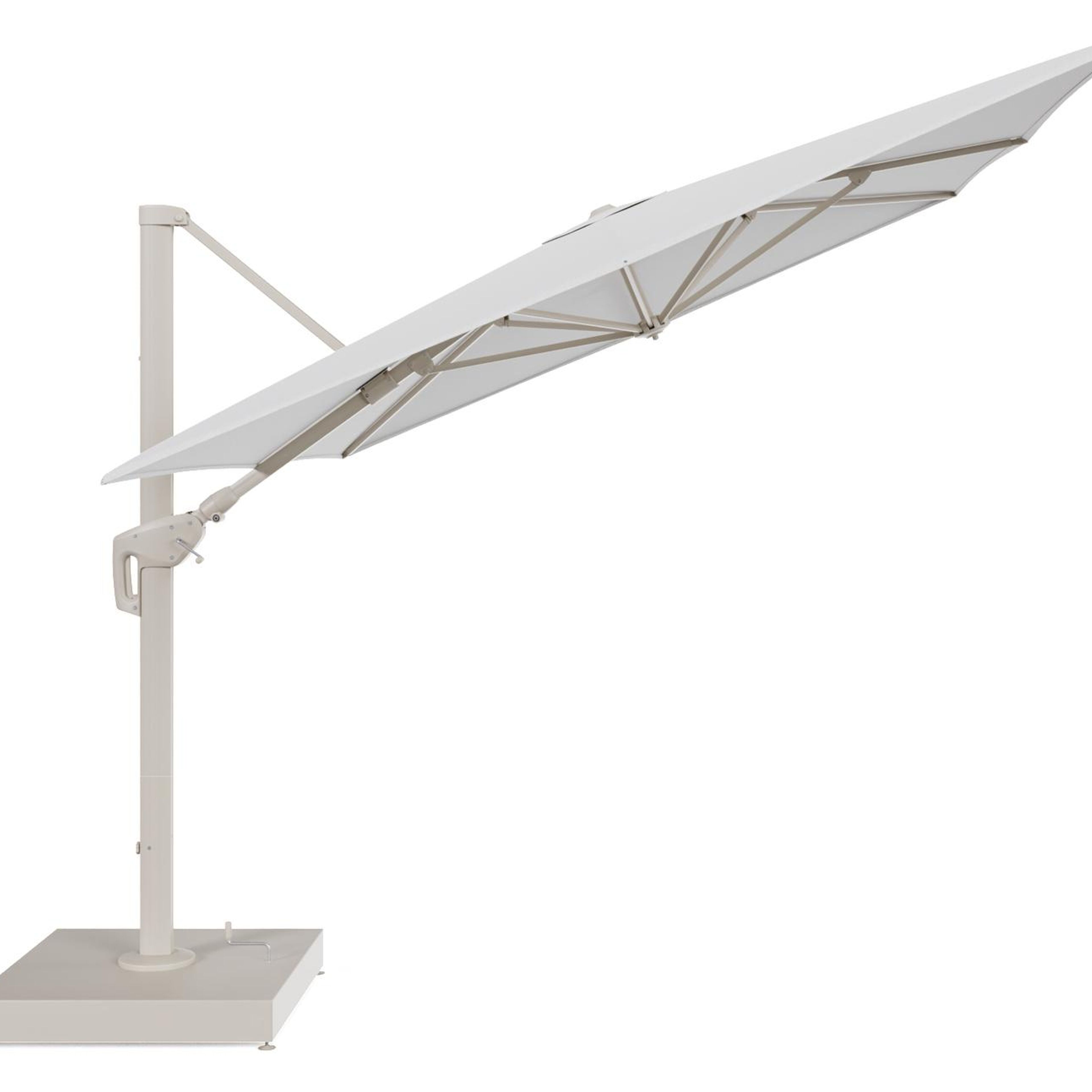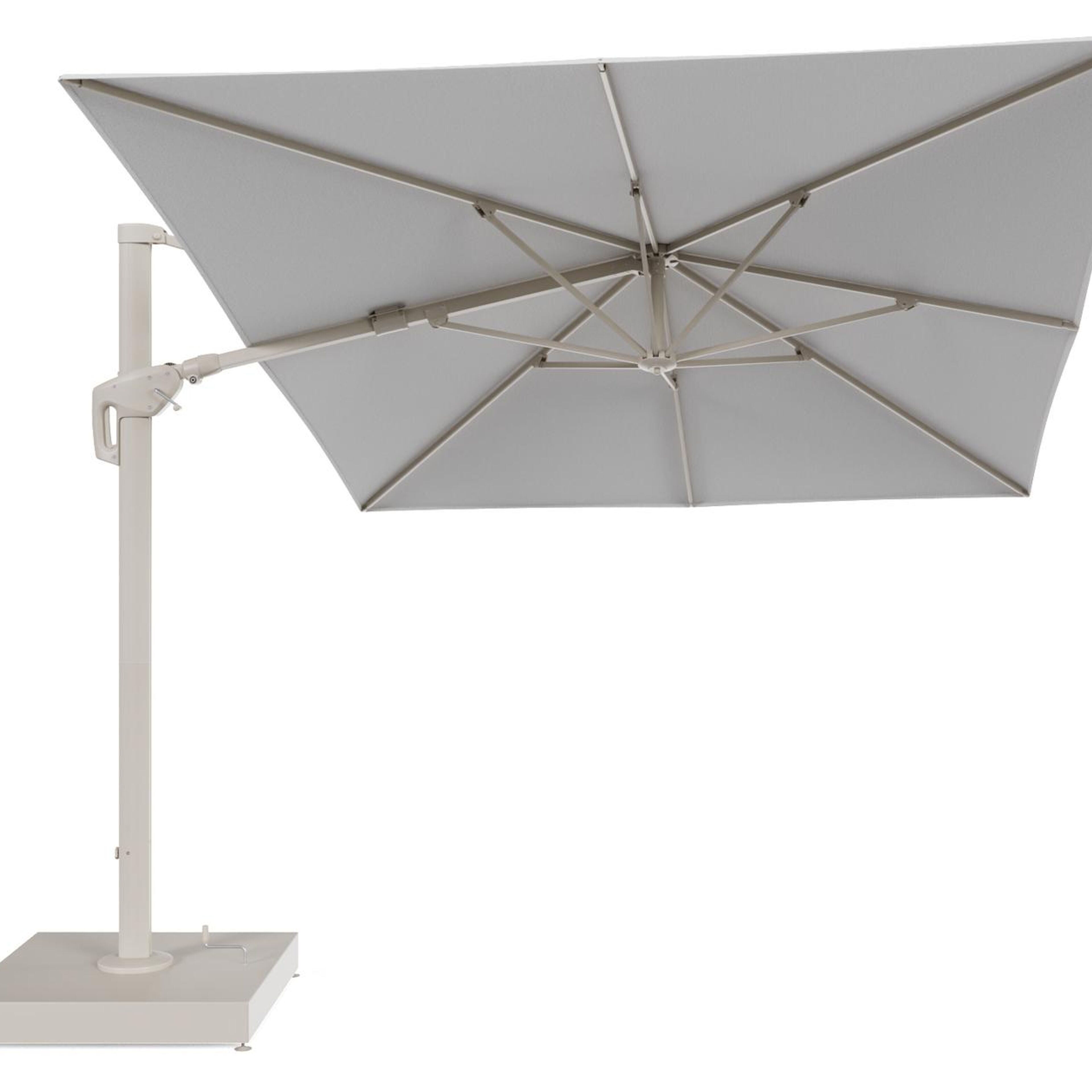 Minore zweefparasol met tiltfunctie in beige aluminium en Ego Birch All Weather Solica parasoldoek - L1 400 x L2 300 cm met parasolvoet Minore 260 kg met wielen | Exterioo tuinmeubelen