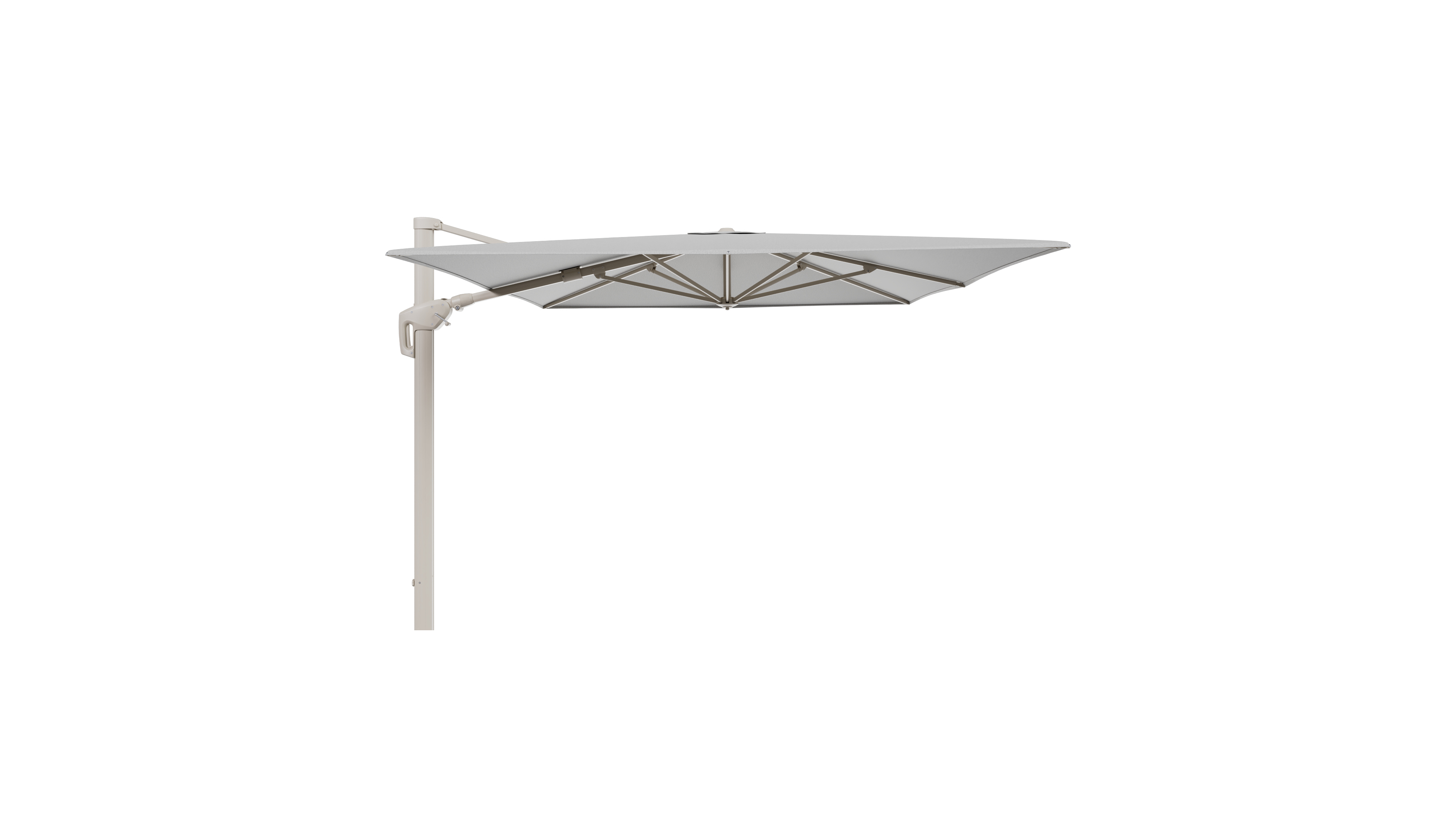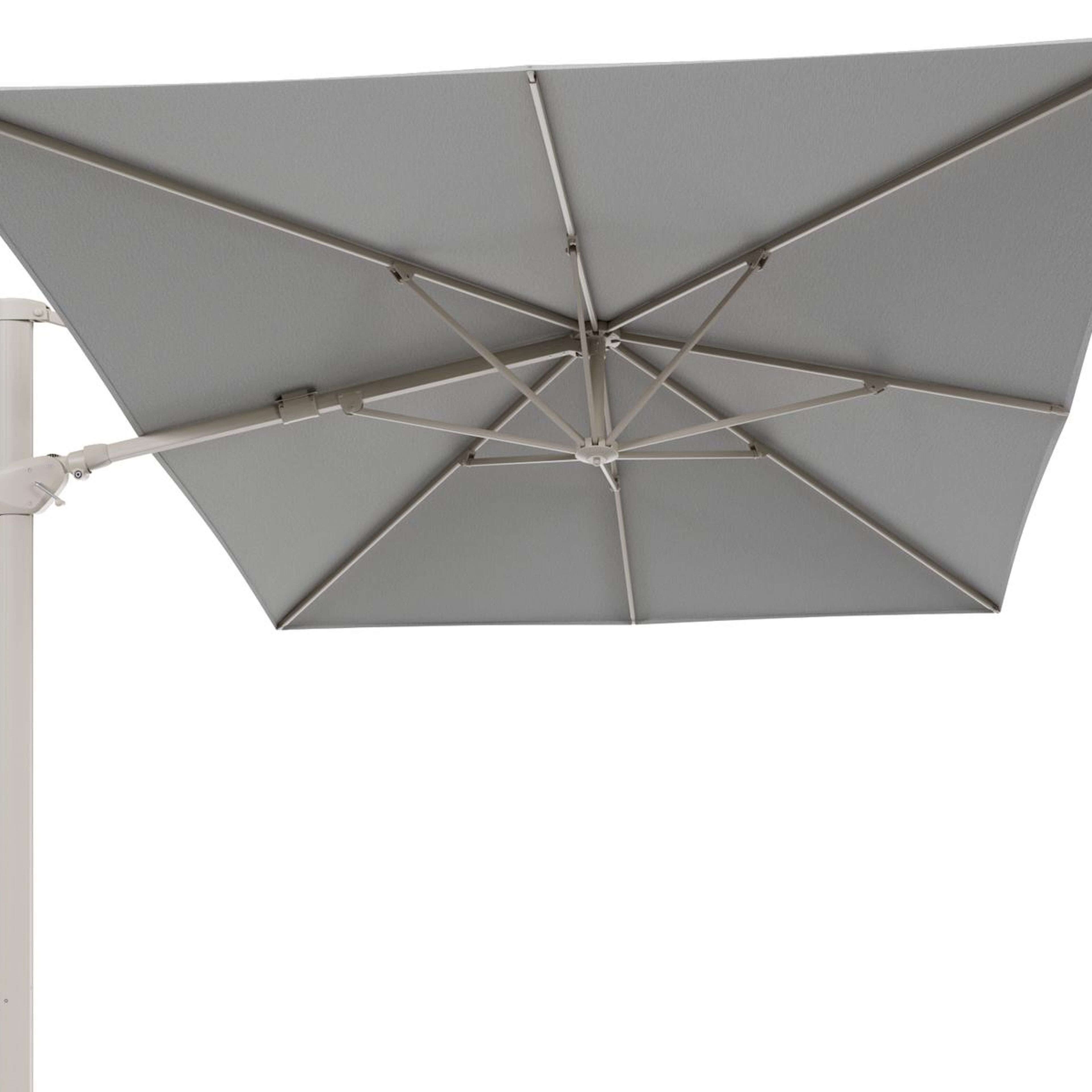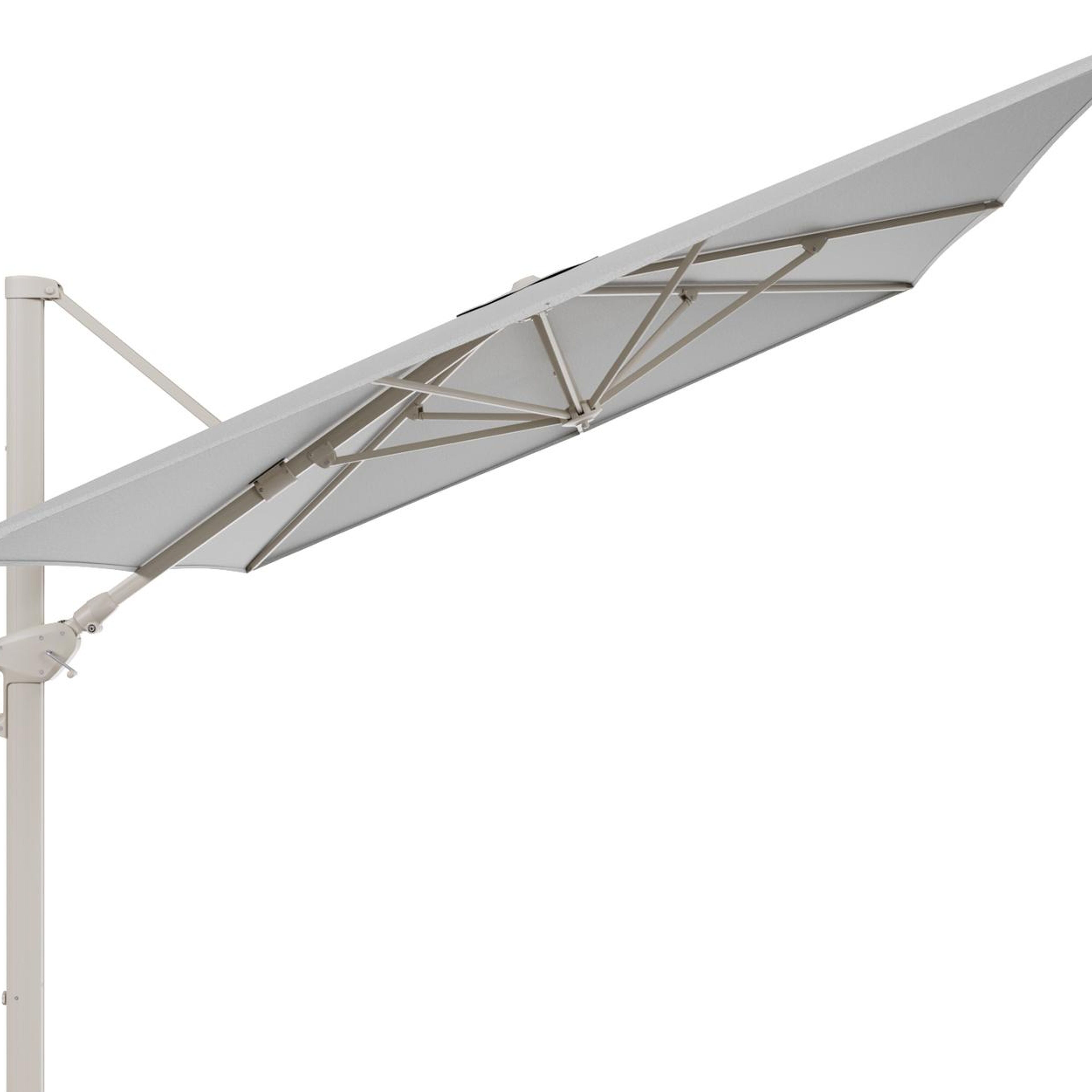 Het frame van de parasol is gemaakt uit roestvrij aluminium. Dit sterke en onderhoudsvriendelijke materiaal zorgt voor een stevige constructie en een moderne uitstraling.