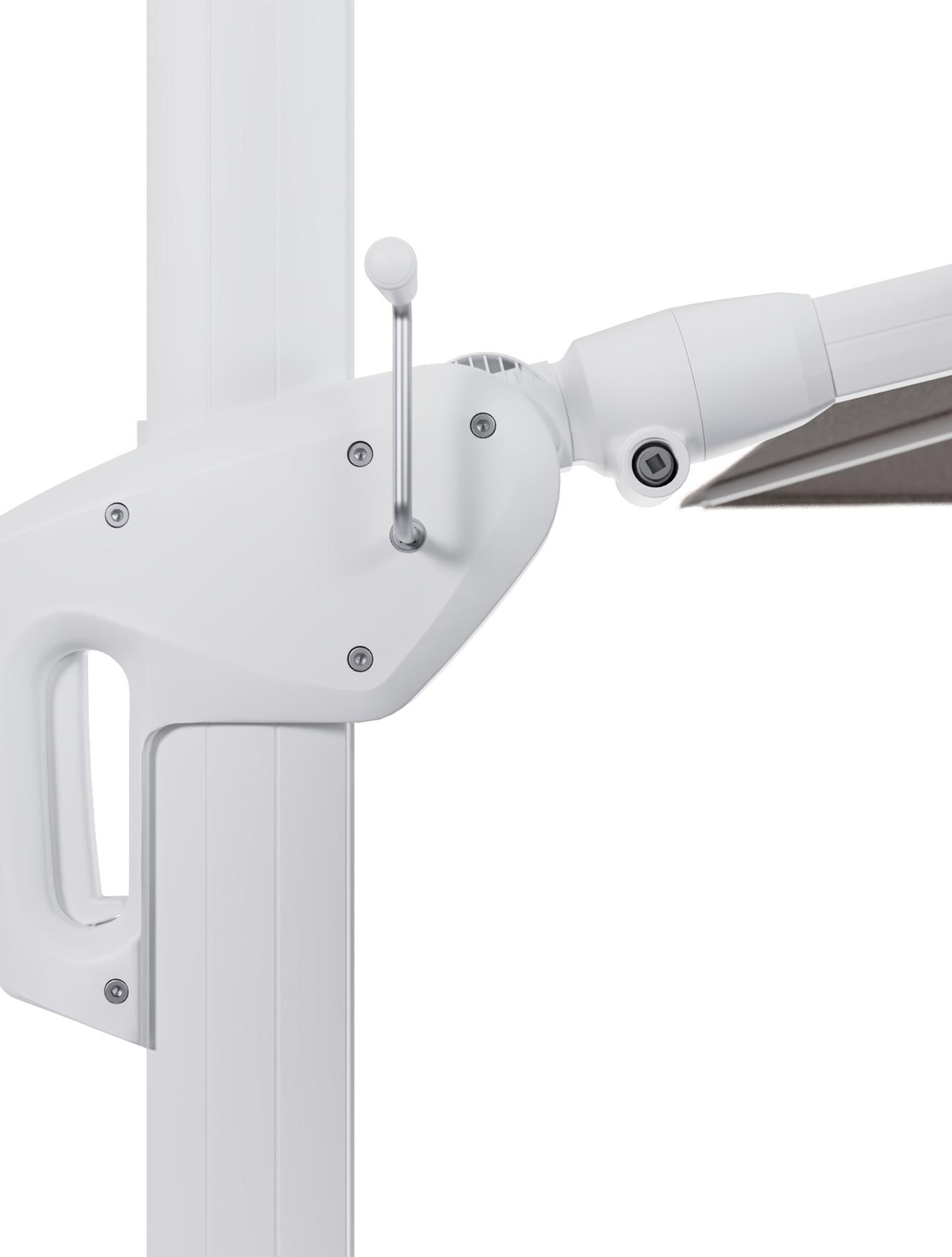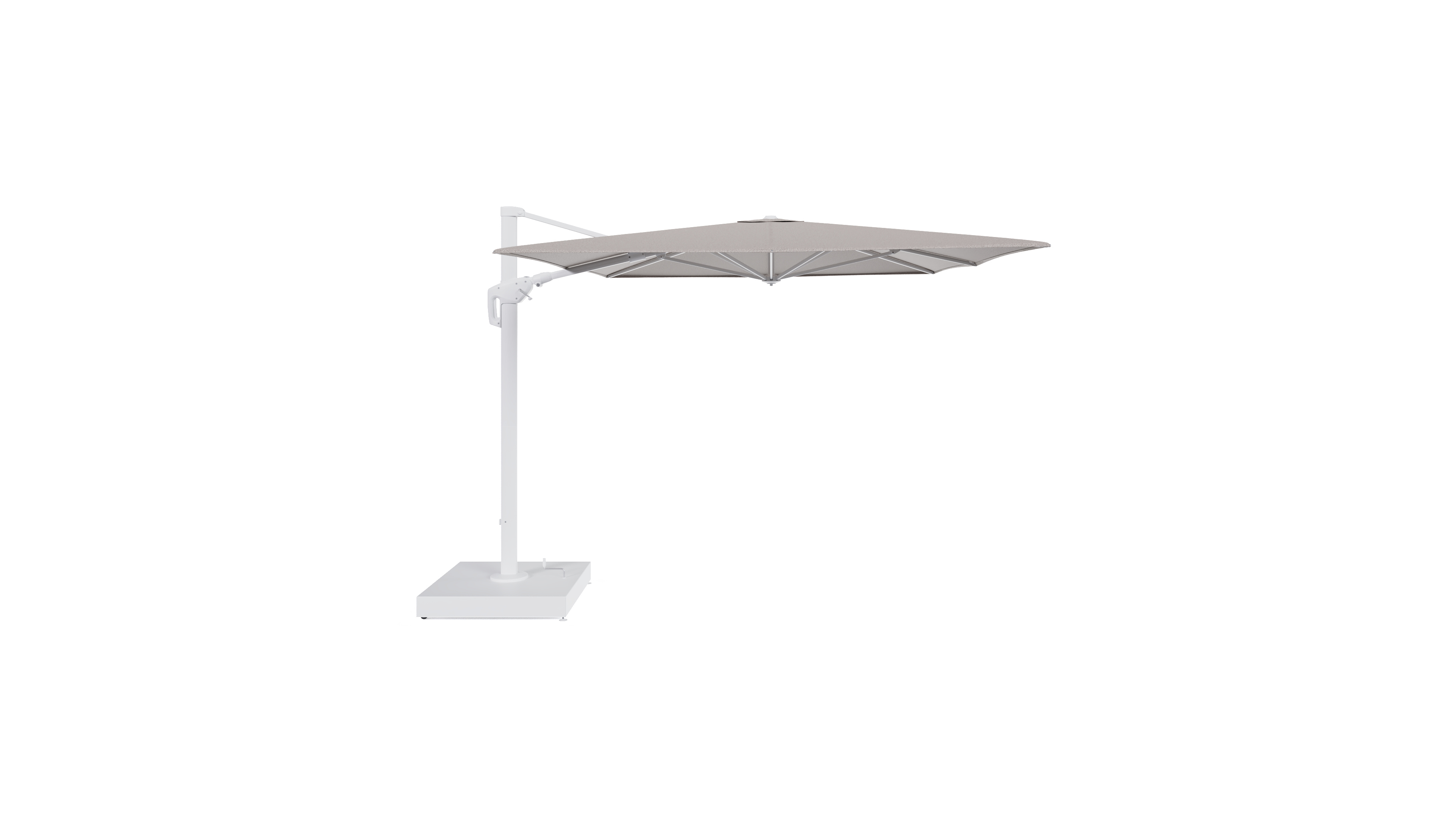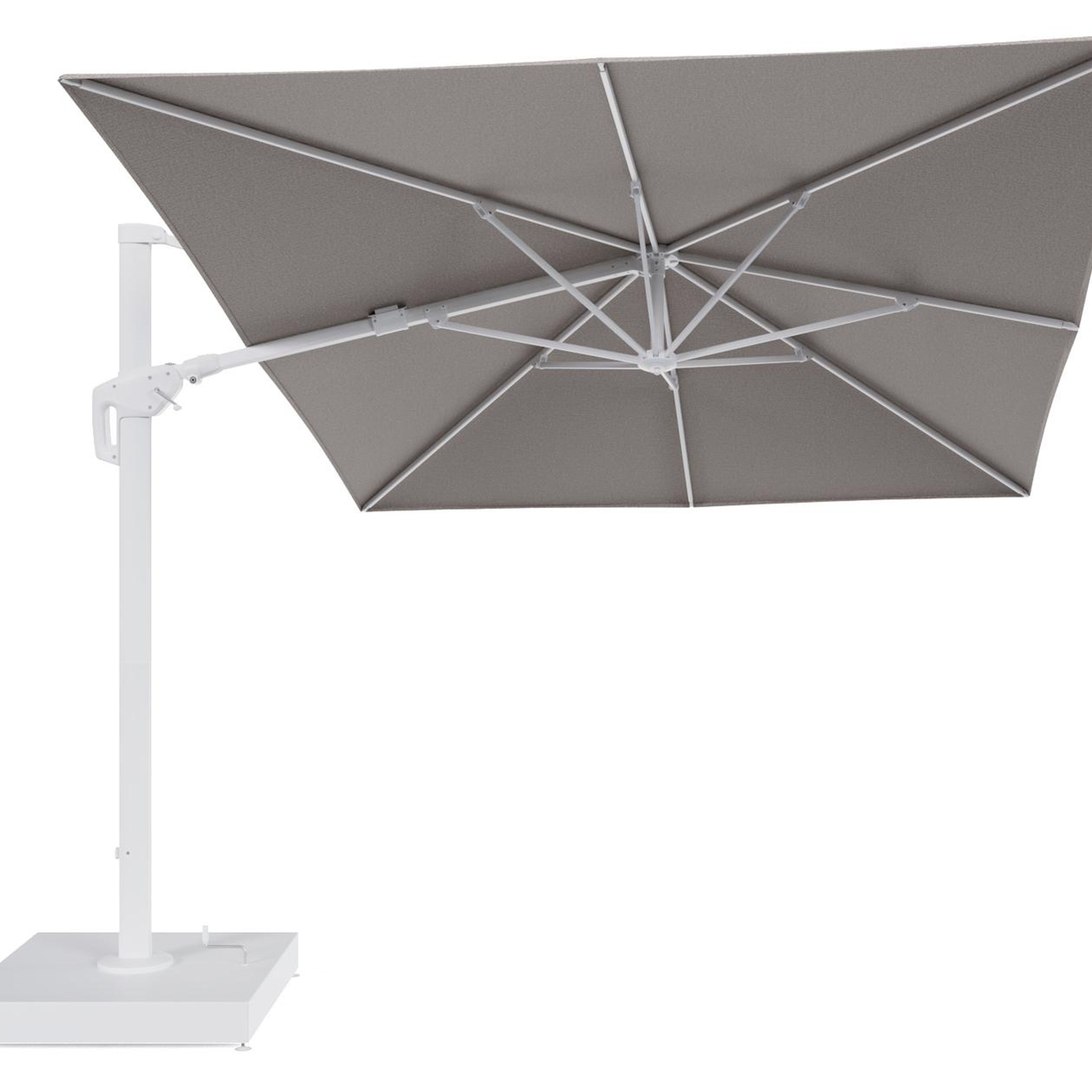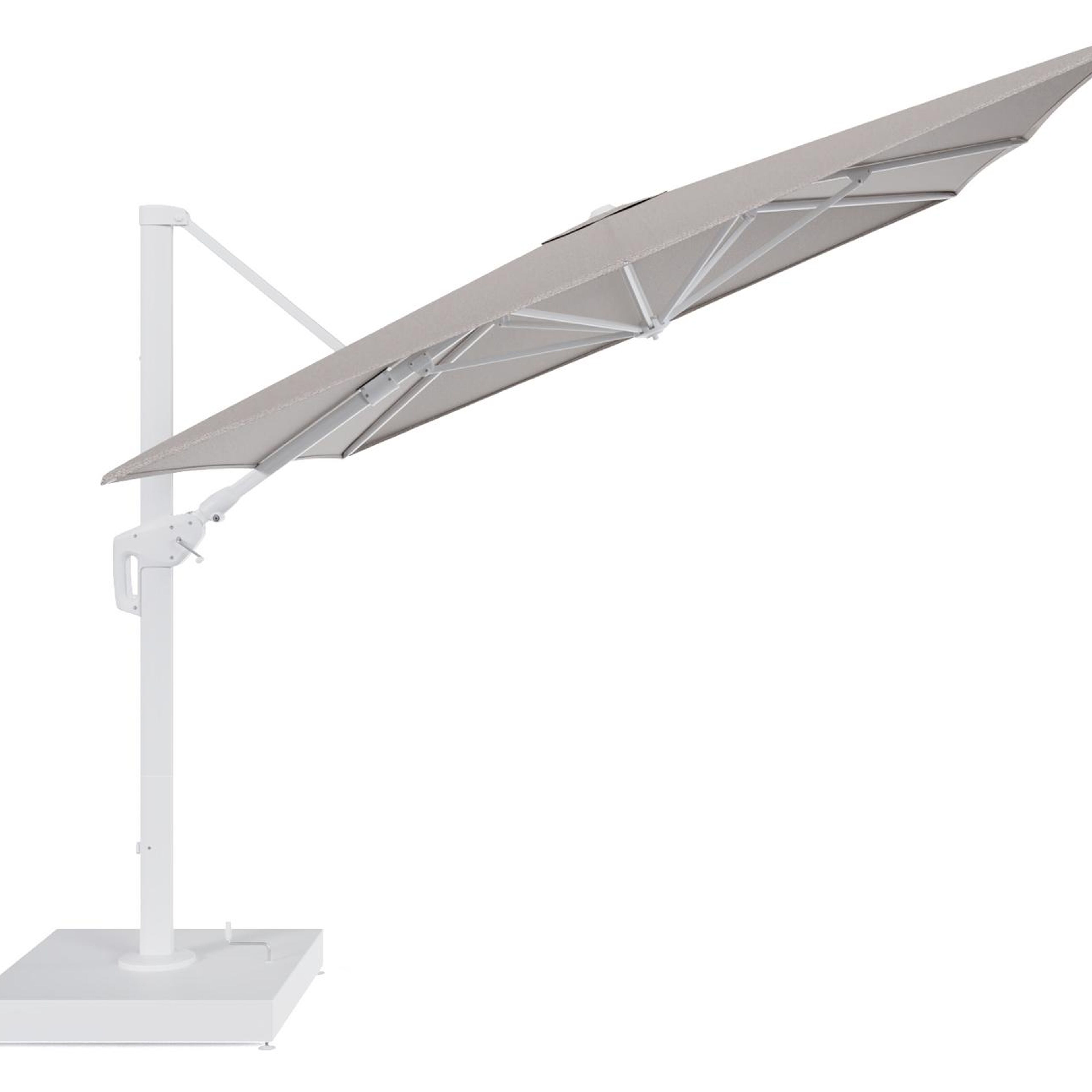 Minore zweefparasol met tiltfunctie in wit aluminium en Wander Granite All Weather Sunbrella® Luxe parasoldoek - L1 400 x L2 300 cm met parasolvoet Minore 260 kg met wielen | Exterioo tuinmeubelen