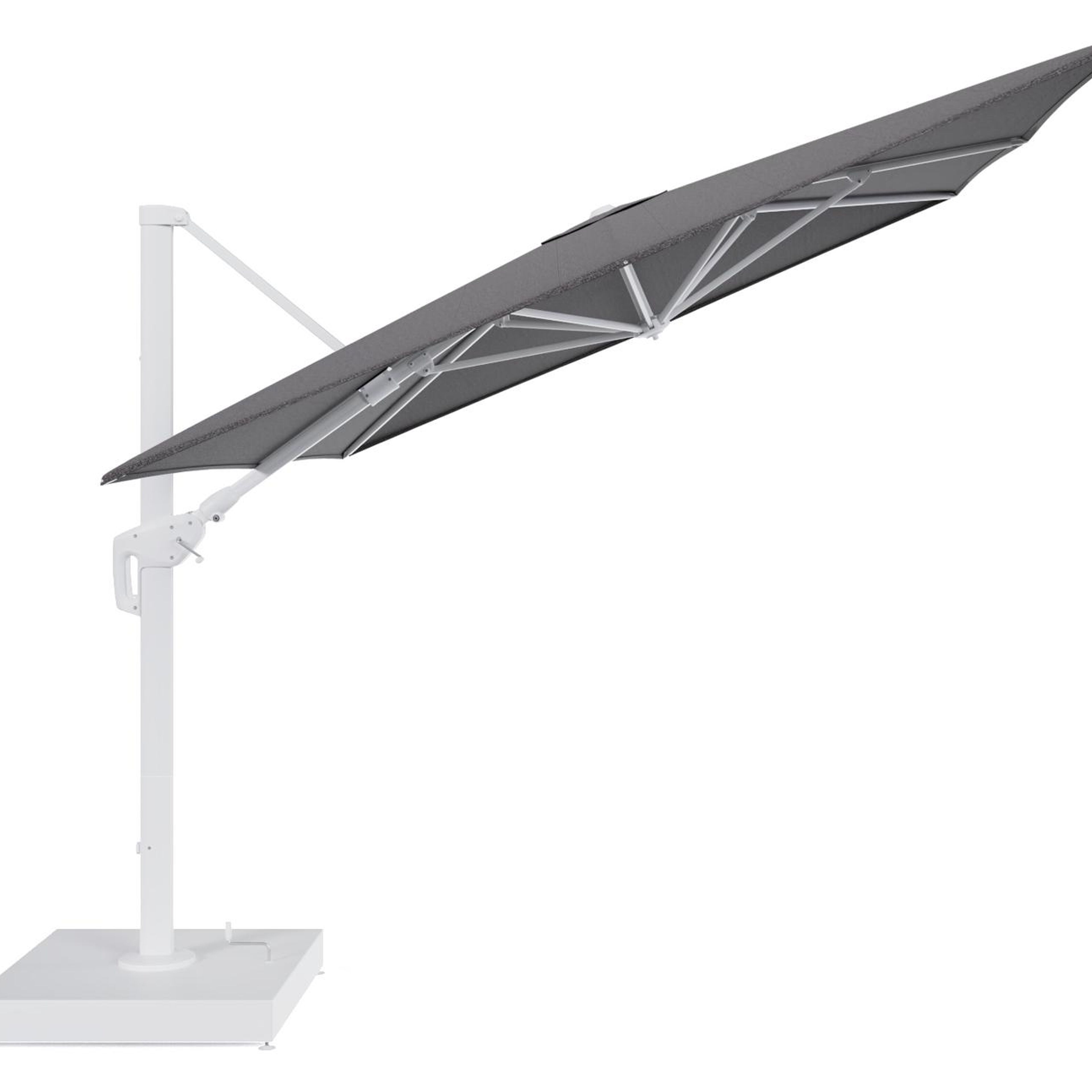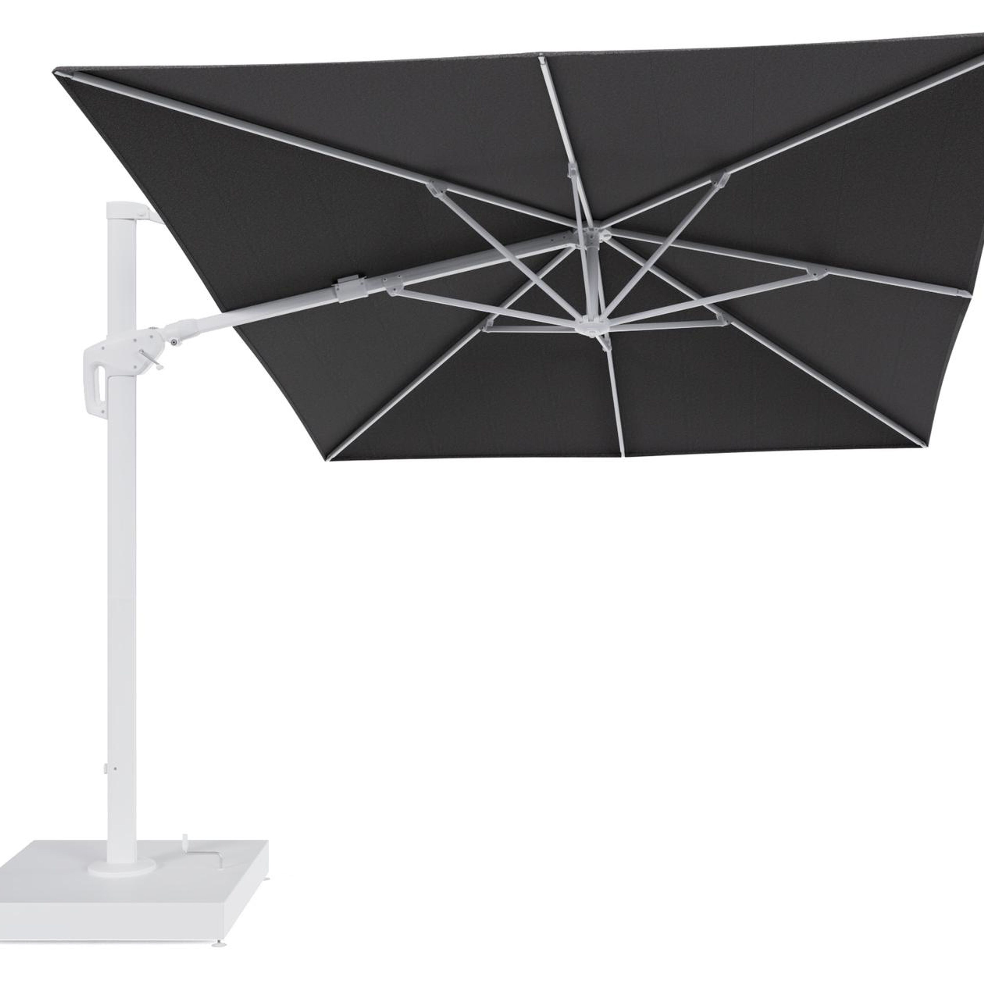 Minore zweefparasol met tiltfunctie in wit aluminium en Firenze Tunder All Weather Solica parasoldoek - L1 400 x L2 300 cm met parasolvoet Minore 260 kg met wielen | Exterioo tuinmeubelen
