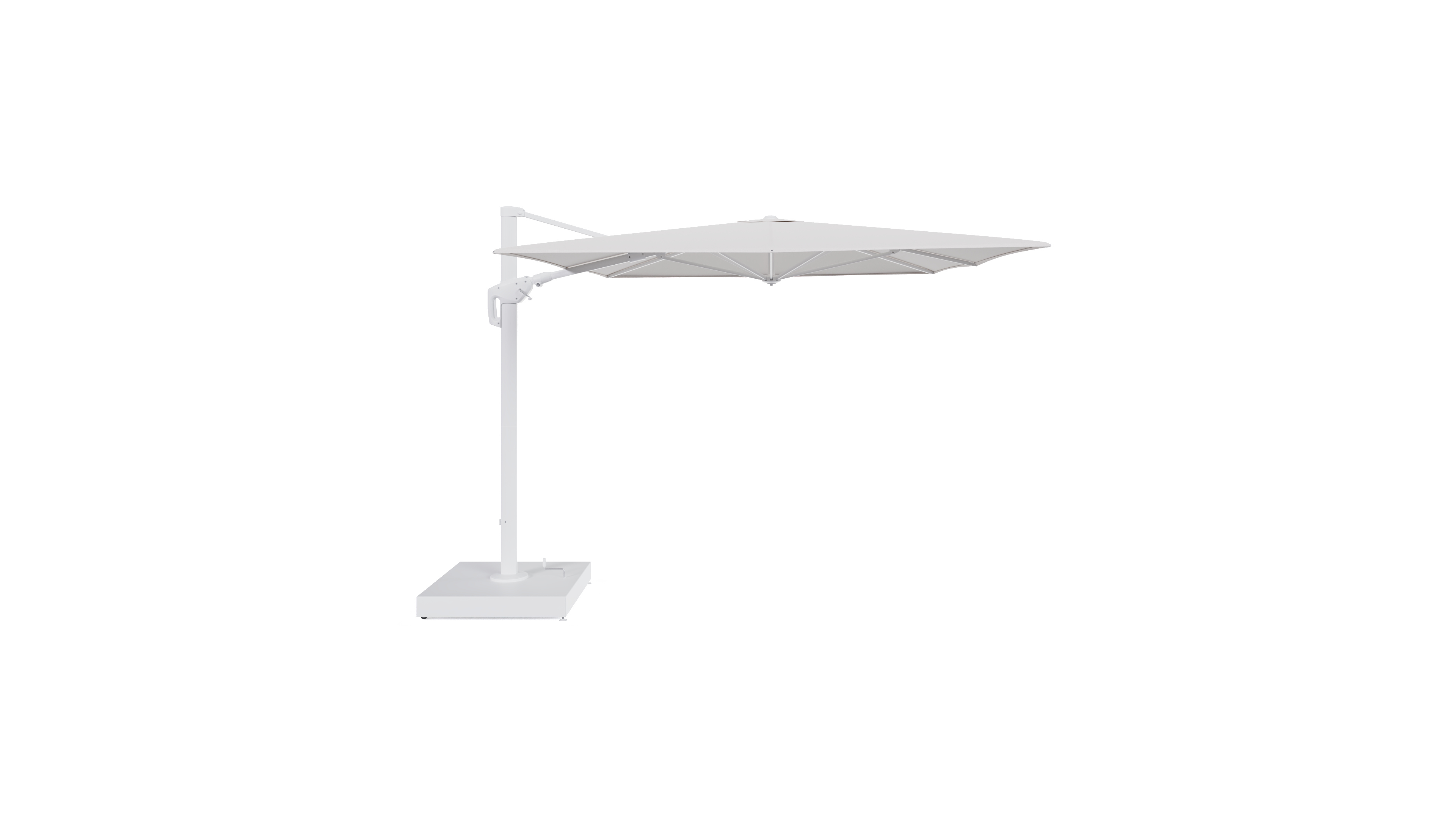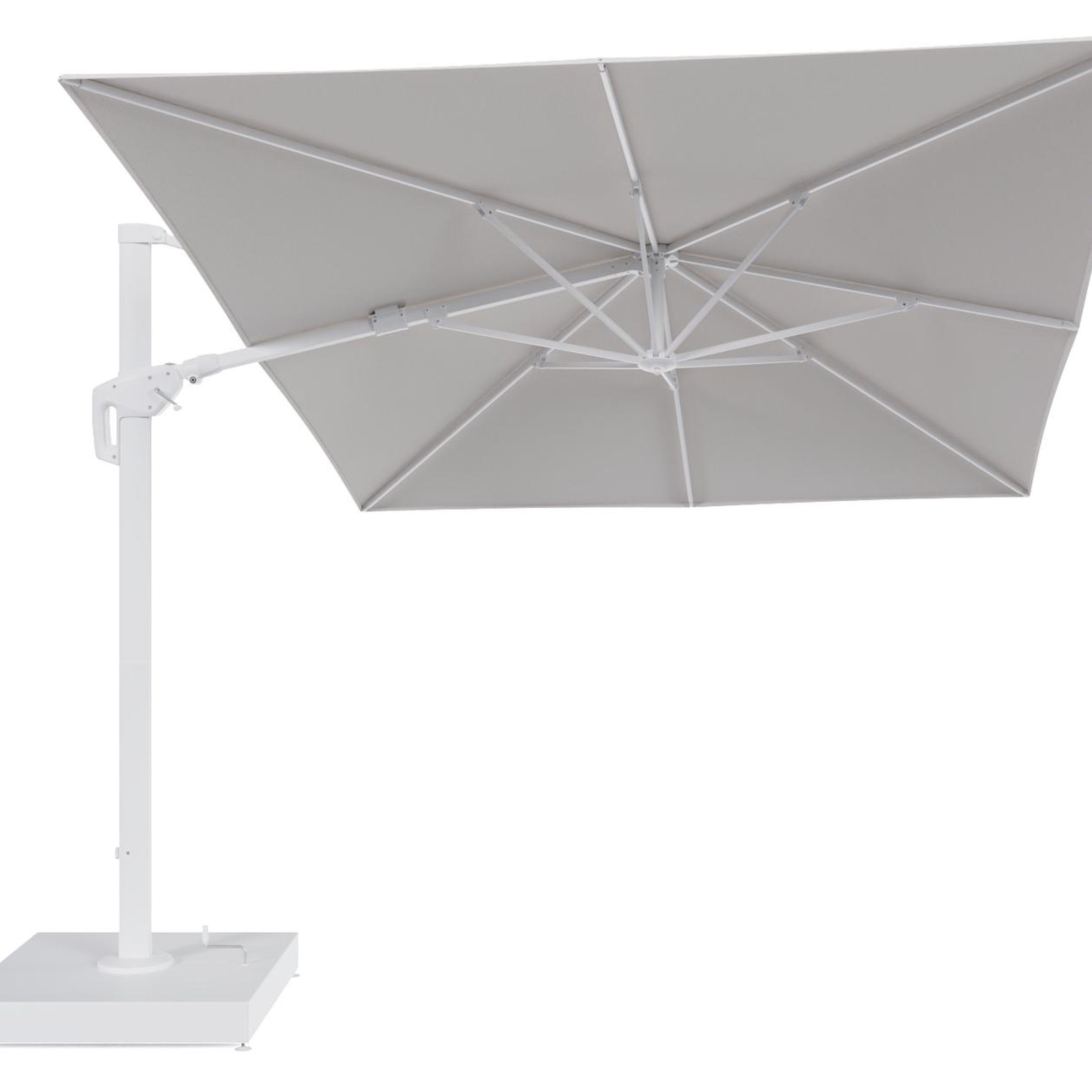 Minore zweefparasol met tiltfunctie in wit aluminium en Ego Eggshell All Weather Solica parasoldoek - L1 400 x L2 300 cm met parasolvoet Minore 260 kg met wielen | Exterioo tuinmeubelen