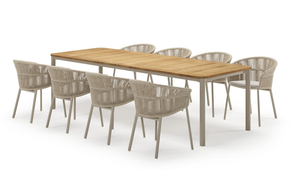De Mira tuinset, is een elegante toevoeging voor je buitenruimte. De ronde poten en het afgerond rechthoekig tafelblad, geeft de tafel een hedendaags design.