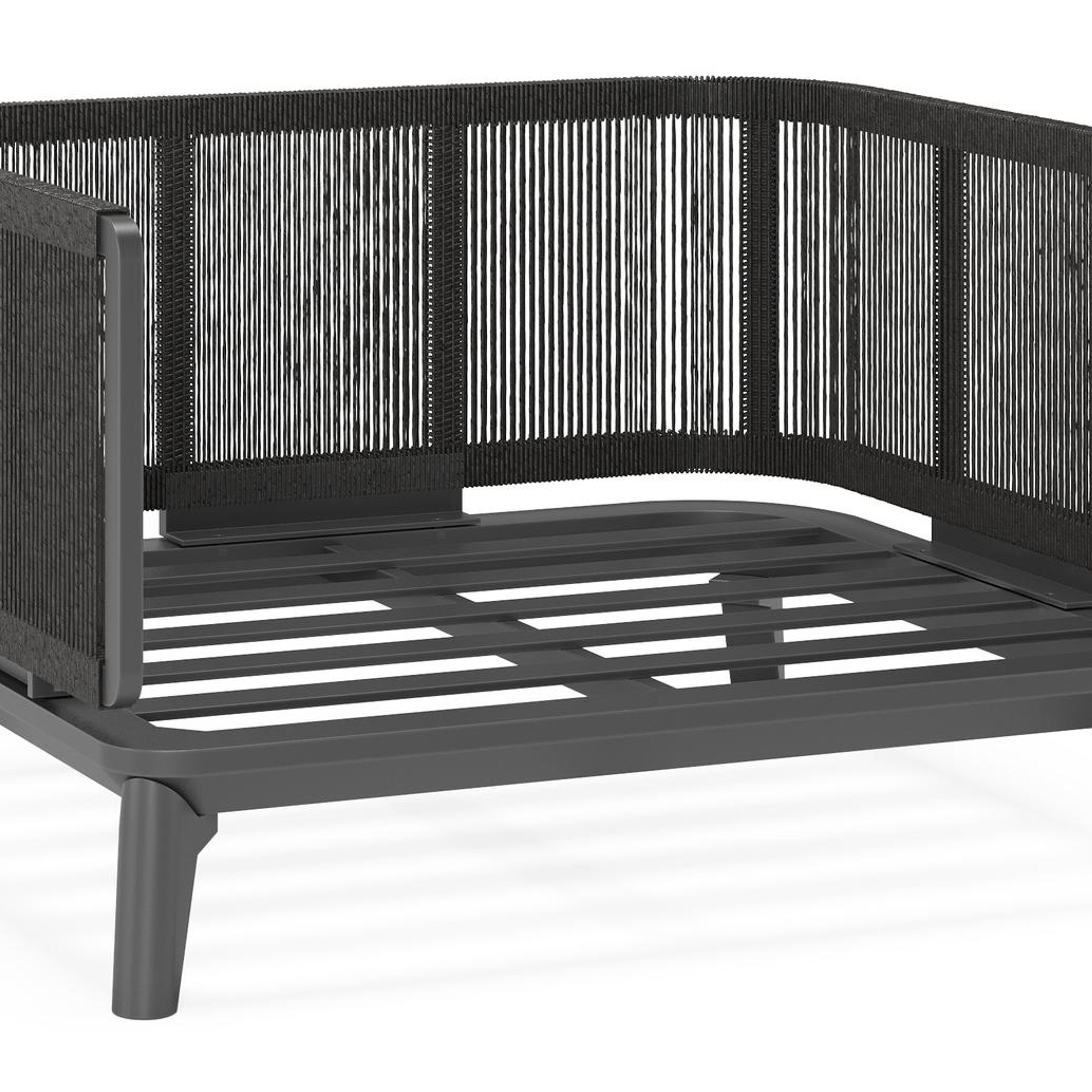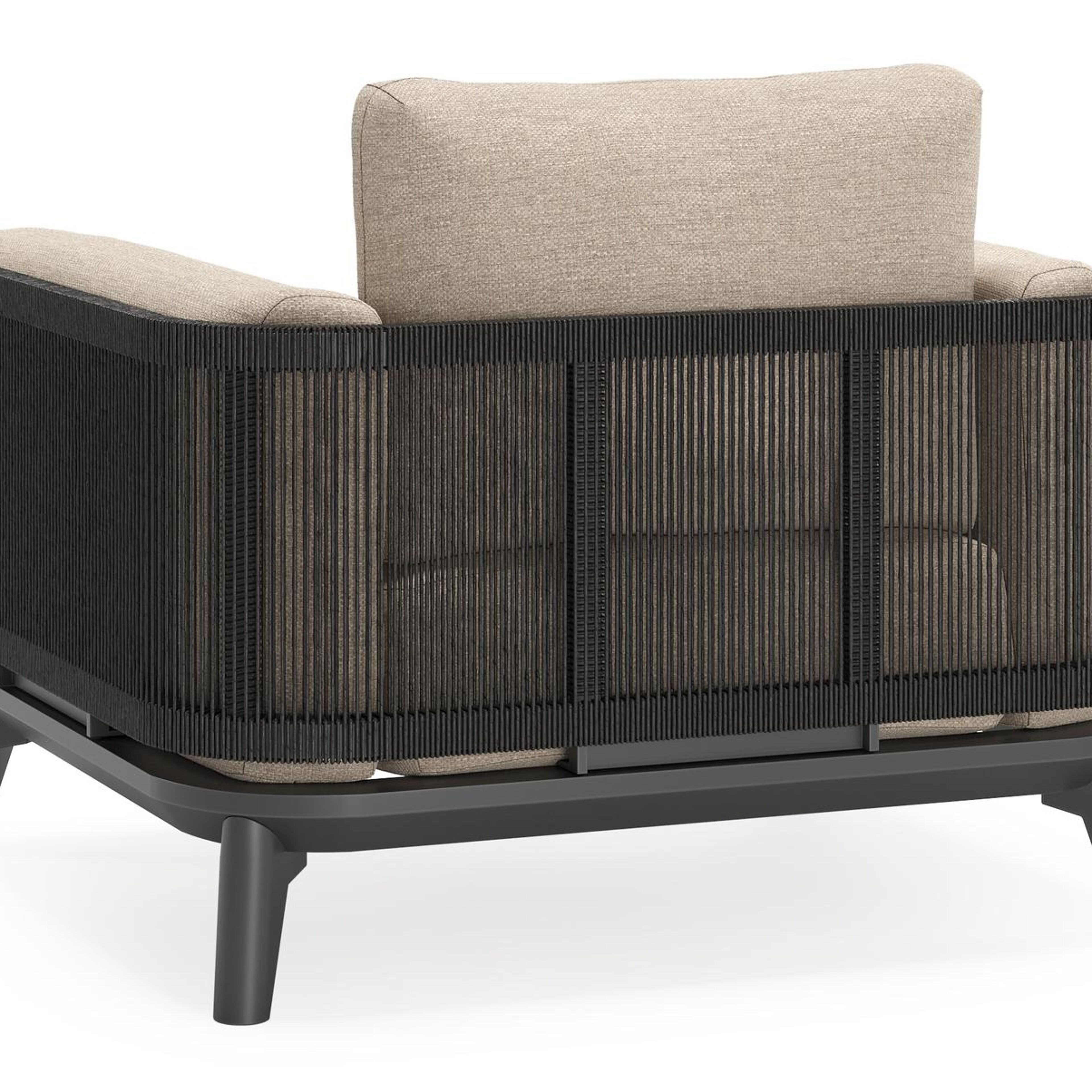 Het frame van de lounge is bekleed met rope, een stevige polyester met trendy uiterlijk. Rope staat gekend om zijn water- en vuilafstotende eigenschappen. Het materiaal is makkelijk te onderhouden.