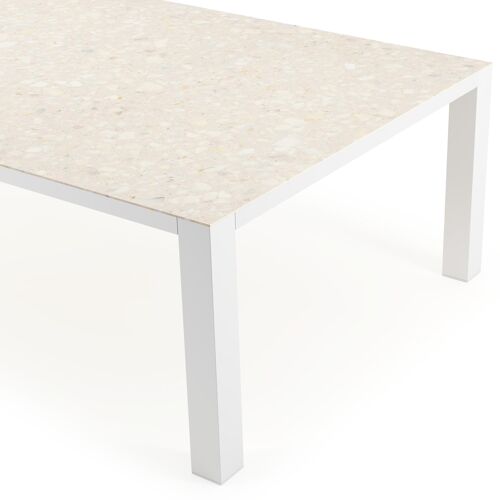 Het Retrostone tafelblad heeft een elegant oppervlak dat gebaseerd is op traditionele terrazzo: het blad combineert verschillende grijstinten met andere zachte kleuren als roze, geel, beige, crème, etc. Het tafelblad heeft een subtiele glans in de witte stukjes en voegt kracht en expressiviteit toe aan je buitenruimte.