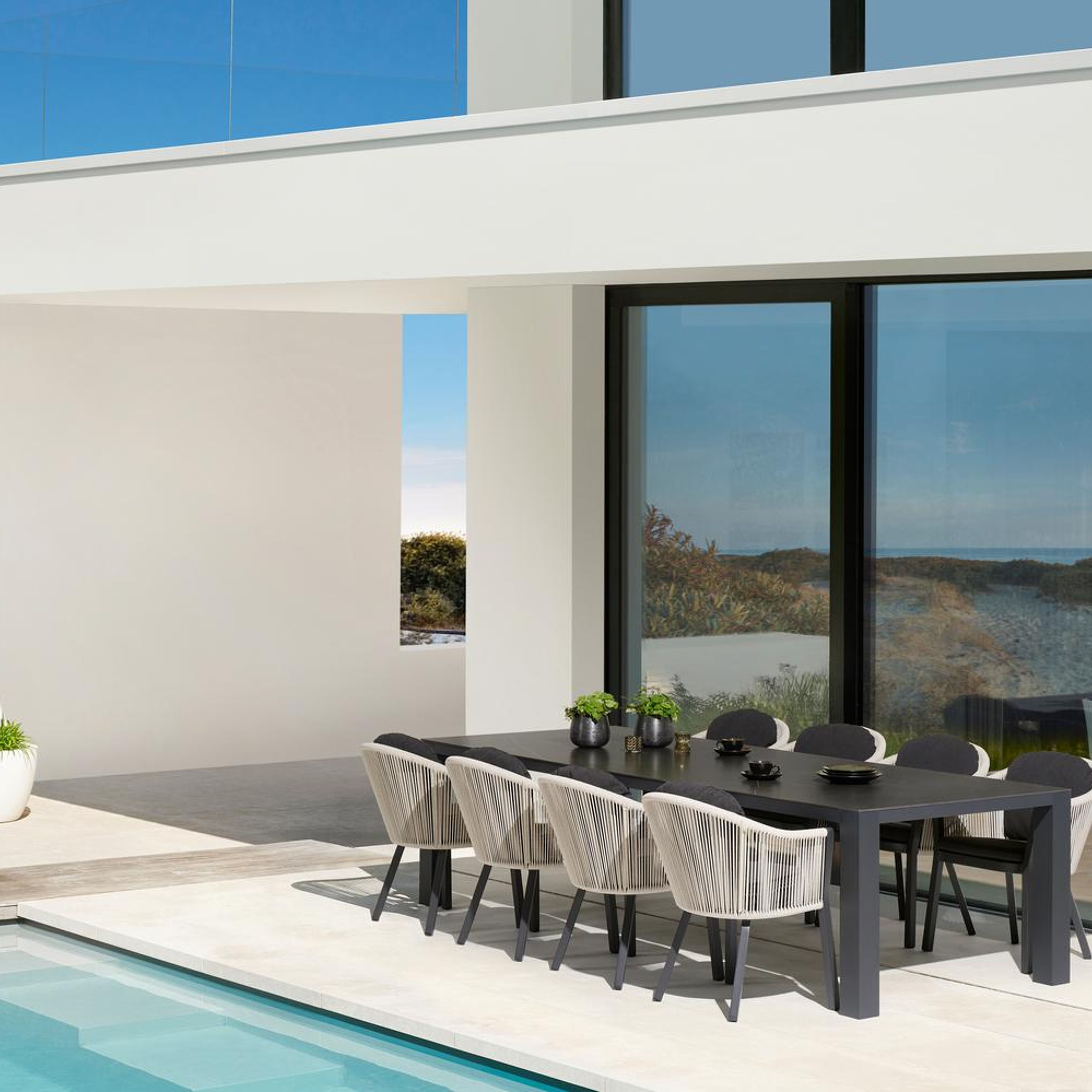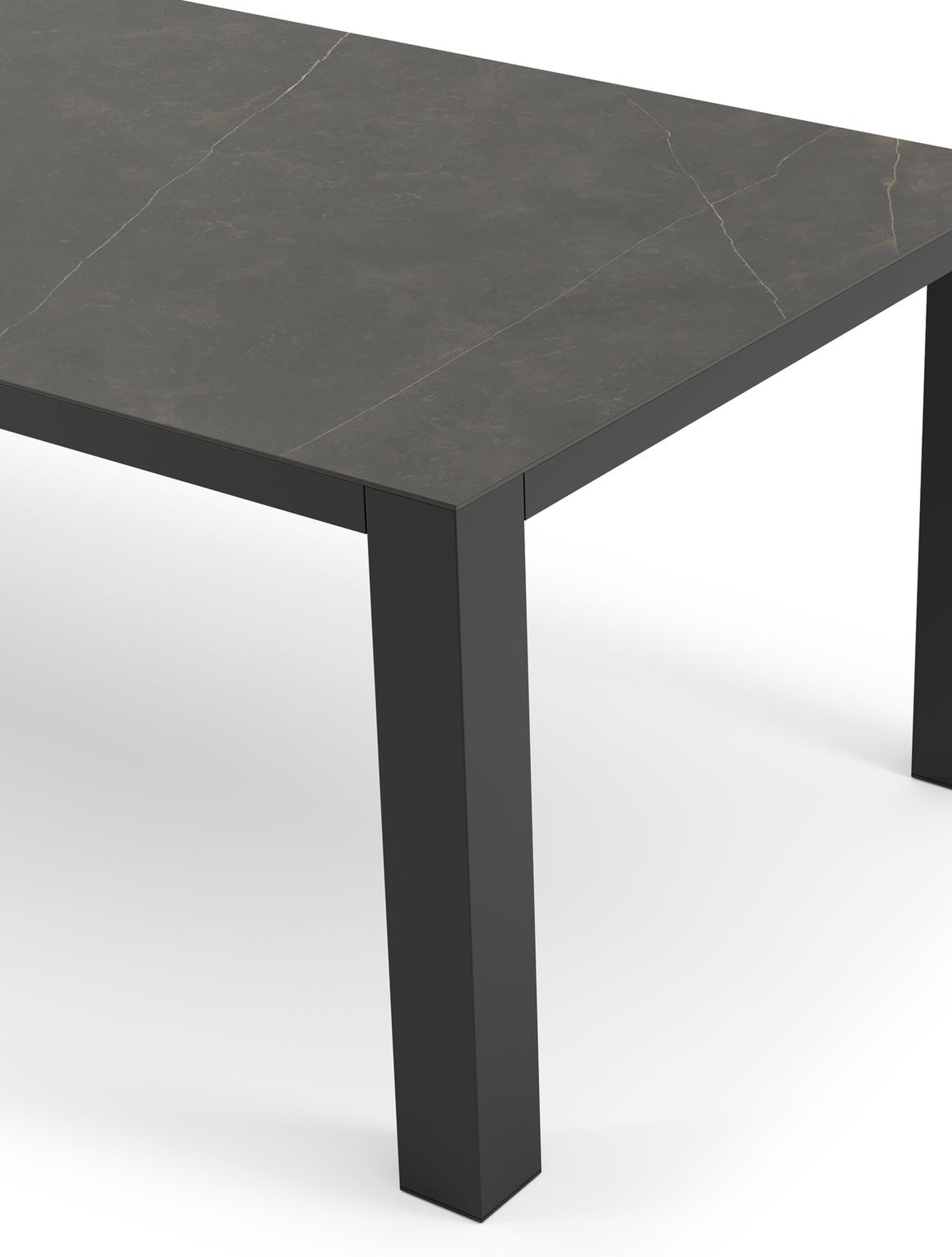 De Nano tuintafel weerspiegelt een robuuste vorm uit door de stevig blokvormig poten. Het strakke ontwerp past daarom perfect in een hedendaagse of moderne stijl.