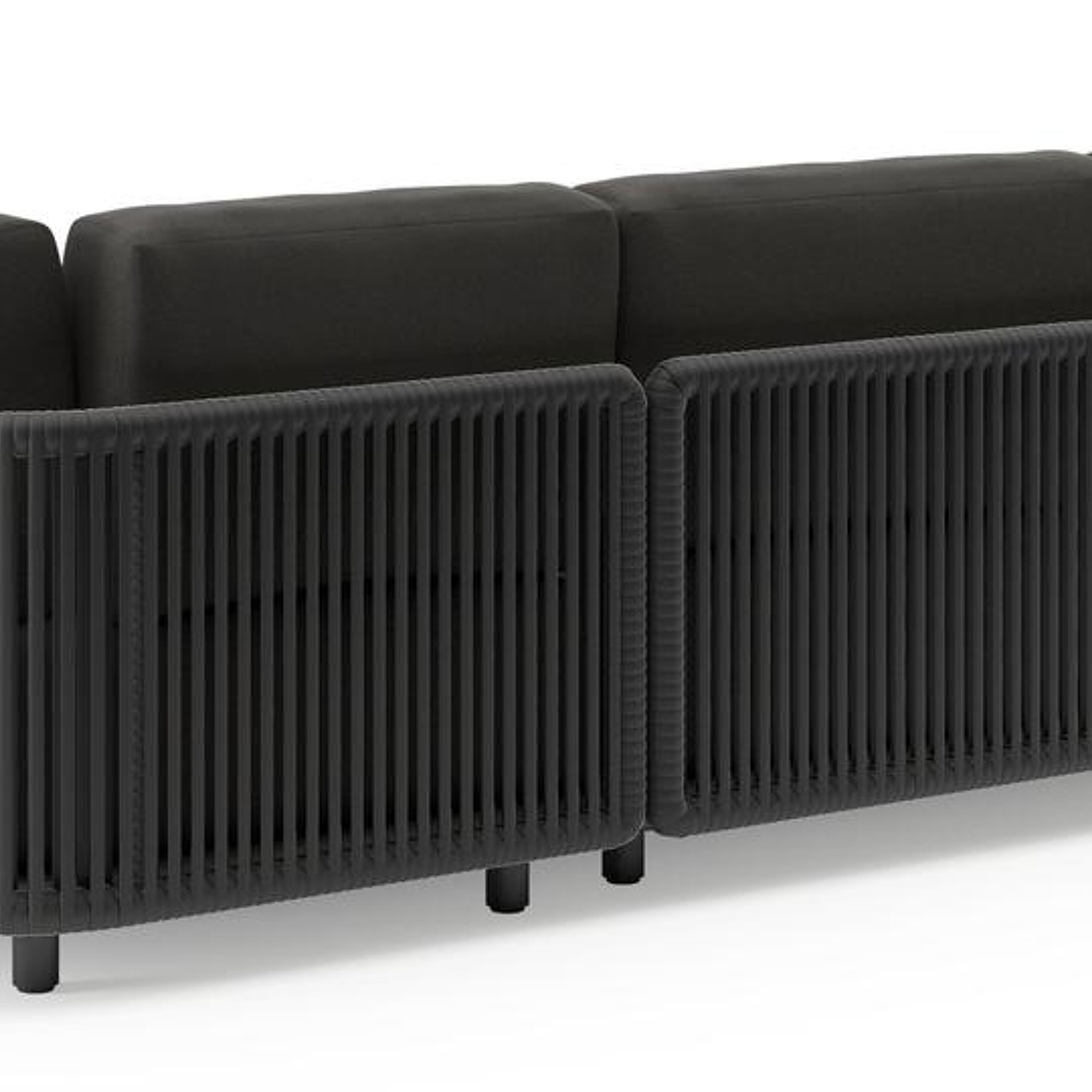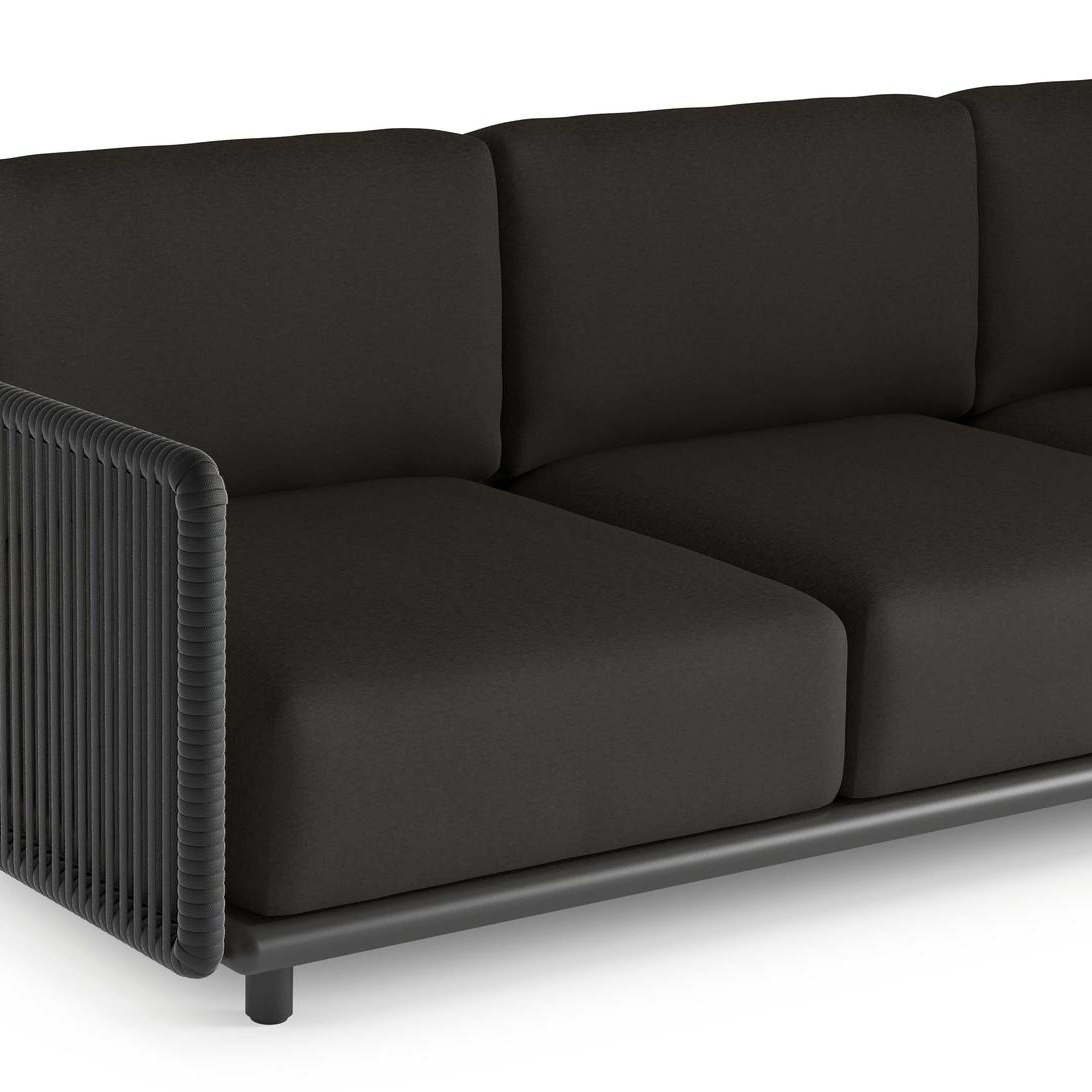 Organo loungehoek in zwart aluminium en zwart verticaal geweven luxe vlakke rope met heritage char all weather Sunbrella® luxe kussen | Exterioo tuinmeubelen