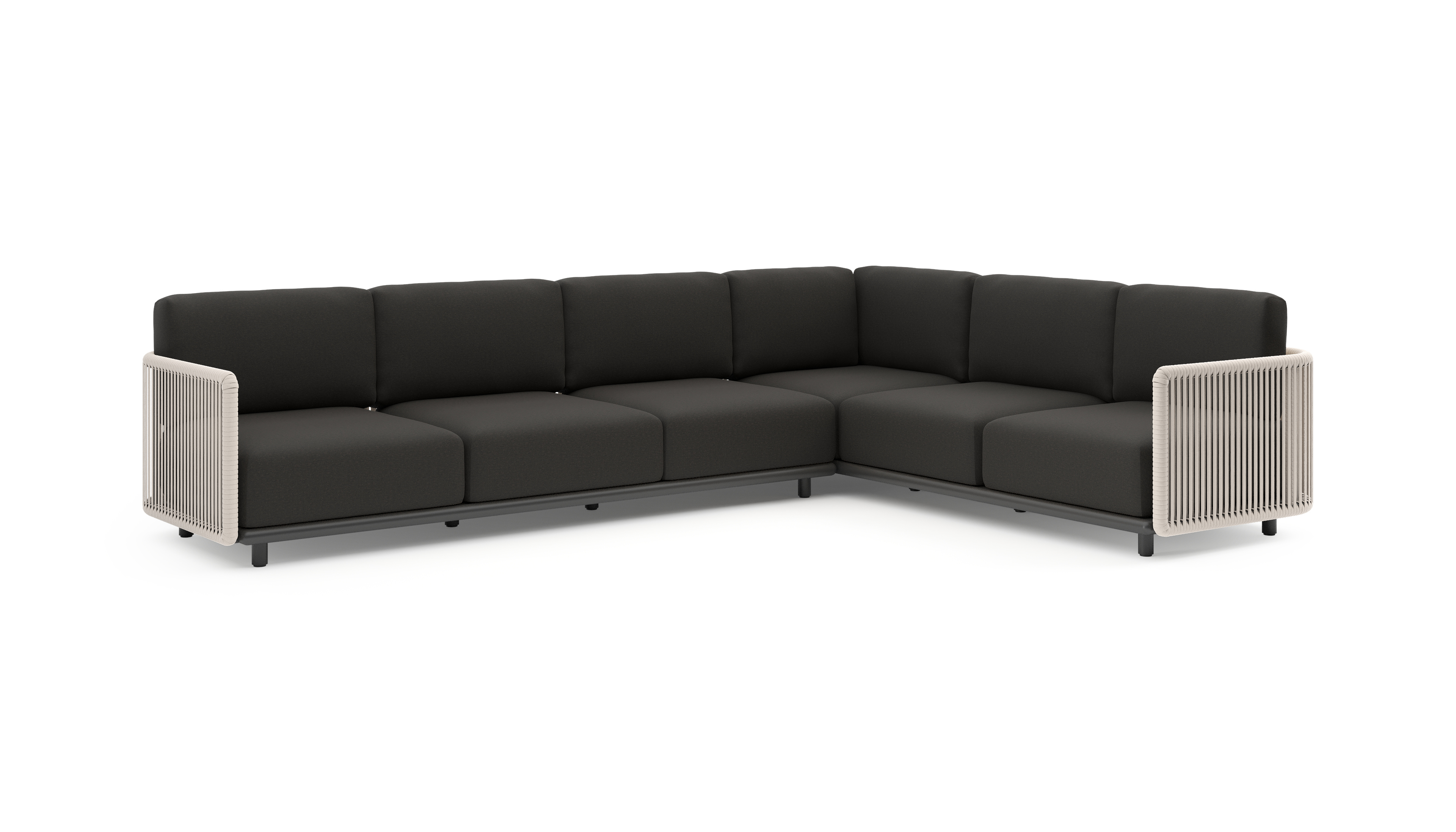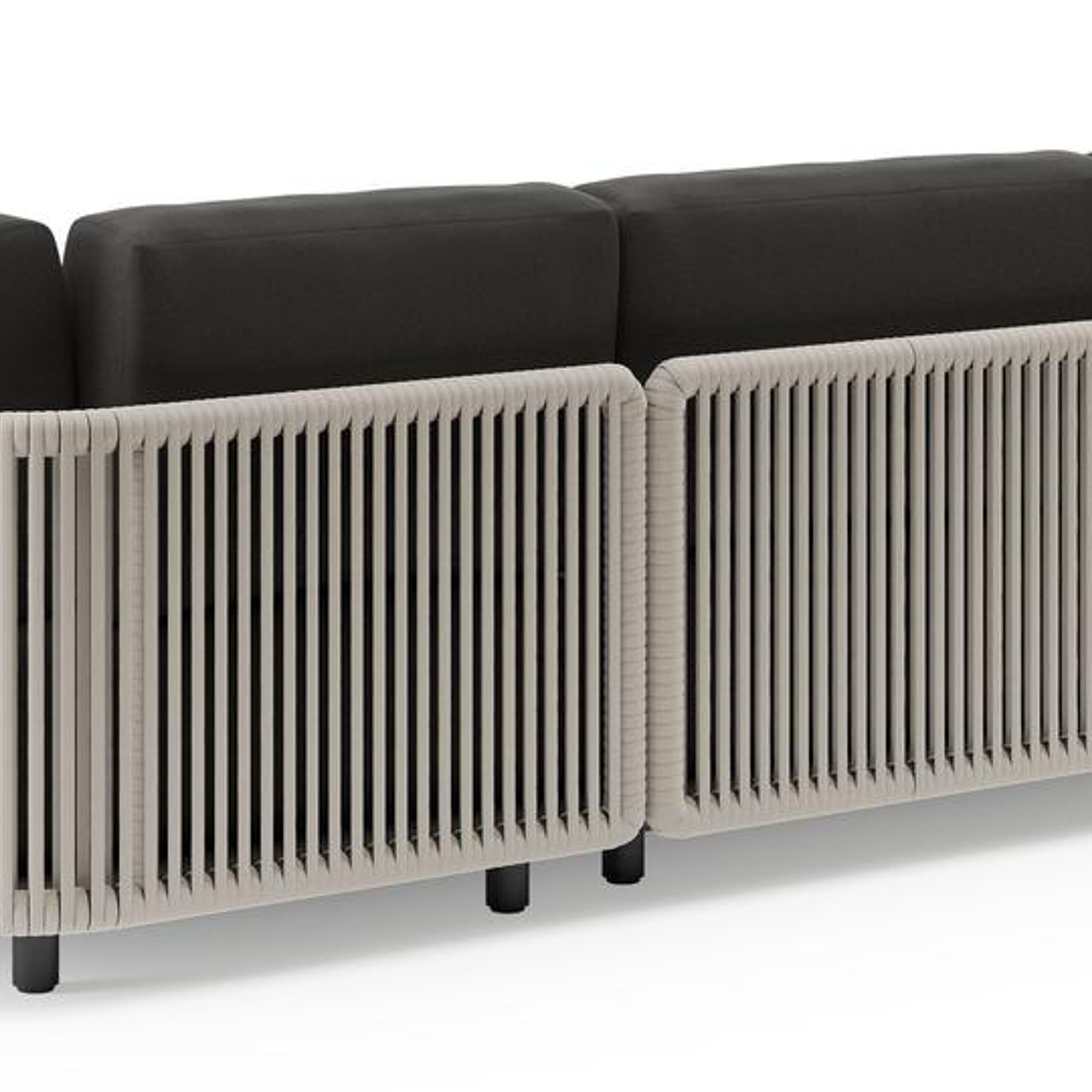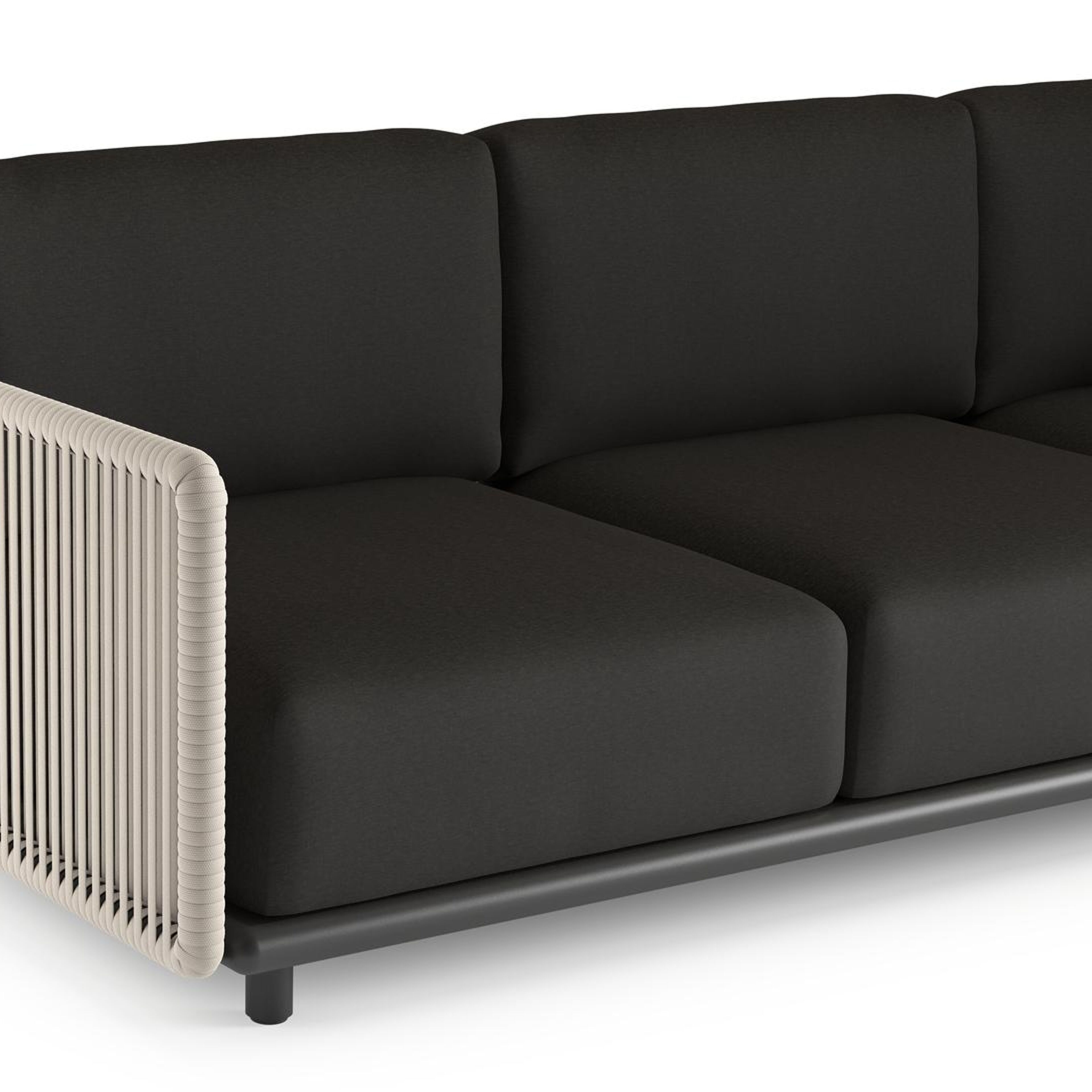Organo loungehoek in zwart aluminium en beige verticaal geweven luxe vlakke rope met heritage char all weather Sunbrella® luxe kussen | Exterioo tuinmeubelen