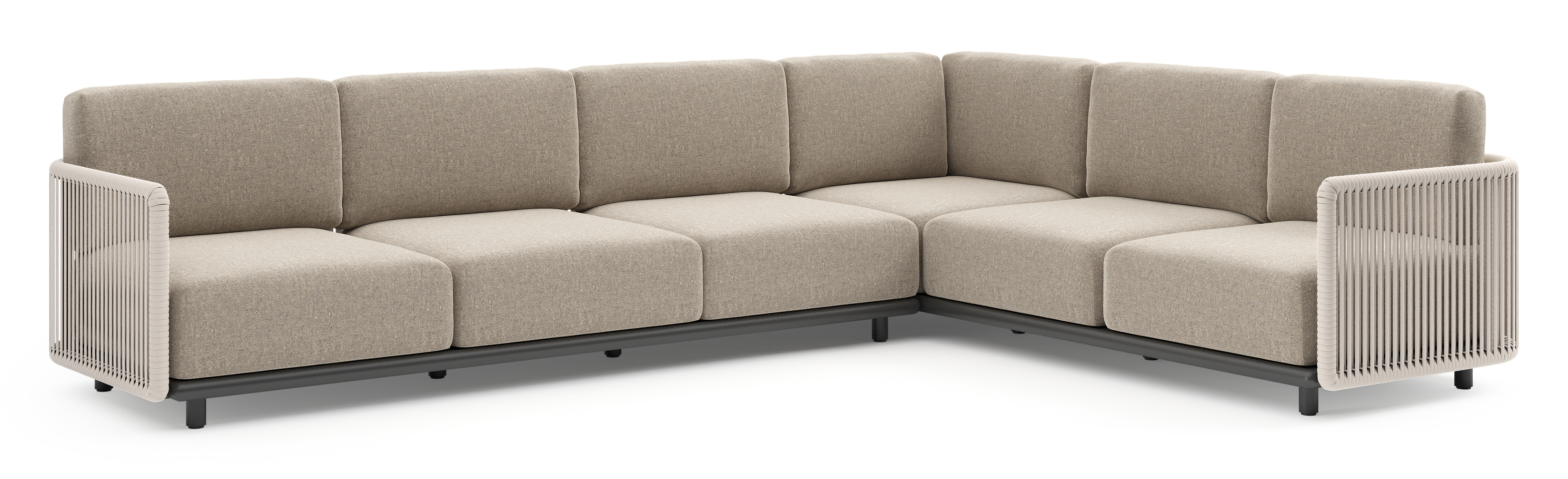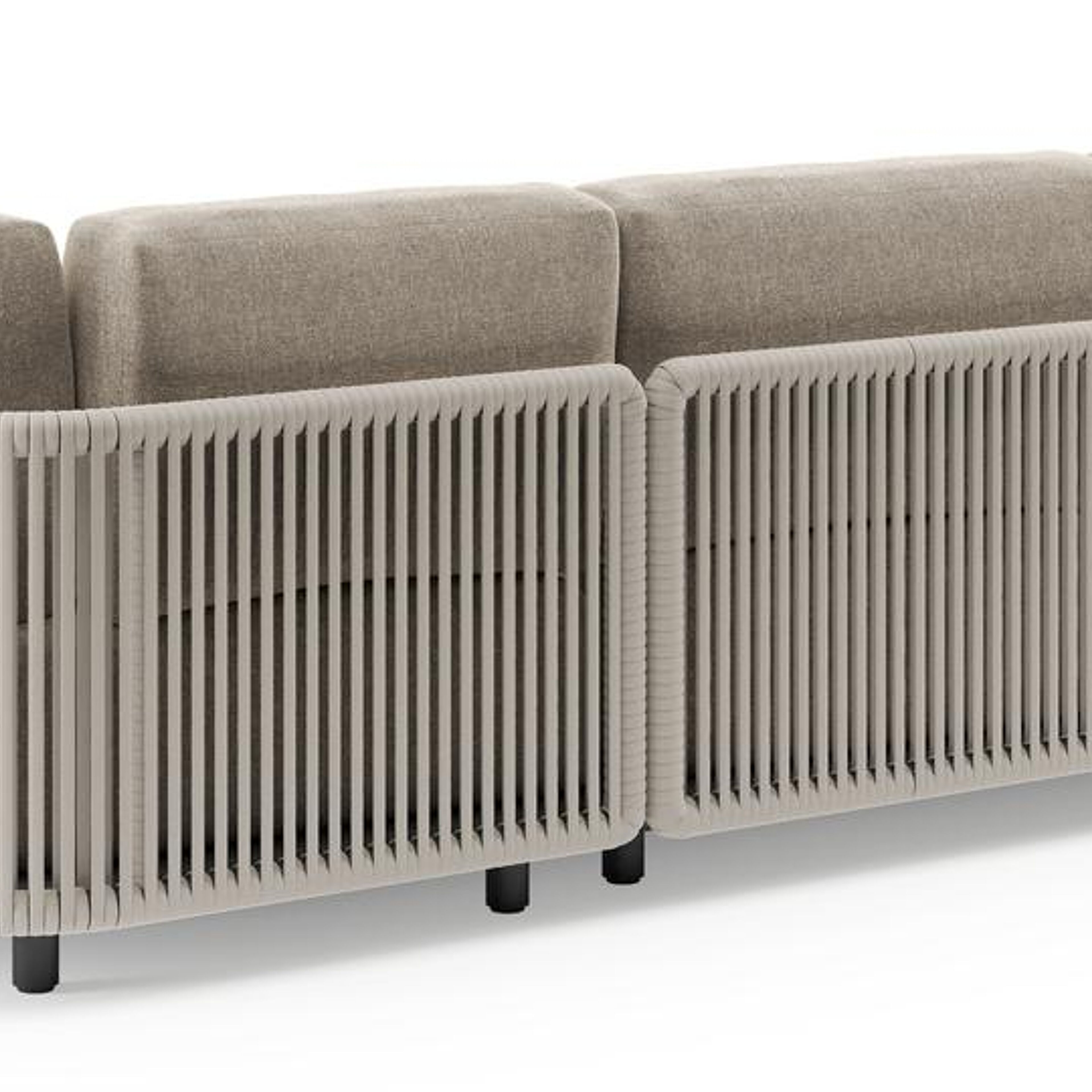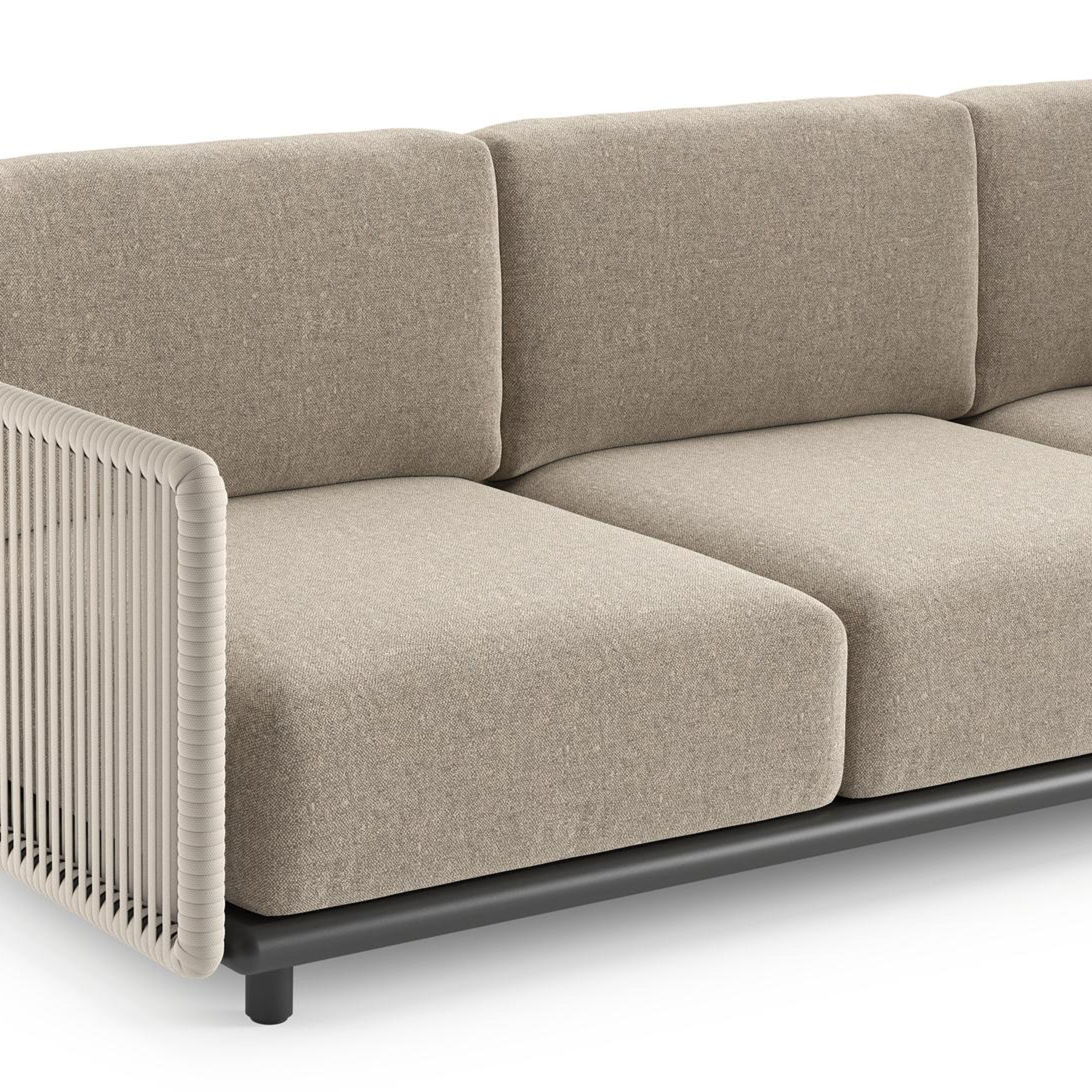 Organo loungehoek in zwart aluminium en beige verticaal geweven luxe vlakke rope met chartres pewter all weather Sunbrella® luxe kussen | Exterioo tuinmeubelen