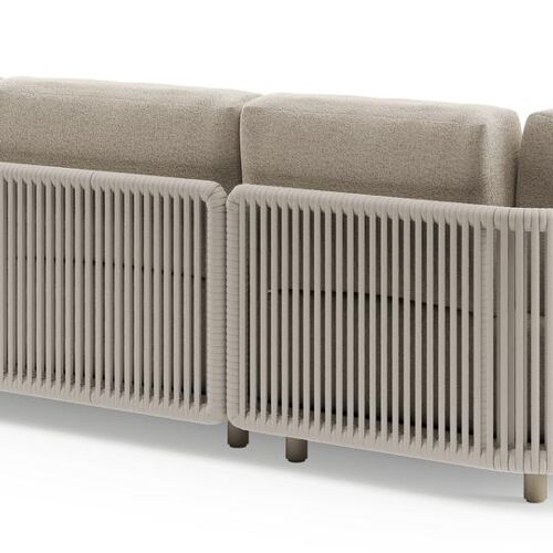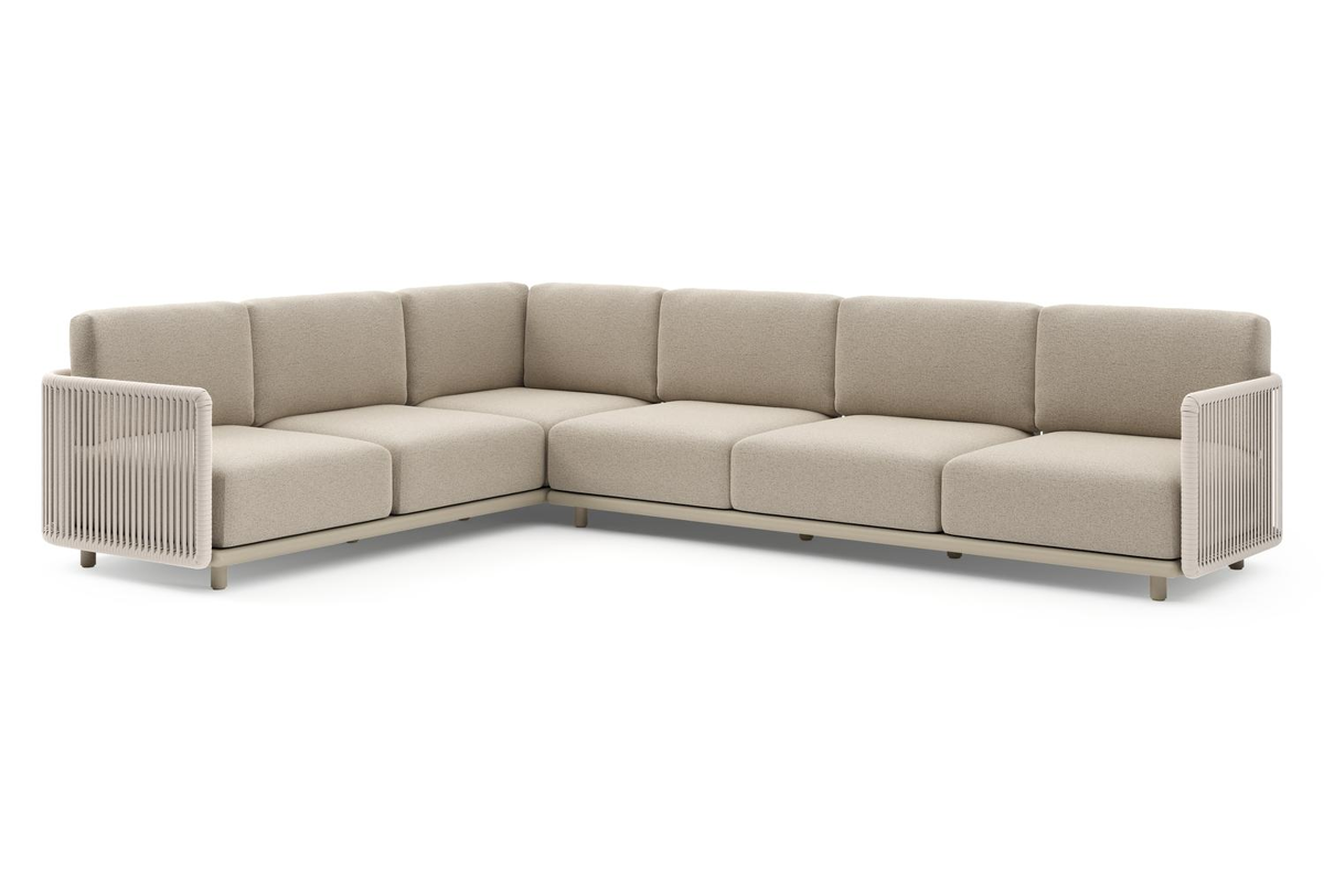 Organo loungehoek in beige aluminium en beige verticaal geweven luxe vlakke rope met marbella beige All Weather Cosytica kussens | Exterioo