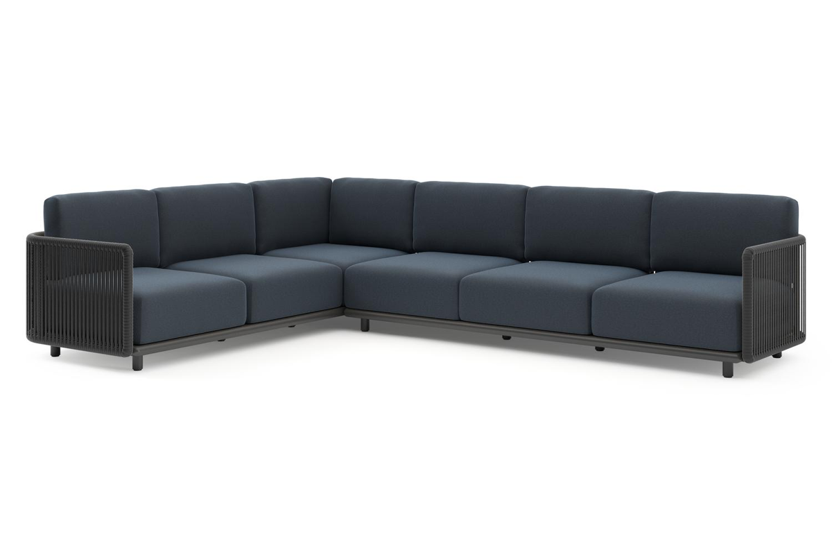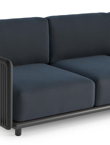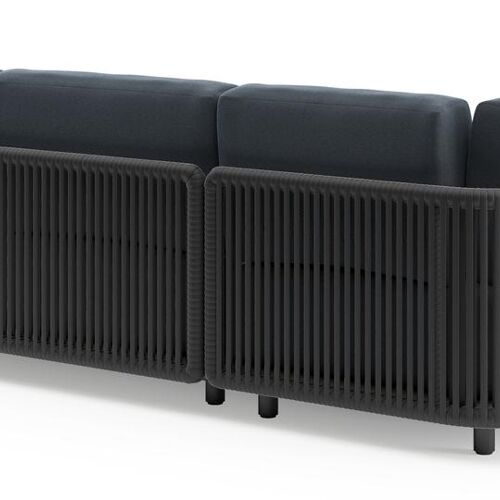 Organo loungehoek in zwart aluminium en zwart verticaal geweven luxe vlakke rope met heritage indigo all weather Sunbrella® luxe kussen | Exterioo