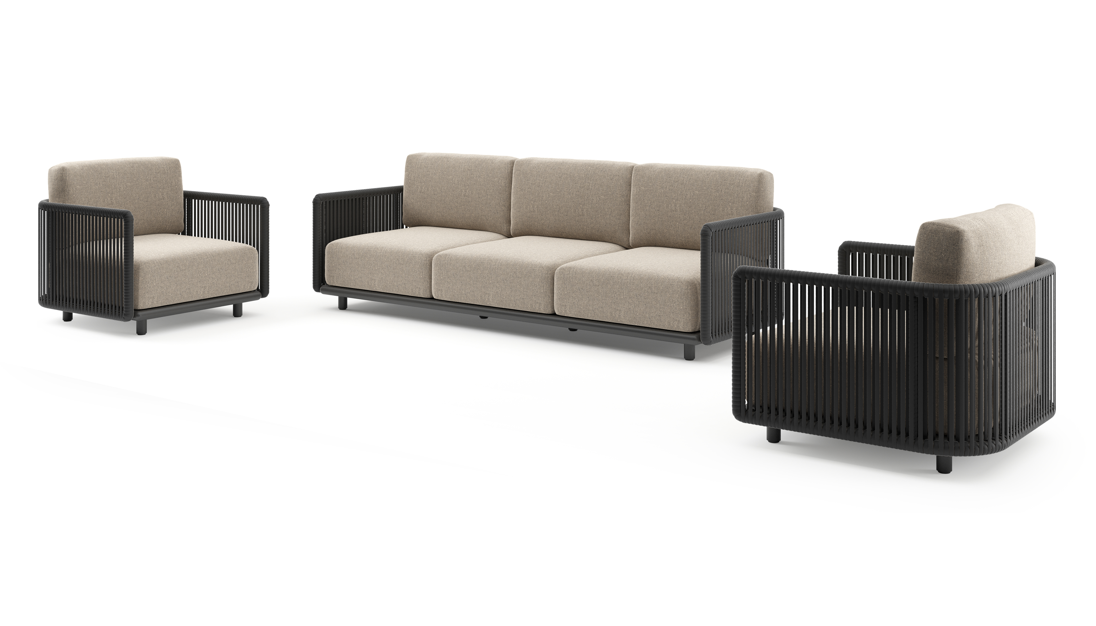 Organo loungeset in zwart aluminium en zwart verticaal geweven luxe vlakke rope met chartres pewter all weather Sunbrella® luxe kussen | Exterioo tuinmeubelen