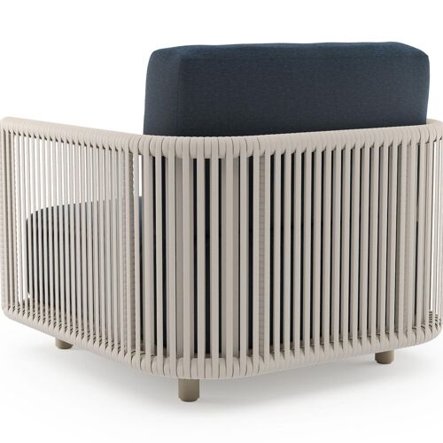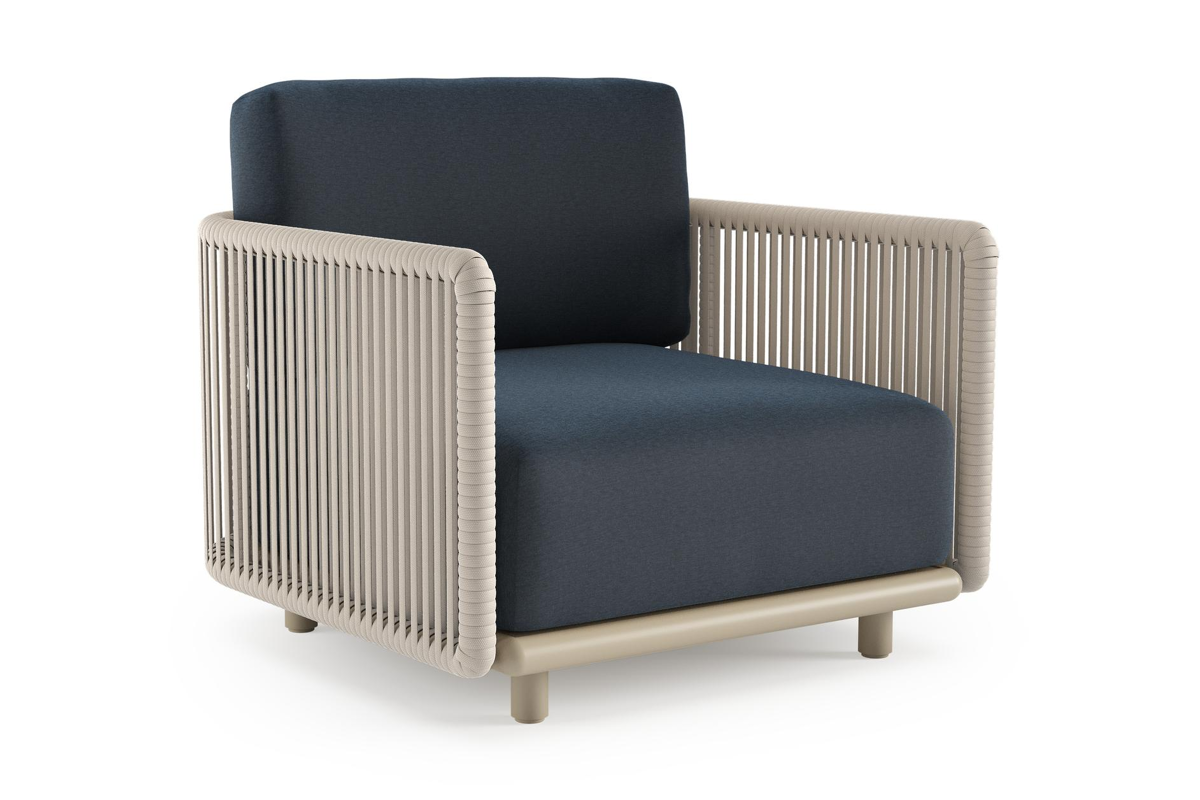 Organo loungestoel in beige aluminium en beige verticaal geweven luxe vlakke rope met heritage indigo all weather Sunbrella® luxe kussen | Exterioo