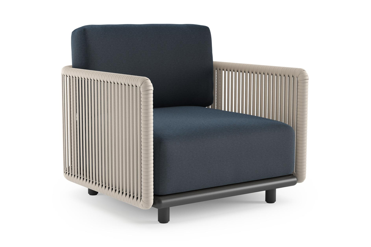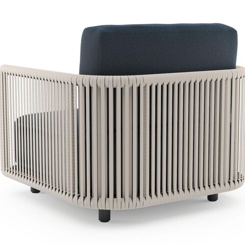 Organo loungestoel in zwart aluminium en beige verticaal geweven luxe vlakke rope met heritage indigo all weather Sunbrella® luxe kussen | Exterioo