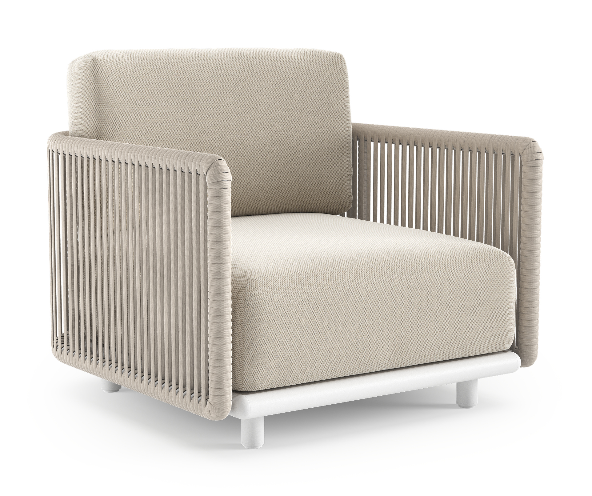 Organo loungestoel 1-zit in wit aluminium en beige verticaal geweven luxe vlakke rope met lopi marble all weather sunbrella® luxe kussen | Exterioo tuinmeubelen