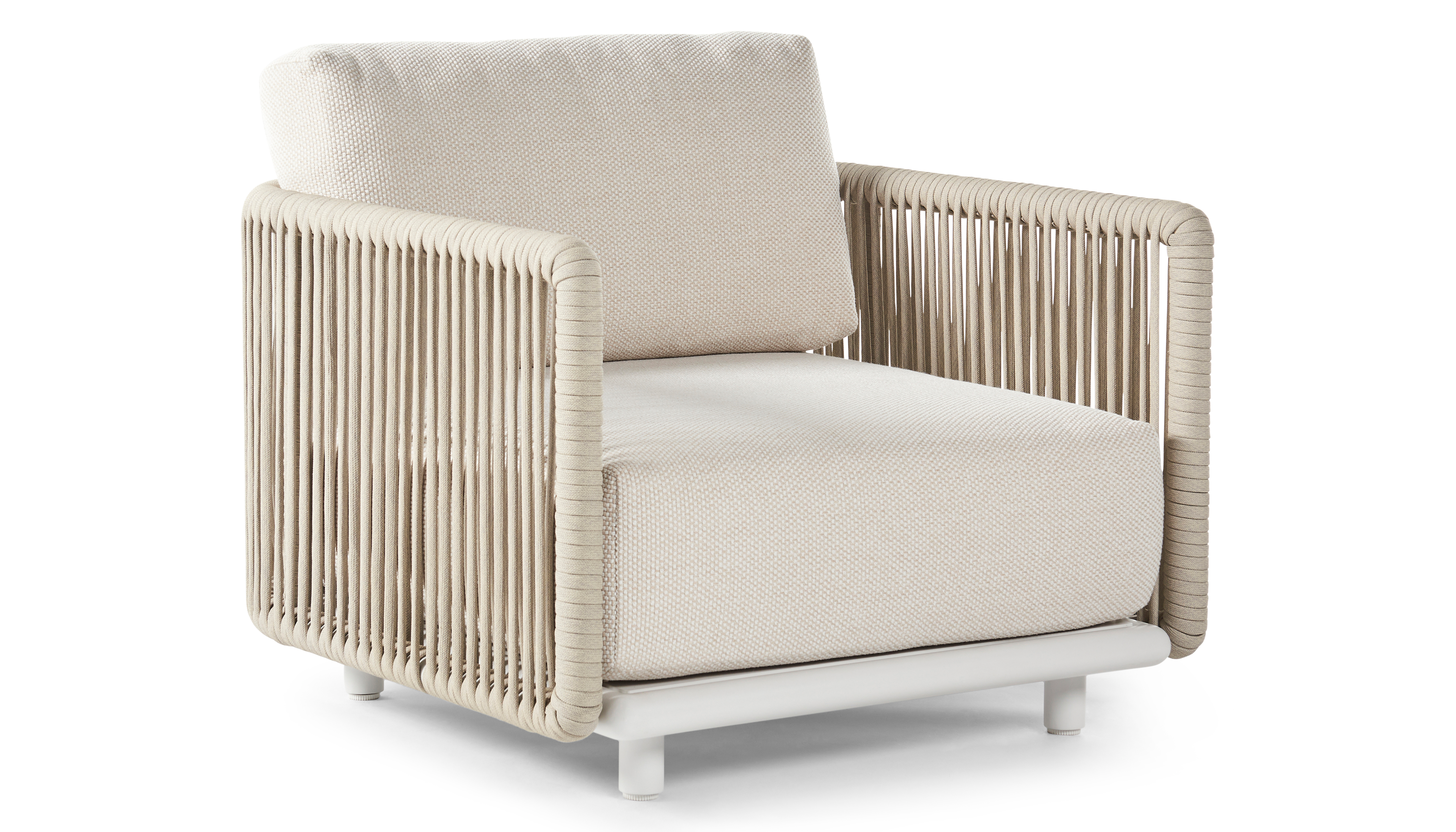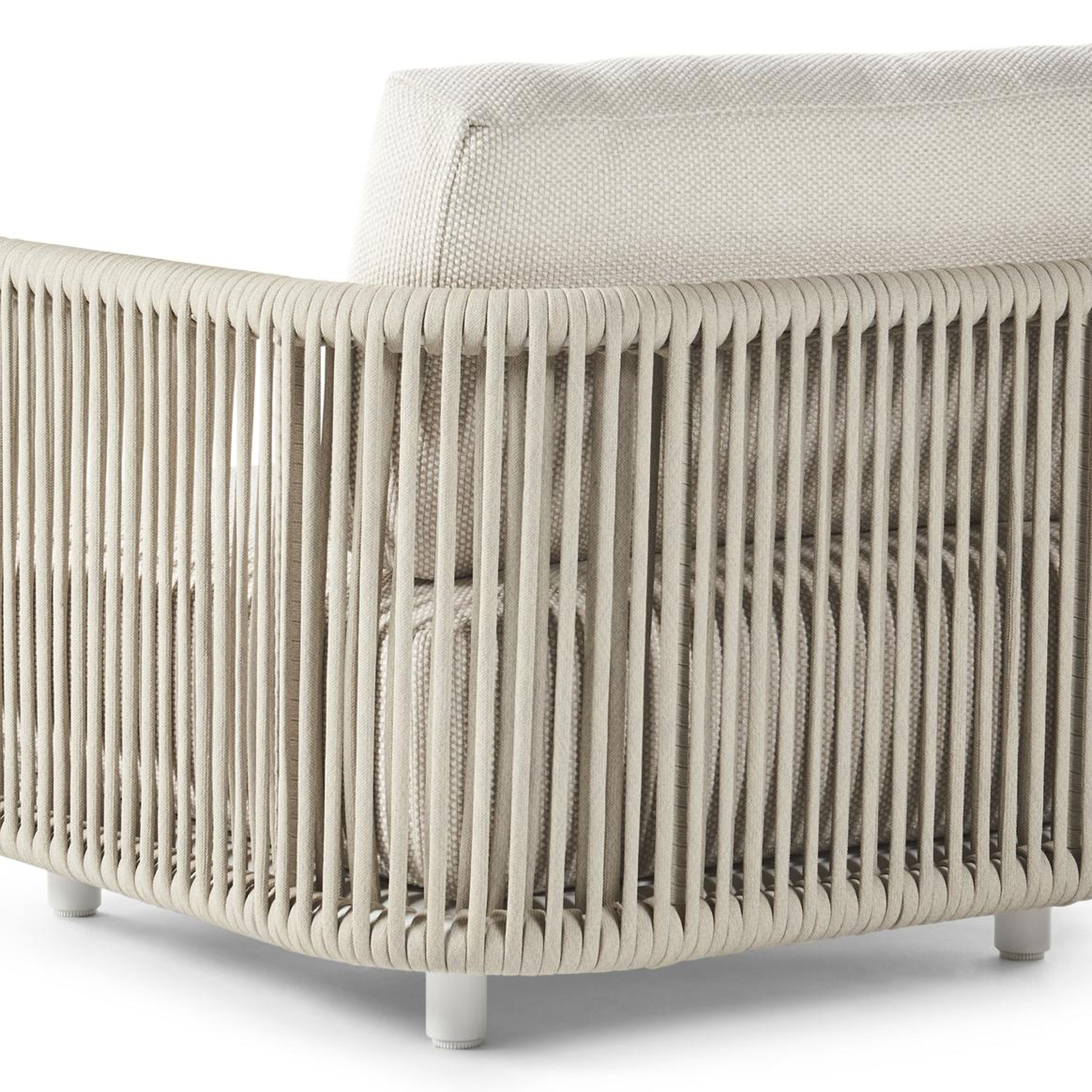 Organo loungestoel 1-zit in wit aluminium en beige verticaal geweven luxe vlakke rope met althea off white All Weather Cosytica kussen | Exterioo tuinmeubelen